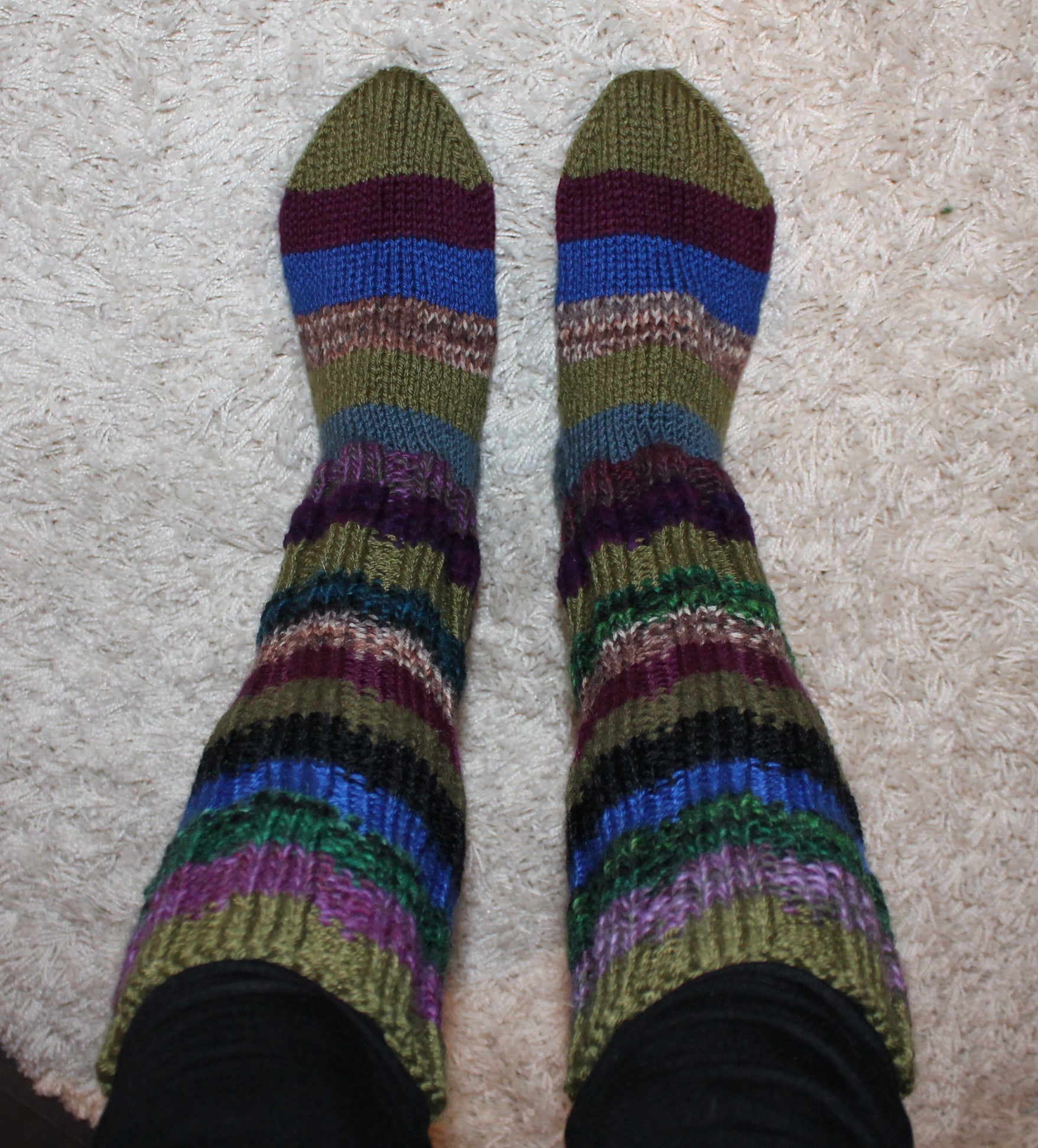 Ja tässä näyte siitä, mitä jämälangoista voi saada aikaan. Helpointa on omistaa kahdet pyöröpuikot ja tehdä molempia sukkia vuorotellen – näin pysyy kärryillä langan menekistä. Jämälangat kun tunnetusti saattavat loppua kesken ja tietenkään kyseistä lankaa ei saa ostettua mistään …