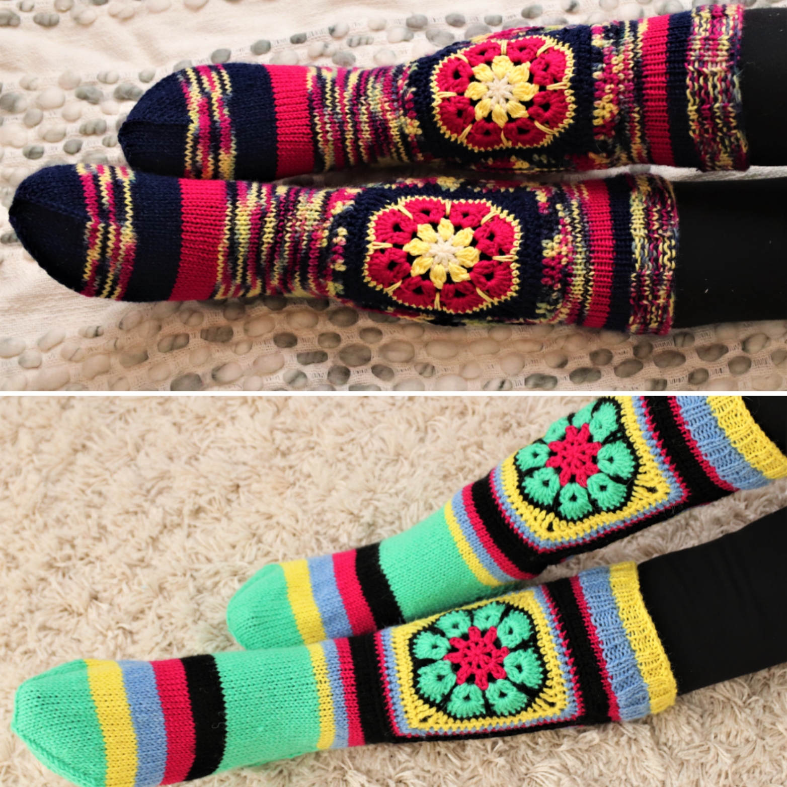 Näissä virkatuissa afrikankukkatossuissa on pohjassa käytetty sekä 5-terälehtistä että 3-terälehtistä kukkaa (pienempi kuva). 😊