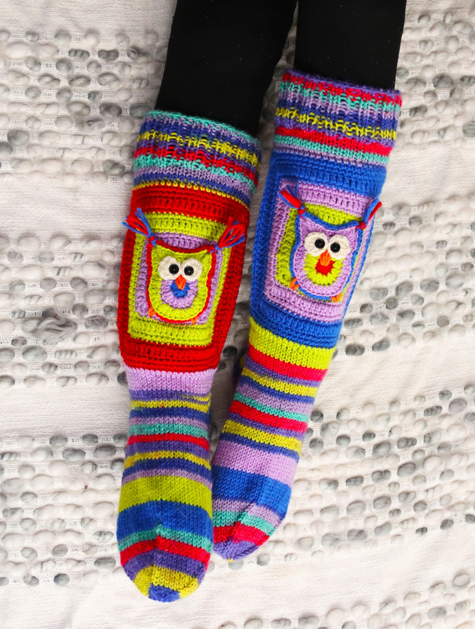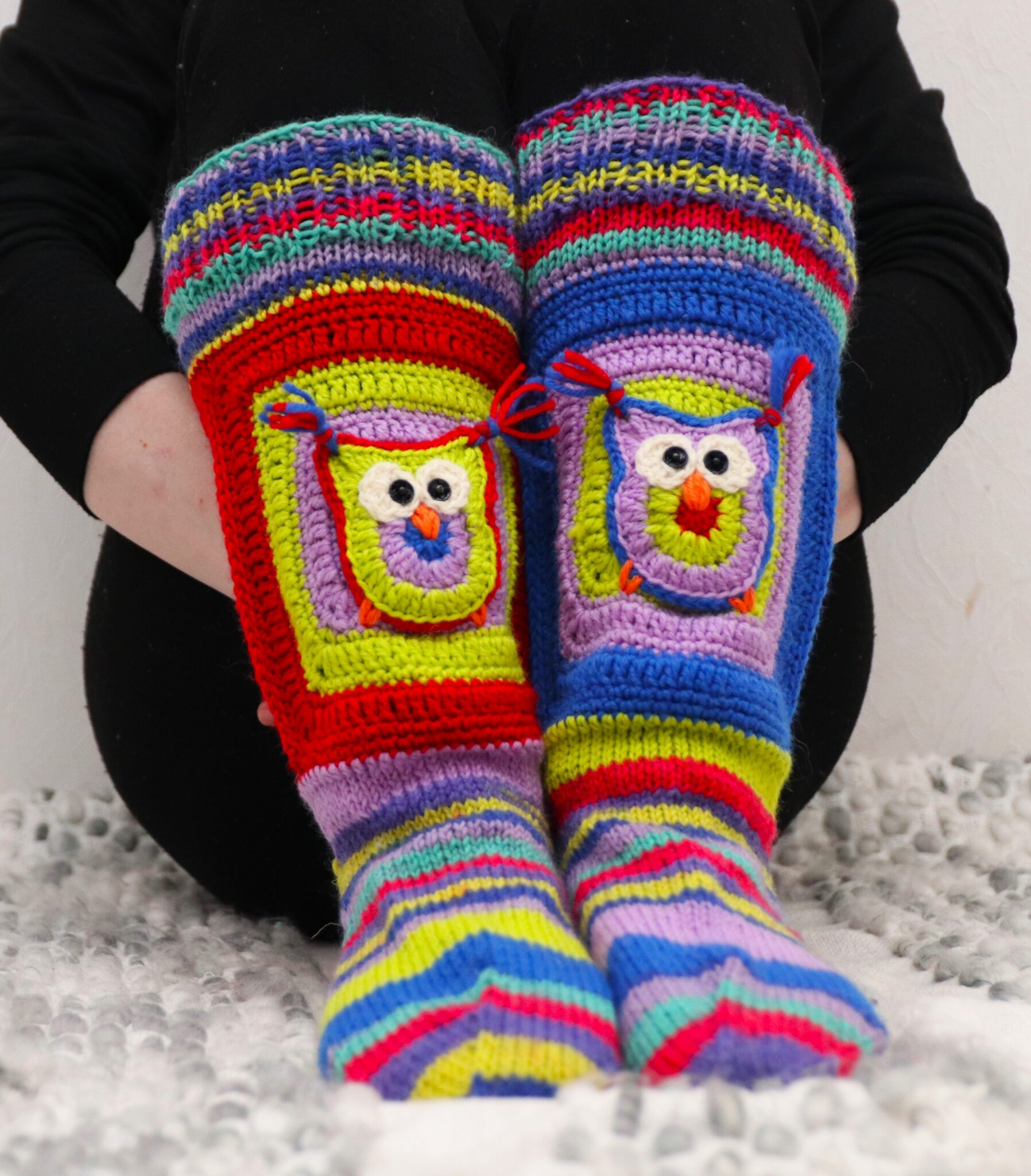 - Kumpaankin sukkaan tulee 2 tilkkua, joissa ainakin etupuolella pöllö (voit tehdä takapuolen tilkkuunkin jos haluat 😊 )