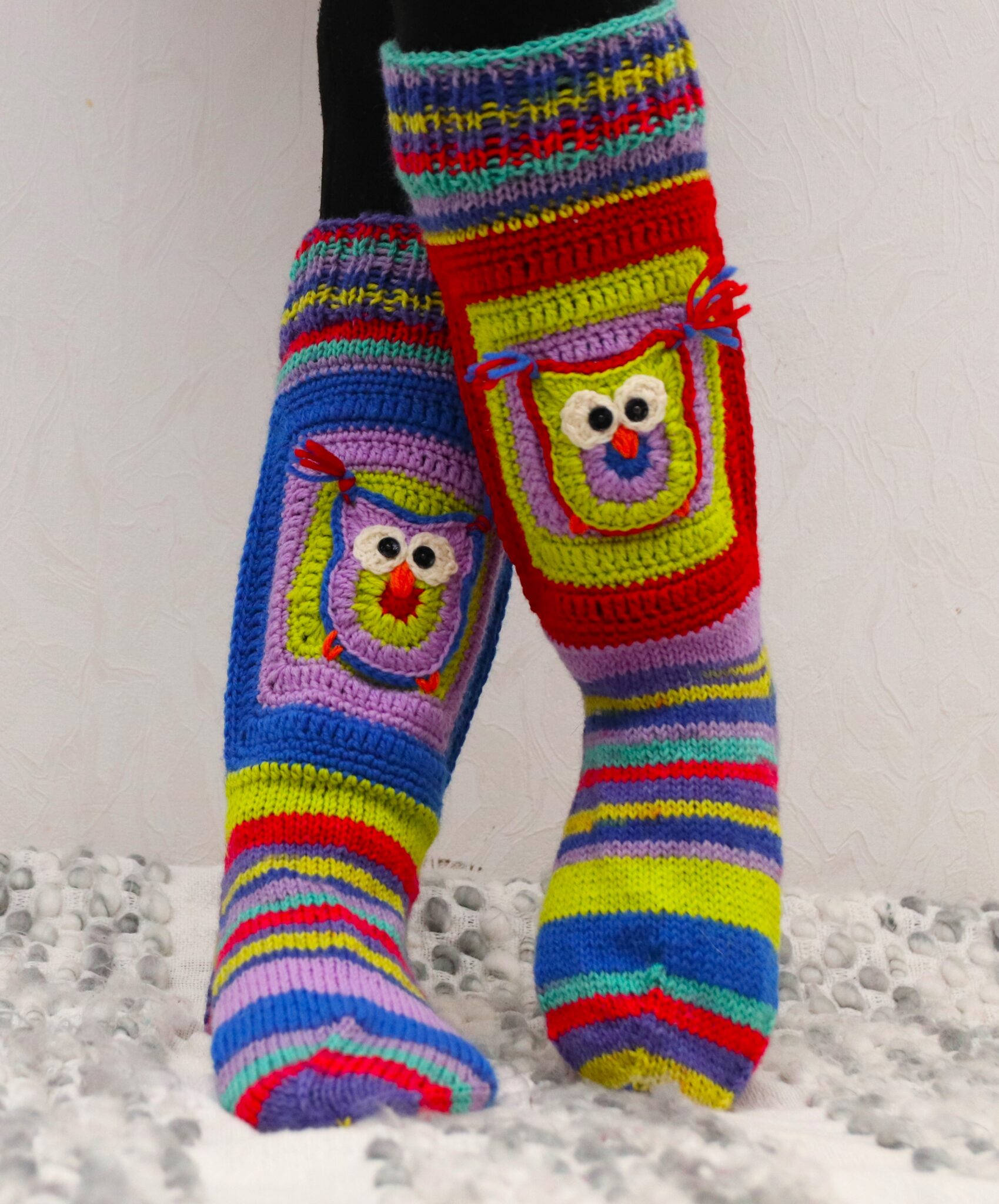 • Kumpaankin sukkaan tulee 2 tilkkua, joissa ainakin etupuolella pöllö (voit tehdä takapuolen tilkkuunkin jos haluat 😊 )