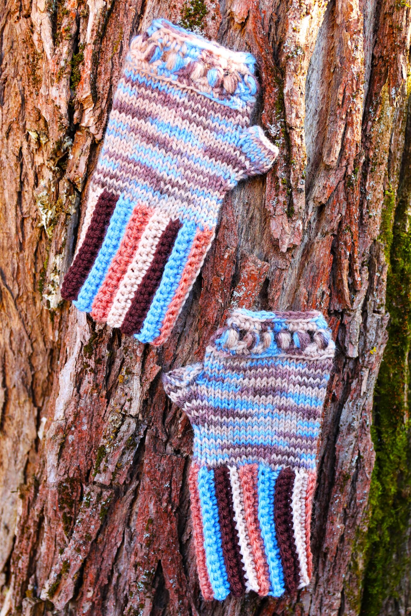 - Poimi peukalon silmukat puikoille ja ota tyhjästä sivusta kolmannelle puikolle vielä sama määrä. Jatka suljettua neuletta kunnes mielestäsi sopiva pituus. Päättele mieluummin joustavasti kuin ylivetäen, ei kiristele niin paljoa. 😊