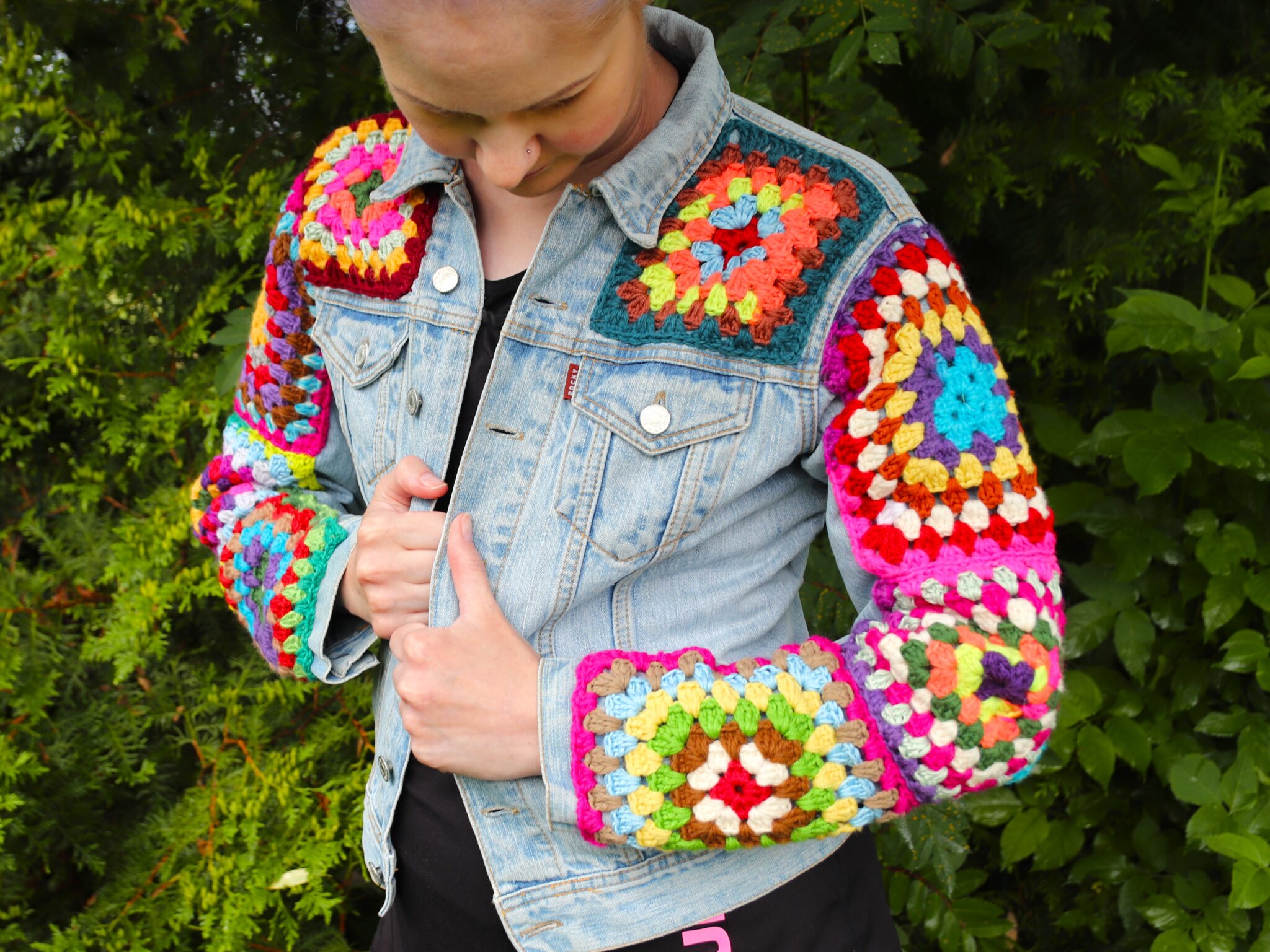 Tämä saattaa (ja varmaan onkin) jo vähän vanhempi ilmiö, mutta itse törmäsin isoäidinneliöillä tuunattuun farkkutakkiin tänä keväänä. Somevirrassa joku käsityöharrastaja kyseli moisen perään ja pakkohan se oli googlettaa. 😊 En siis ole omimassa ideaa vaan vastaavanlaisia löytää netistä vaikka hakusanalla granny square denim jacket.