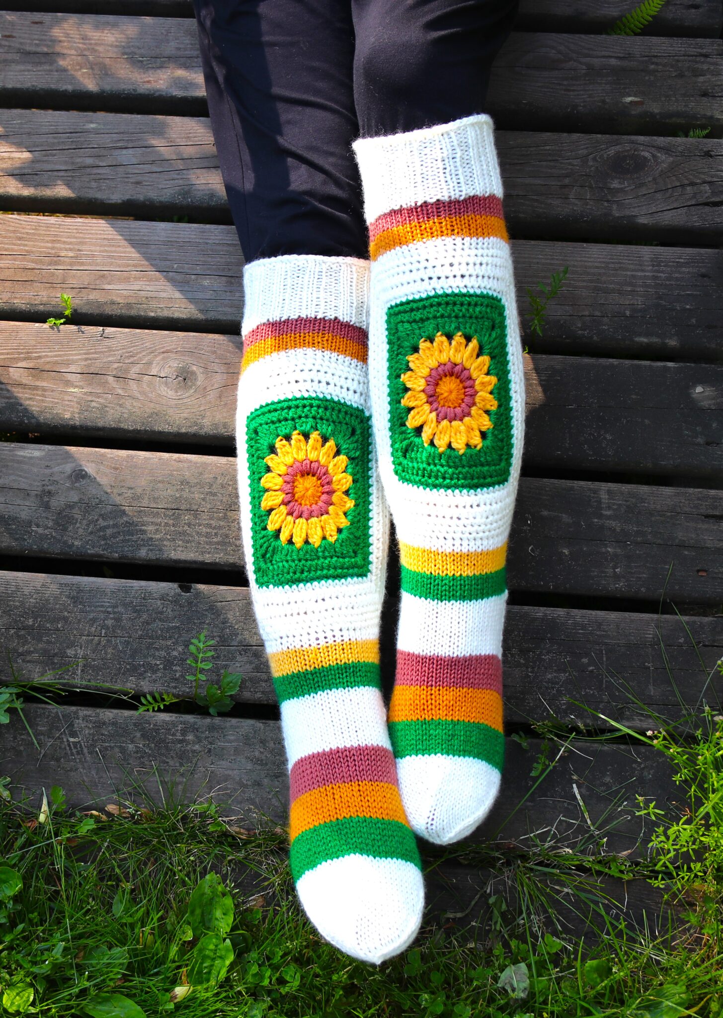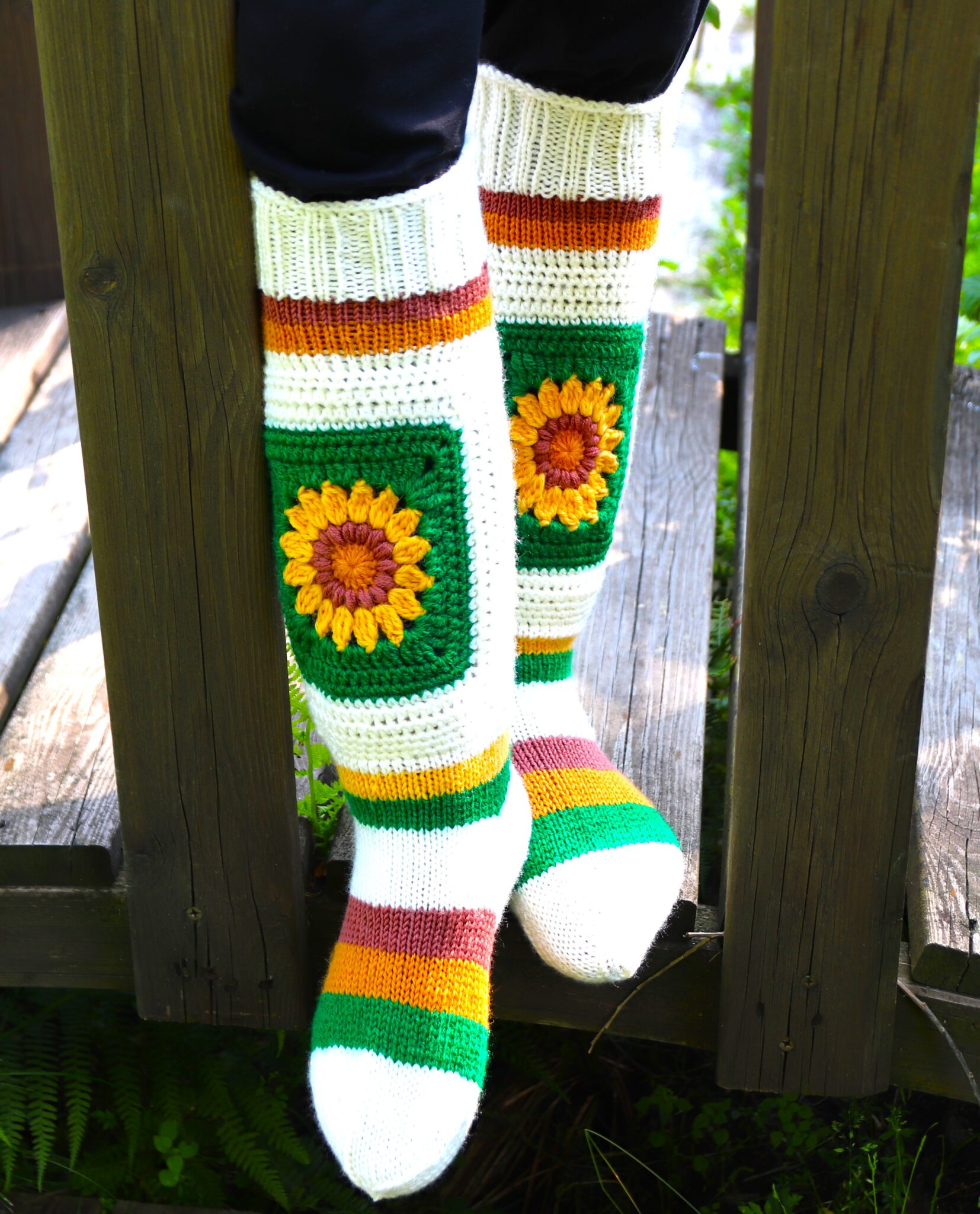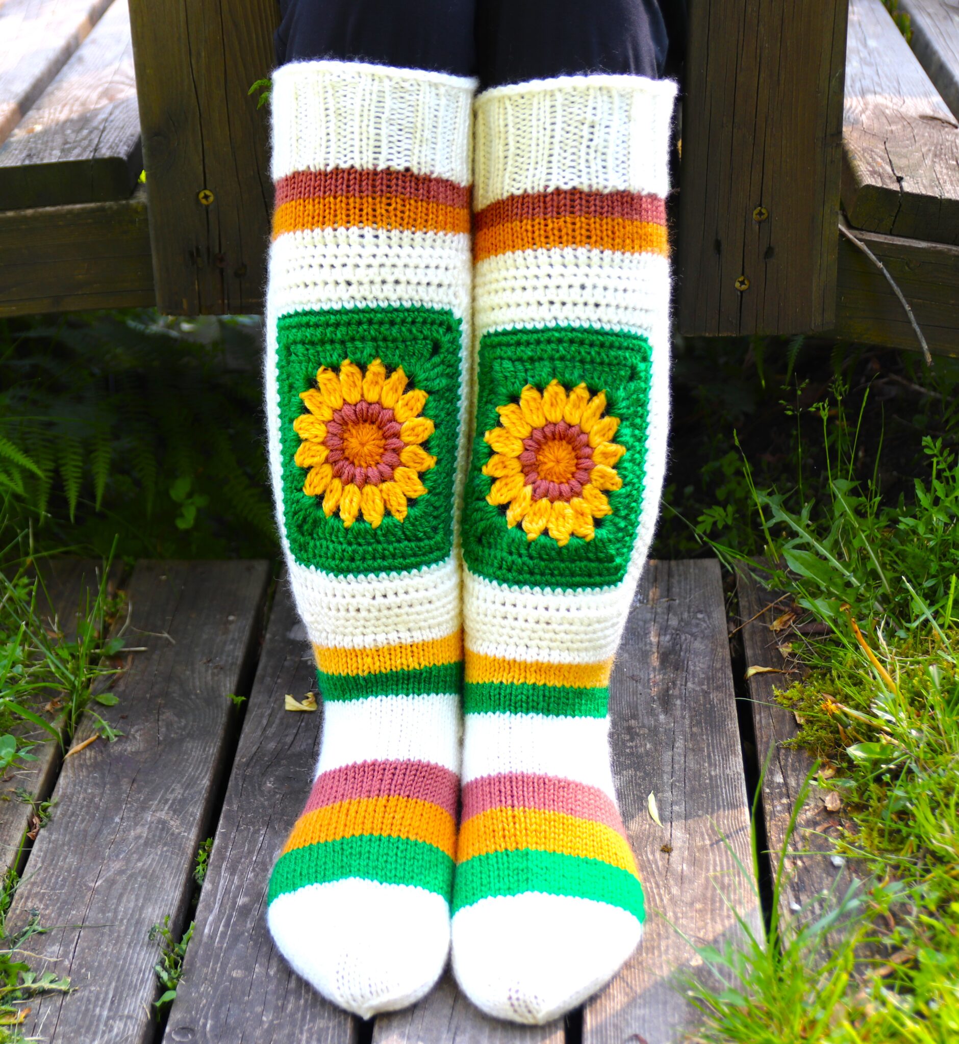 Nämä sukat jos mitkä sopivat tähän hetkeen täydellisesti! 😊 Auringonkukkien kukkimisaika on niinkun juuri NYT, ja toisaalta pikku hiljaa syksy hiipii tuoden tullessaan kylmempiä ilmoja = oiva syy käyttää kauniita villasukkia! 😊