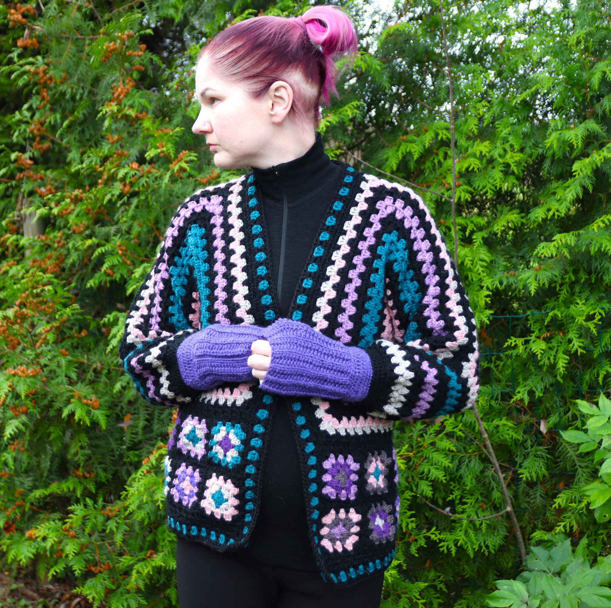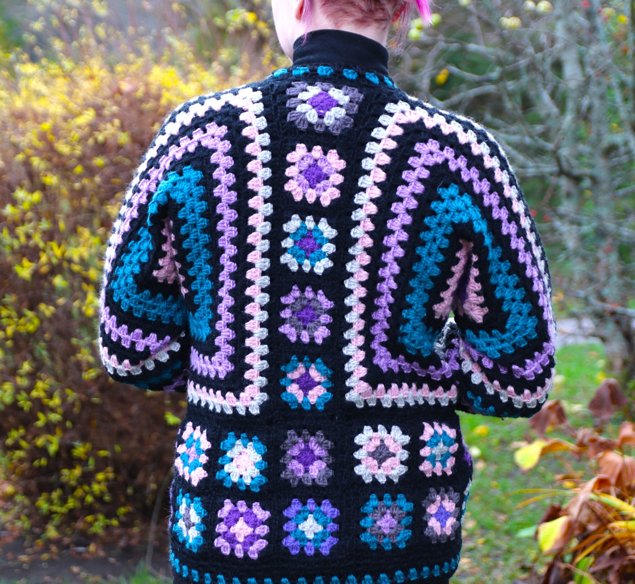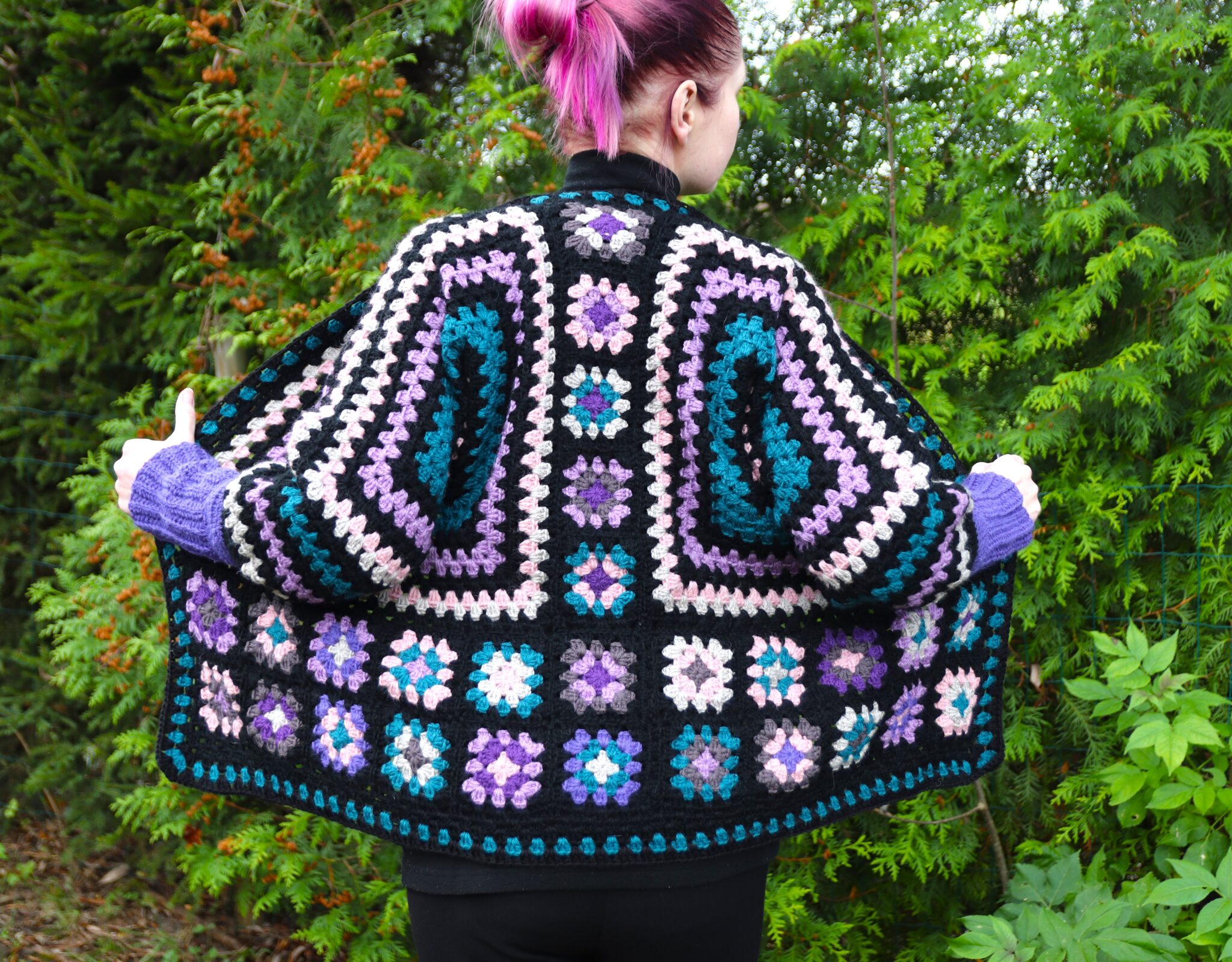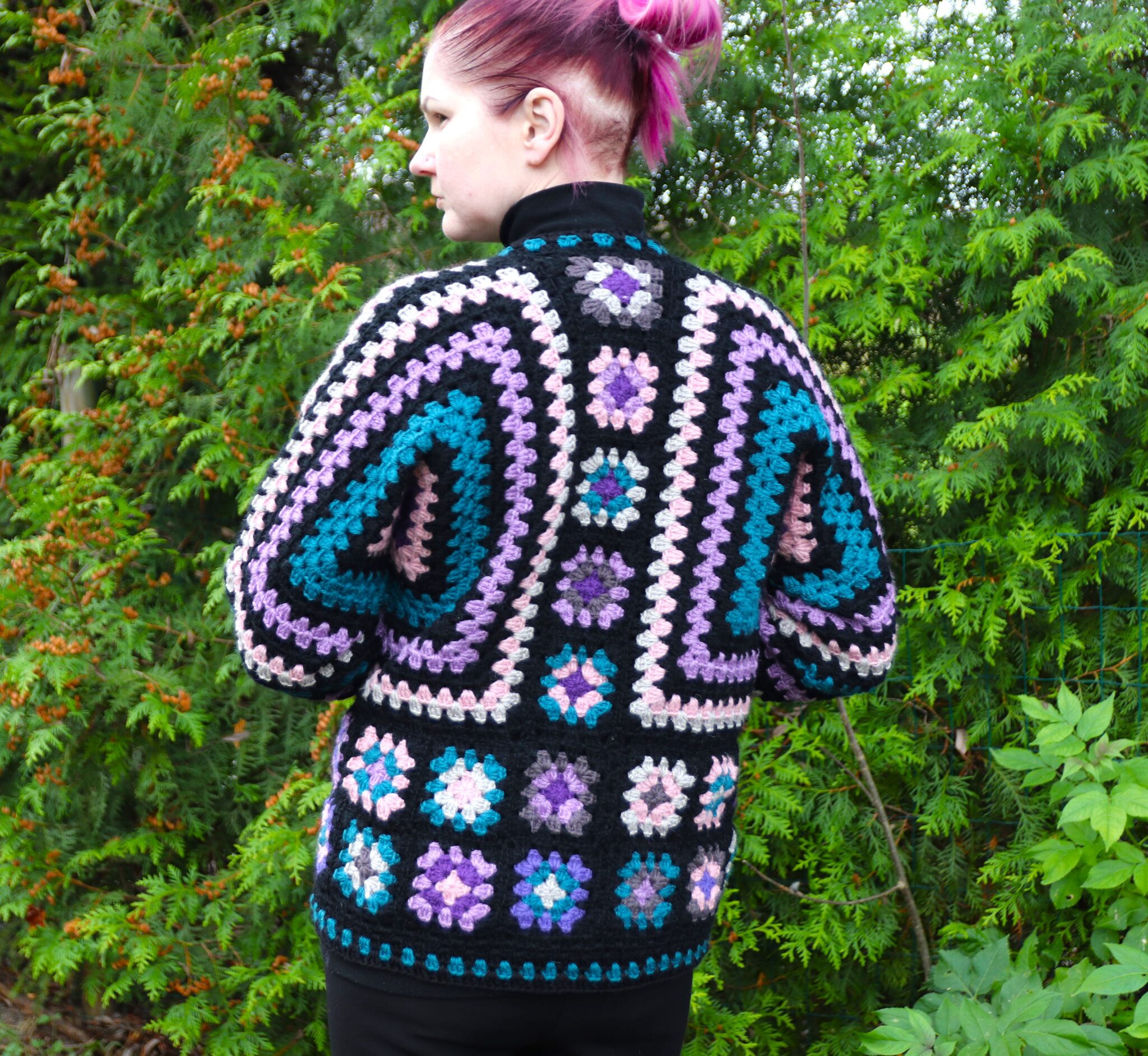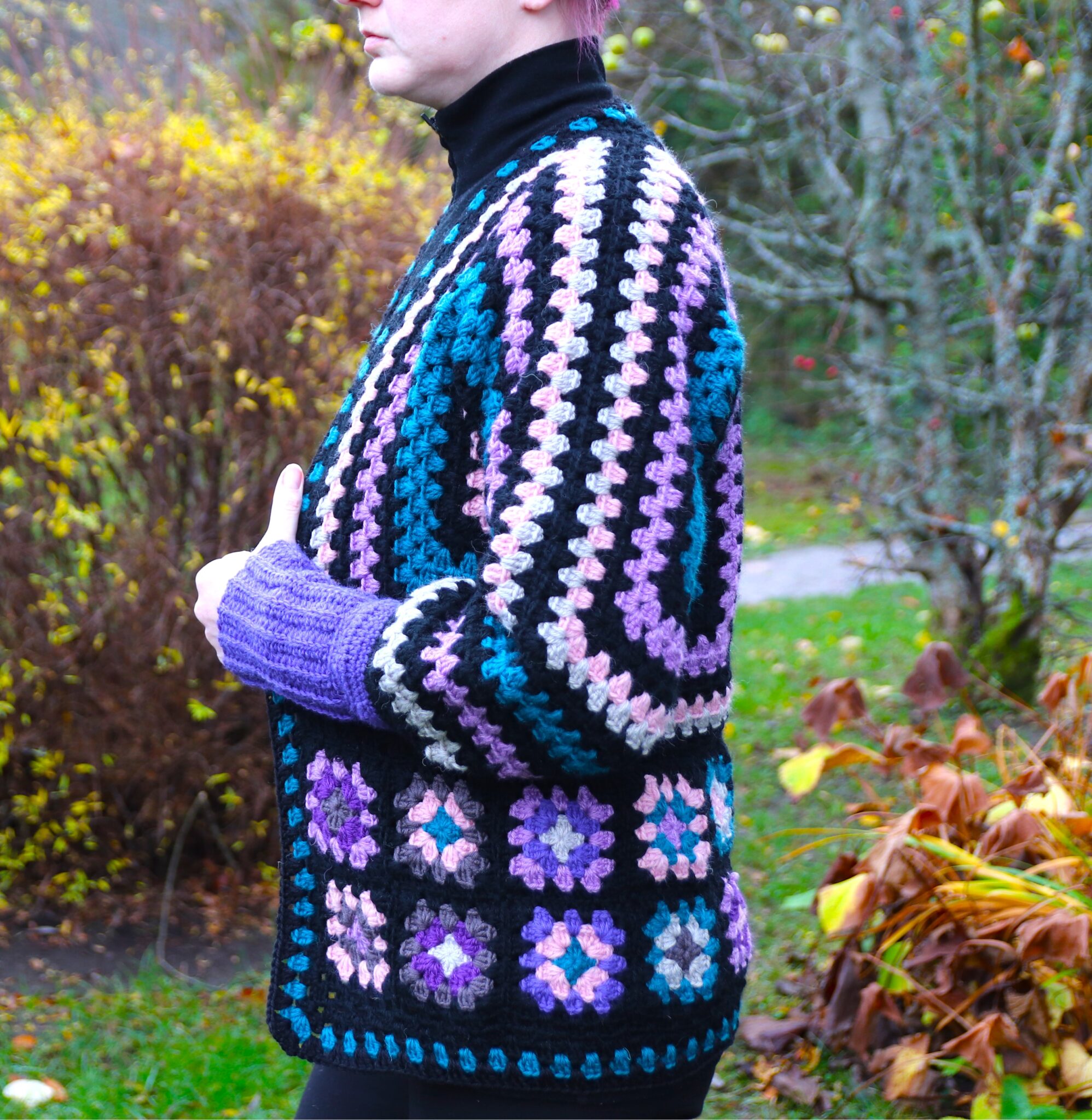 Tämän hexicardi-version ideana on ”korvata” selkäsaumojen välinen alue sekä lisäpituus isoäidinneliöillä. Ja ei, en ole tätäkään alun perin itse keksinyt enkä ajatellut siitä ottaa kunniaa. Voitte googletella lisää hakusanoilla crochet granny square hexicardi / hexagon cardigan.