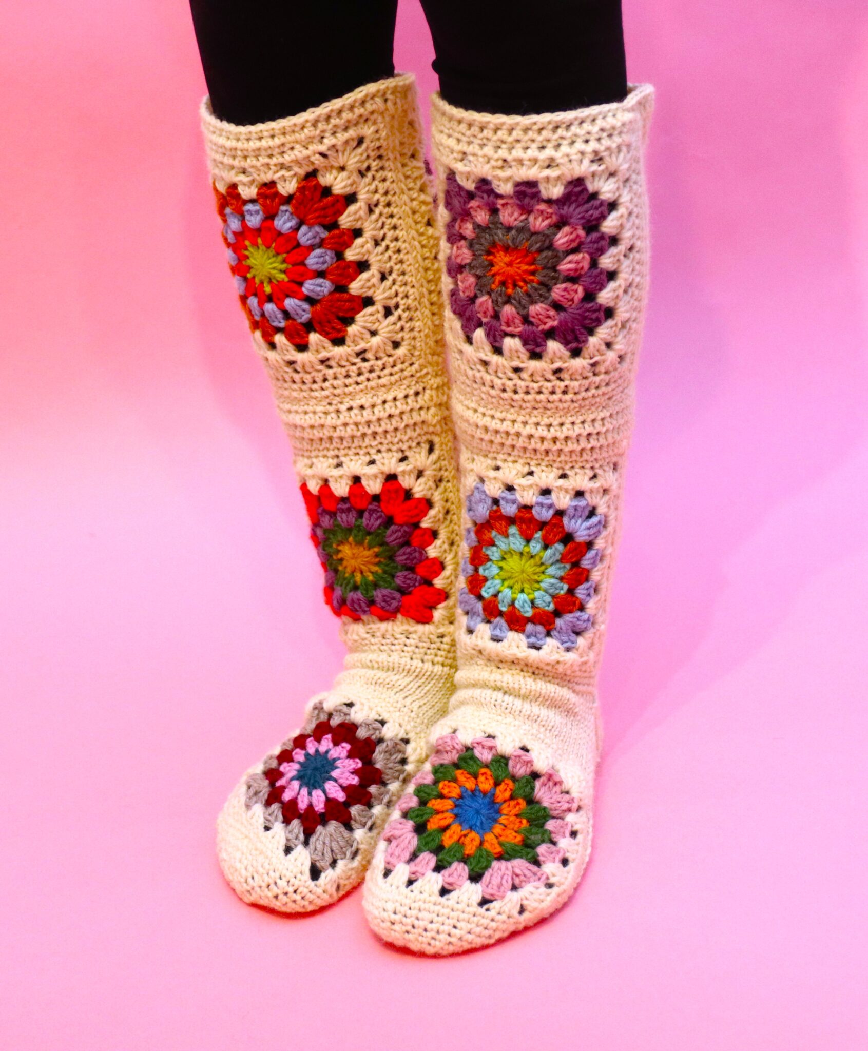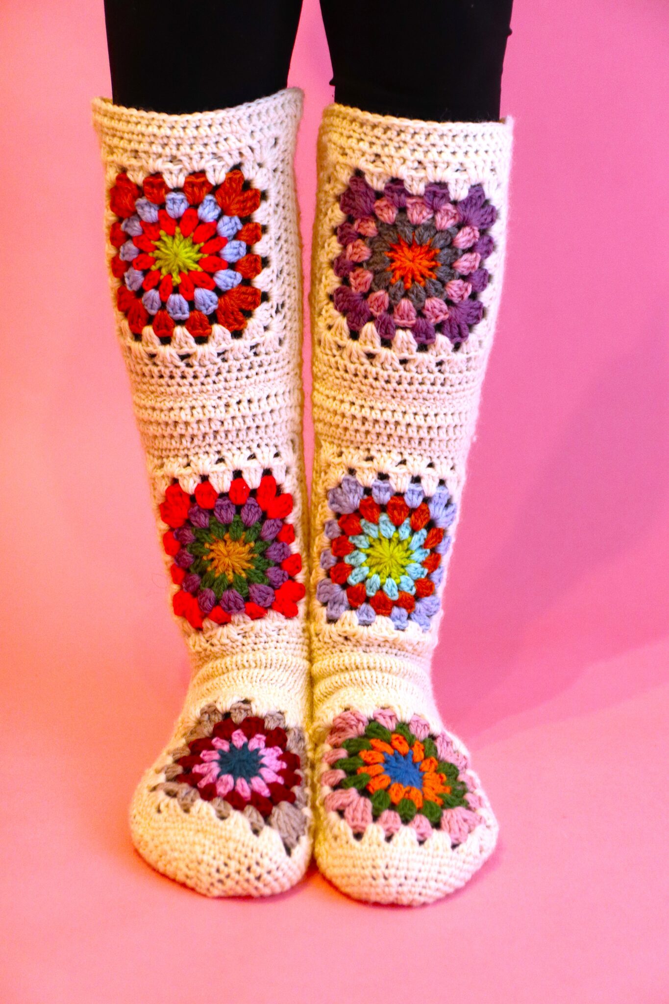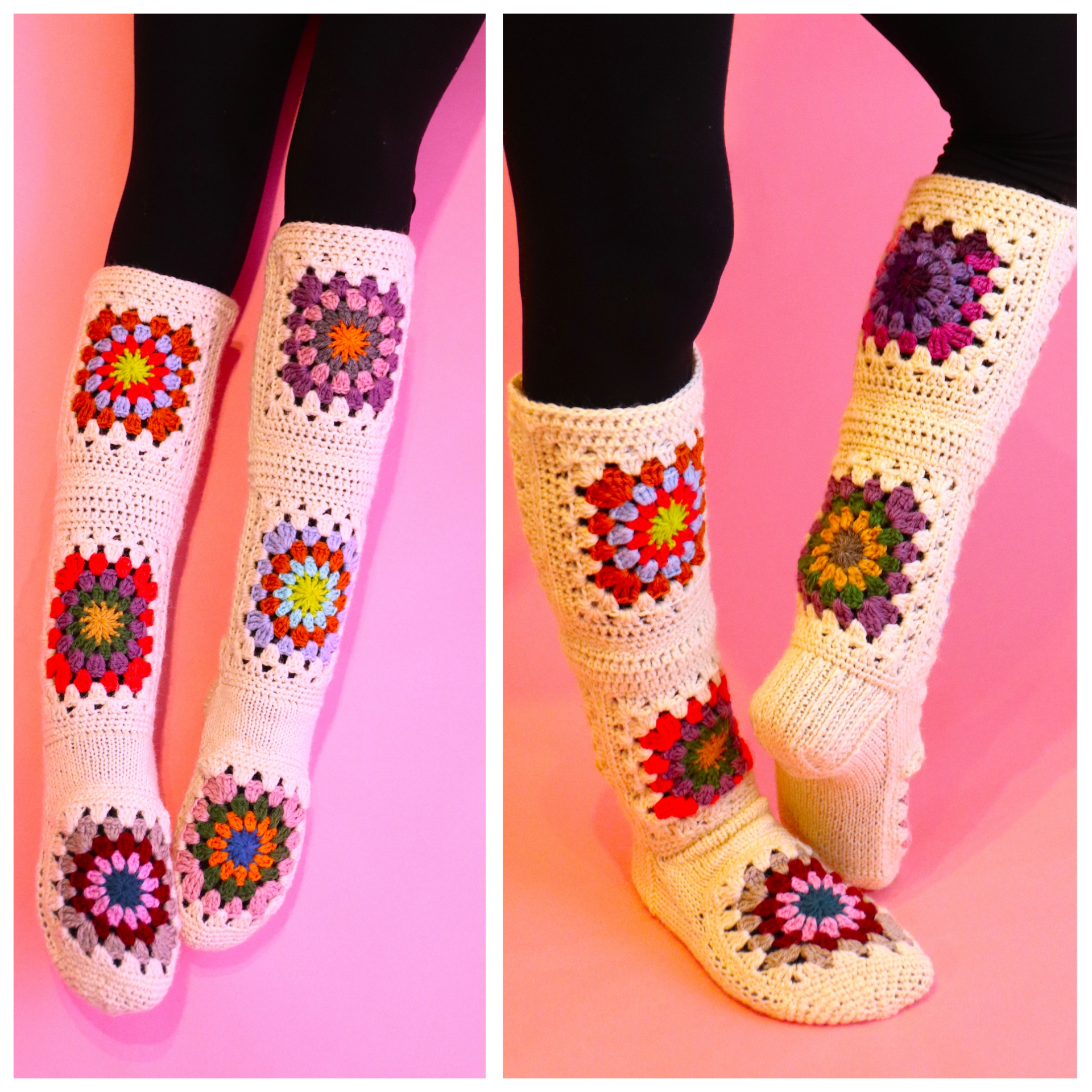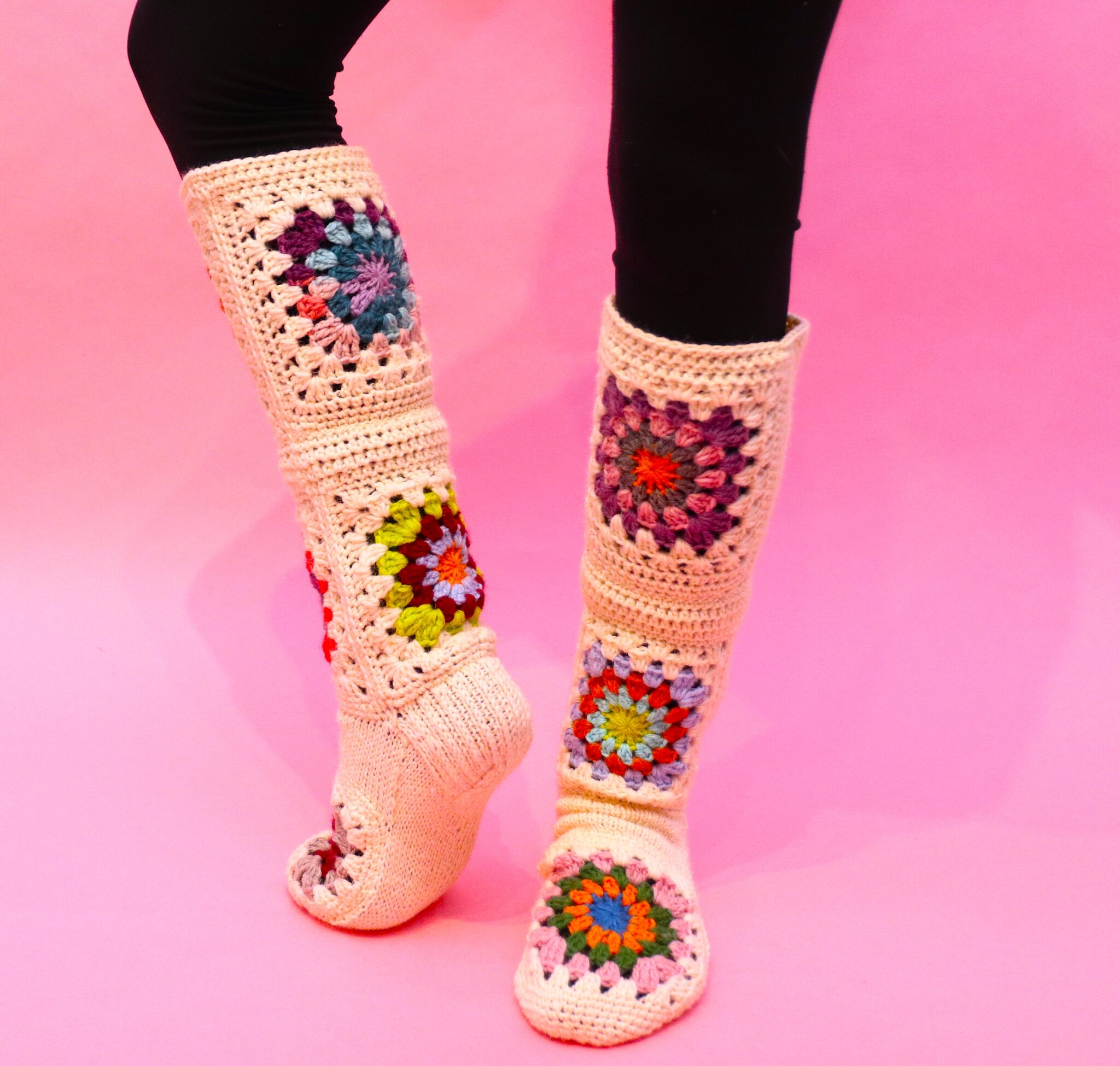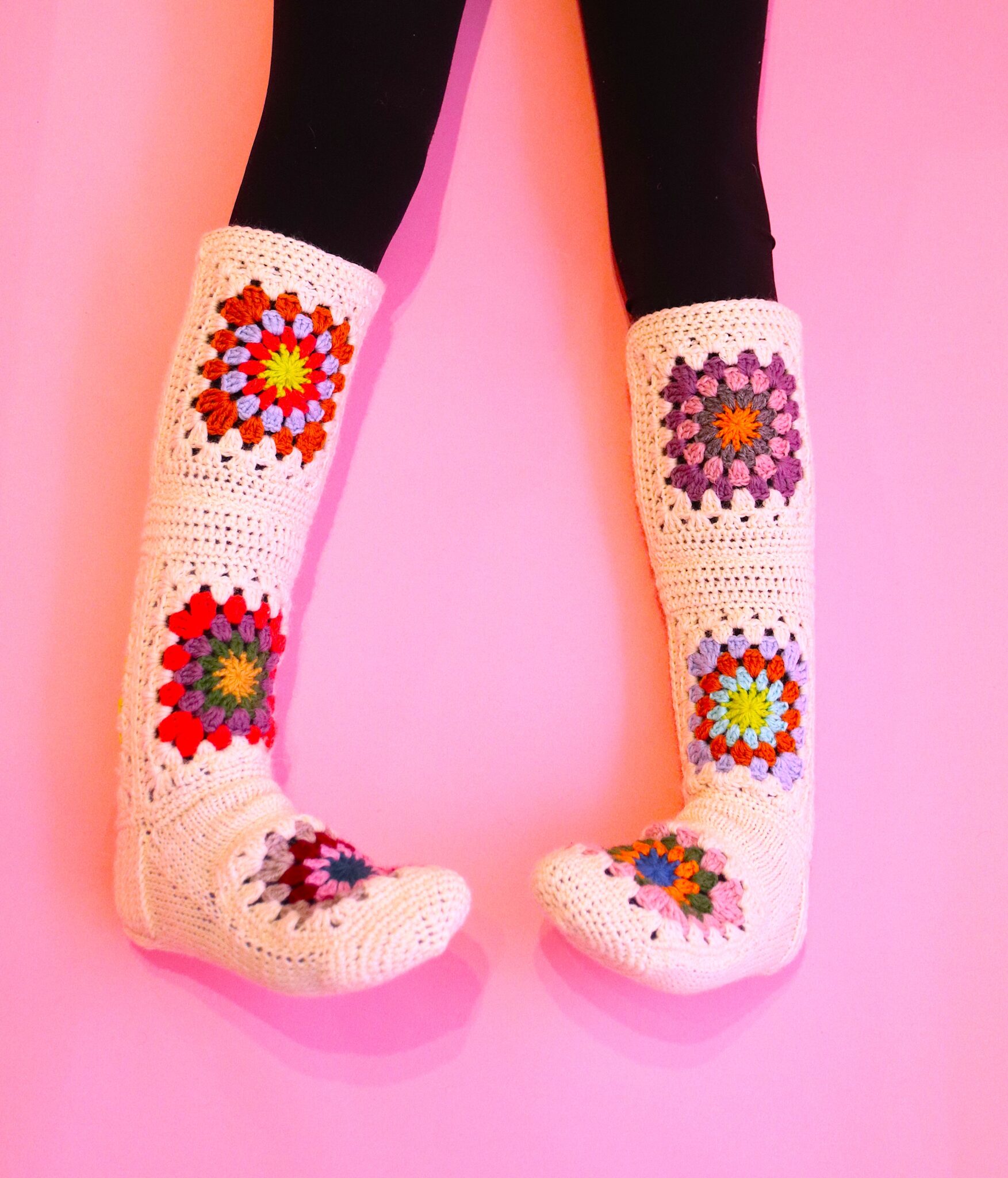 Siinäpä erikoinen väliotsikko ja jotenkin ihan päinvastoin mitä normaalisti sukkaohjeessa… 😊 Mutta tällä mennään! Mallisukissa on siis tuon nilkan kohdan tilkun yläpuolelle (etu- ja takapuolelle) virkattu vielä tilkut, ja niiden väliin 3 puolipylväskerrosta ja yksi kiinteiden silmukoiden kerros. Nämä ovat makuasioita, ei ole pakko virkata mitään välikerroksia, tai edes jatkaa sukkaa ylöspäin pidemmälle jos ei halua. 😊 Yleensä pohkeen kohta on vähän leveämpi, joten jos päädyt jatkamaan vartta ylöspäin (eli lisää tilkkuja) niin noiden välikerrosten kohdalla on helpompi vähän lisäillä silmukoita ja näin kasvattaa tarvittavaa leveyttä. Muuten homma on ihan tekijänsä hallussa eli aivan kuten juuri sinä haluat. 😊 Voit ommella tilkut kiinni toisiinsa ja kaikkiin saumakohtiin joko oikealta tai nurjalta puolelta.