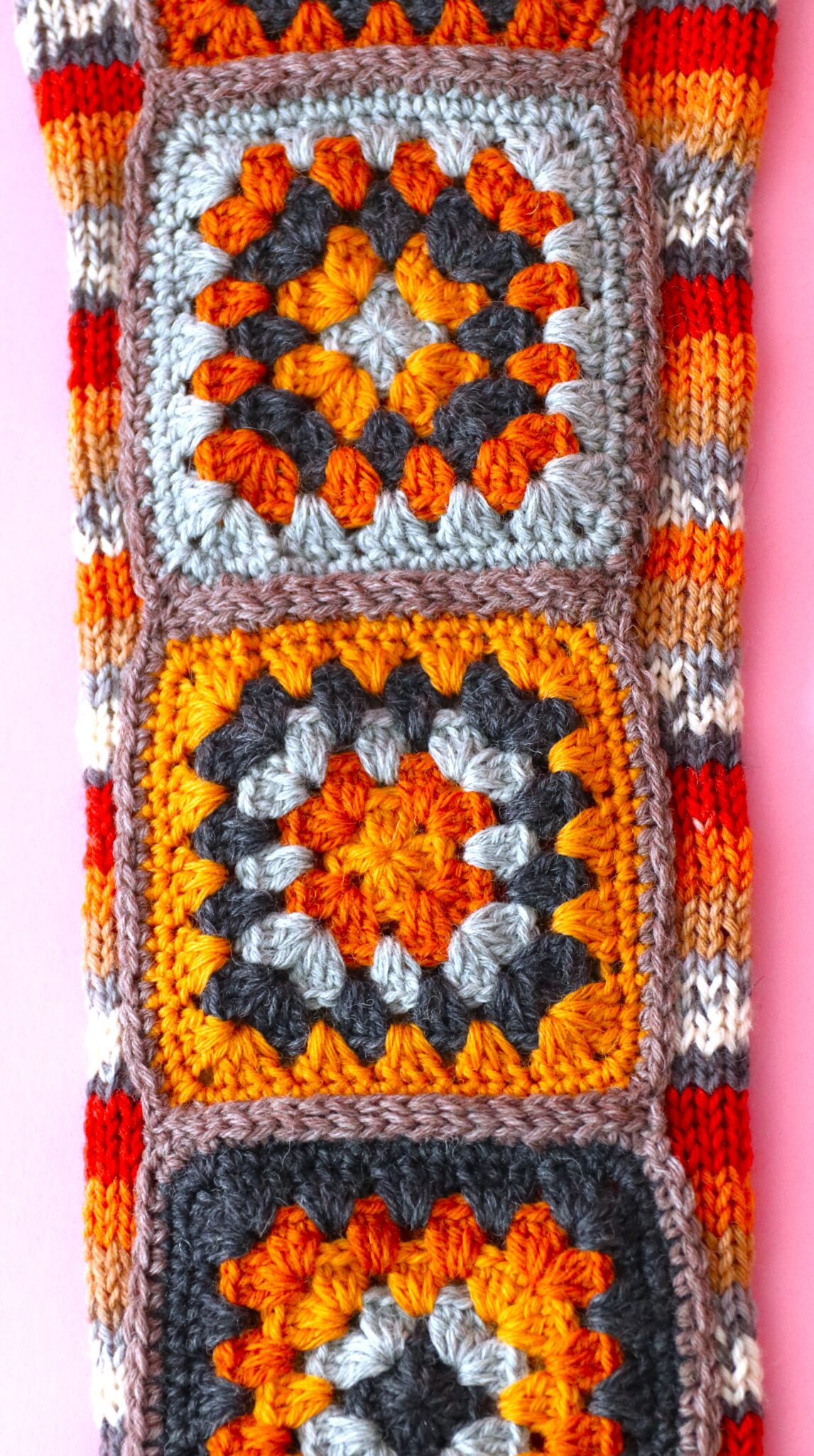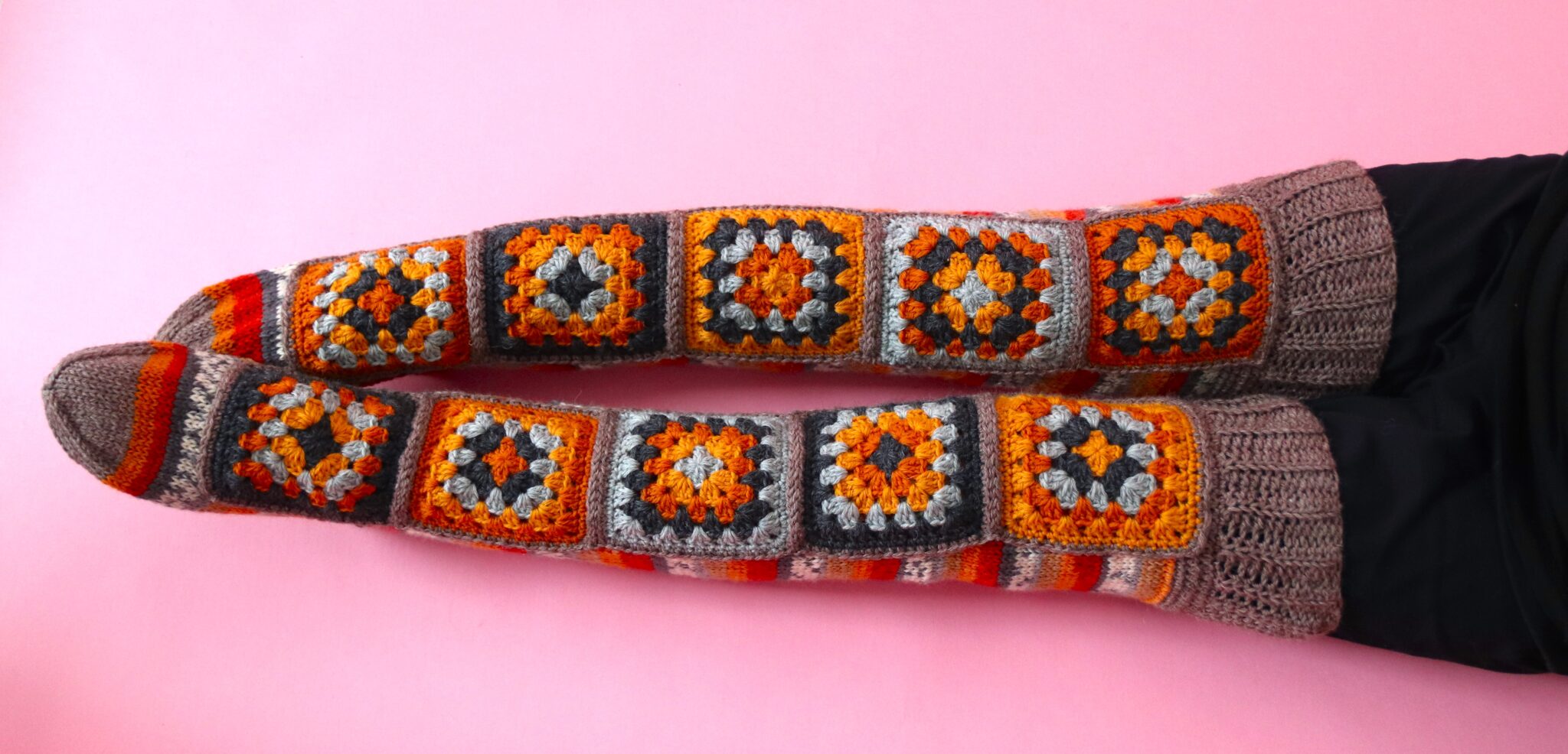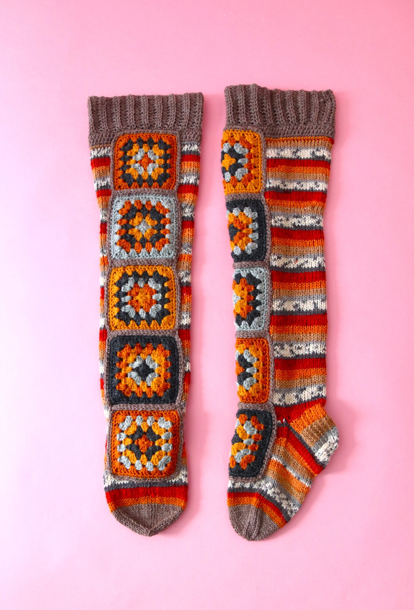 Sitten yksi päivä vaan napsahti (silleen hyvällä tavalla 😊), että niinpä; ensin neulotaan jumalattoman pitkät sukat, reilusti yli polvien. Neulotaan niin kuin sukat neulotaan. Ja sitten, ladys and gentlemans – siihen päälle ommellaan oma erillinen rivistönsä näitä virkattuja neliöitä! Ei se ollutkaan ydinfysiikkaa! 😊 Siitä osuvasti aasinsillalla toki kerron, ettei tämä siis ole alun perin oma ideani. Tsekatkaa Instagramista vaikka sellainen tili kuin @ivettykcraft. Omg miten inspiroivia juttuja! Ja kun tarkemmin katsoo esim hänen toteutuksiaan niin osassa on kyllä yhdistetty taitavasti virkkausta ja neulontaa, eikä ”oikaistu” kuten minä tässä ohjeessa. Mutta mitä väliä, kivat tuli! 😊