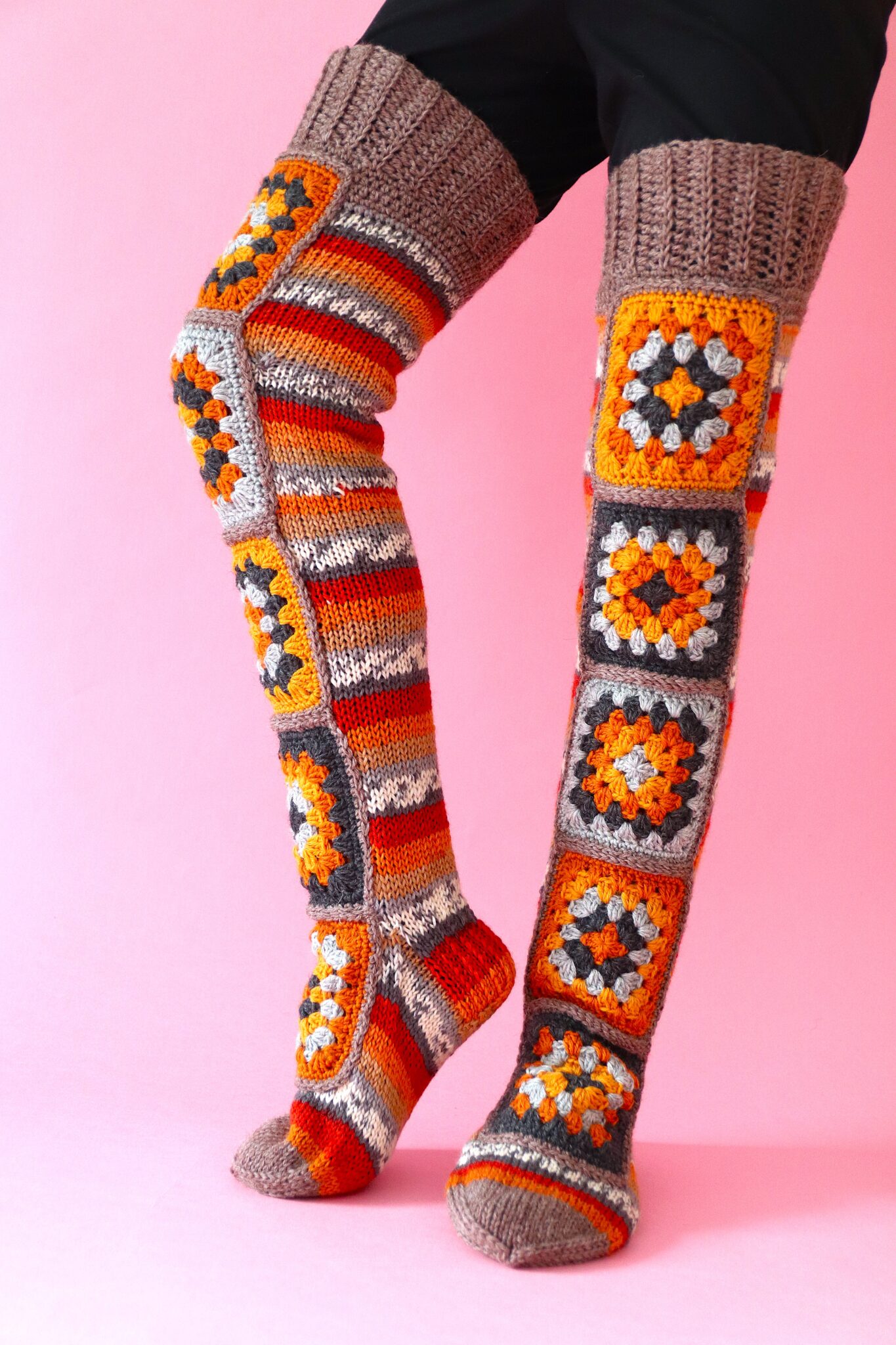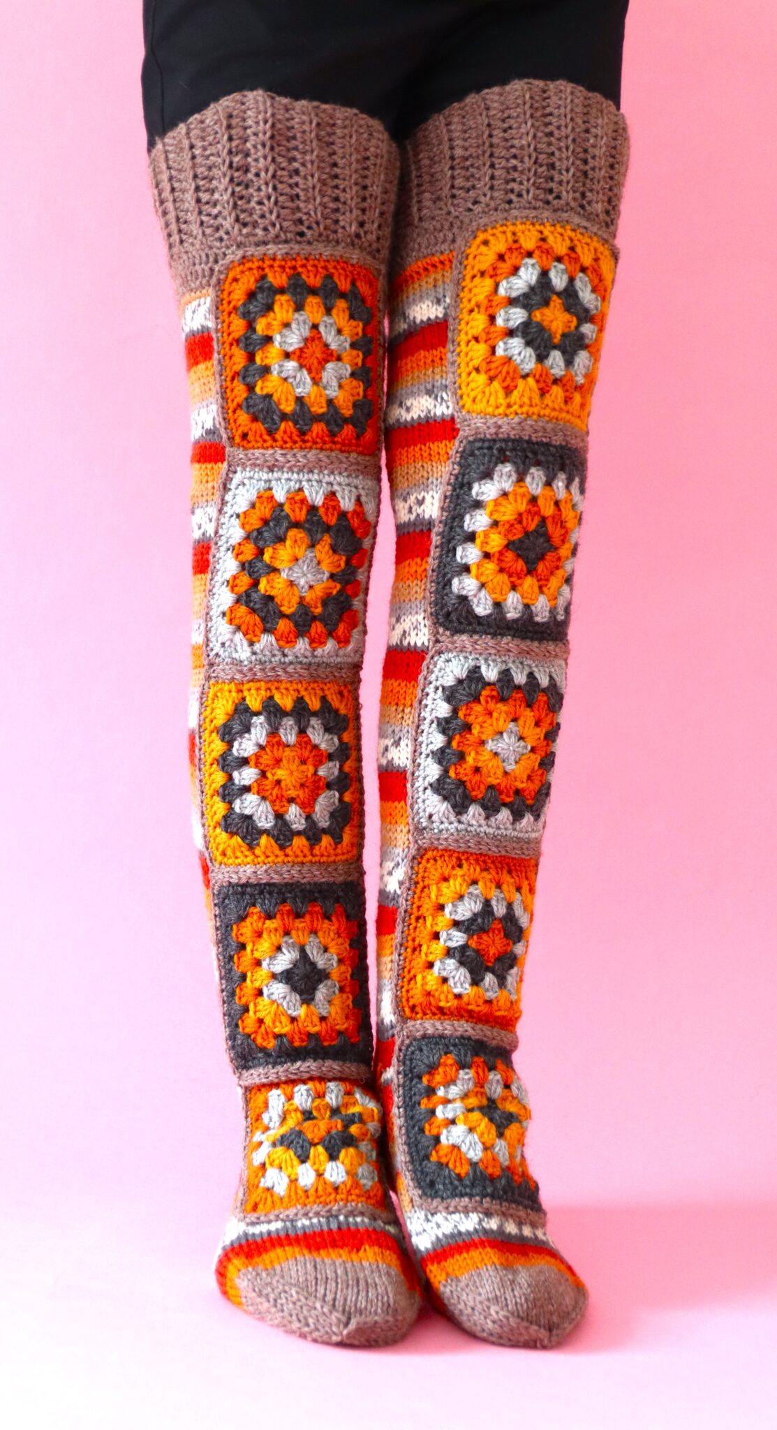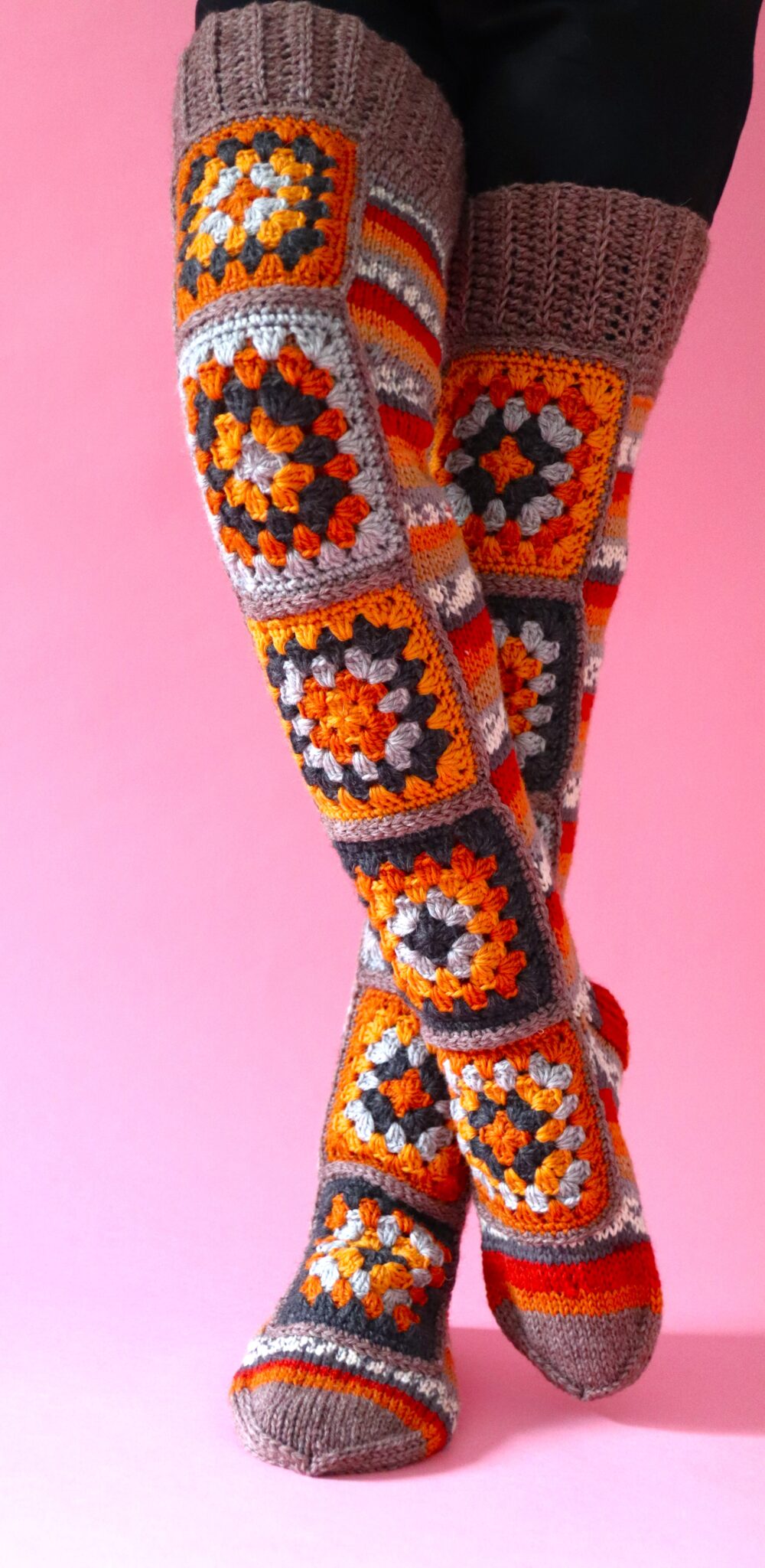 Sitten yksi päivä vaan napsahti (silleen hyvällä tavalla 😊), että niinpä; ensin neulotaan jumalattoman pitkät sukat, reilusti yli polvien. Neulotaan niin kuin sukat neulotaan. Ja sitten, ladys and gentlemans – siihen päälle ommellaan oma erillinen rivistönsä näitä virkattuja neliöitä! Ei se ollutkaan ydinfysiikkaa! 😊 Siitä osuvasti aasinsillalla toki kerron, ettei tämä siis ole alun perin oma ideani. Tsekatkaa Instagramista vaikka sellainen tili kuin @ivettykcraft. Omg miten inspiroivia juttuja! Ja kun tarkemmin katsoo esim hänen toteutuksiaan niin osassa on kyllä yhdistetty taitavasti virkkausta ja neulontaa, eikä ”oikaistu” kuten minä tässä ohjeessa. Mutta mitä väliä, kivat tuli! 😊