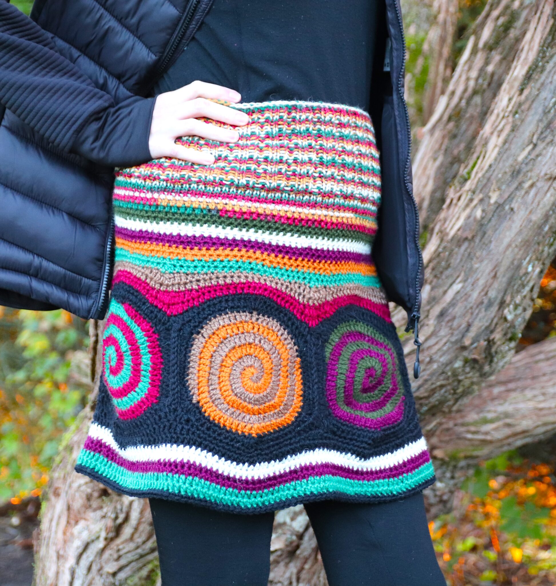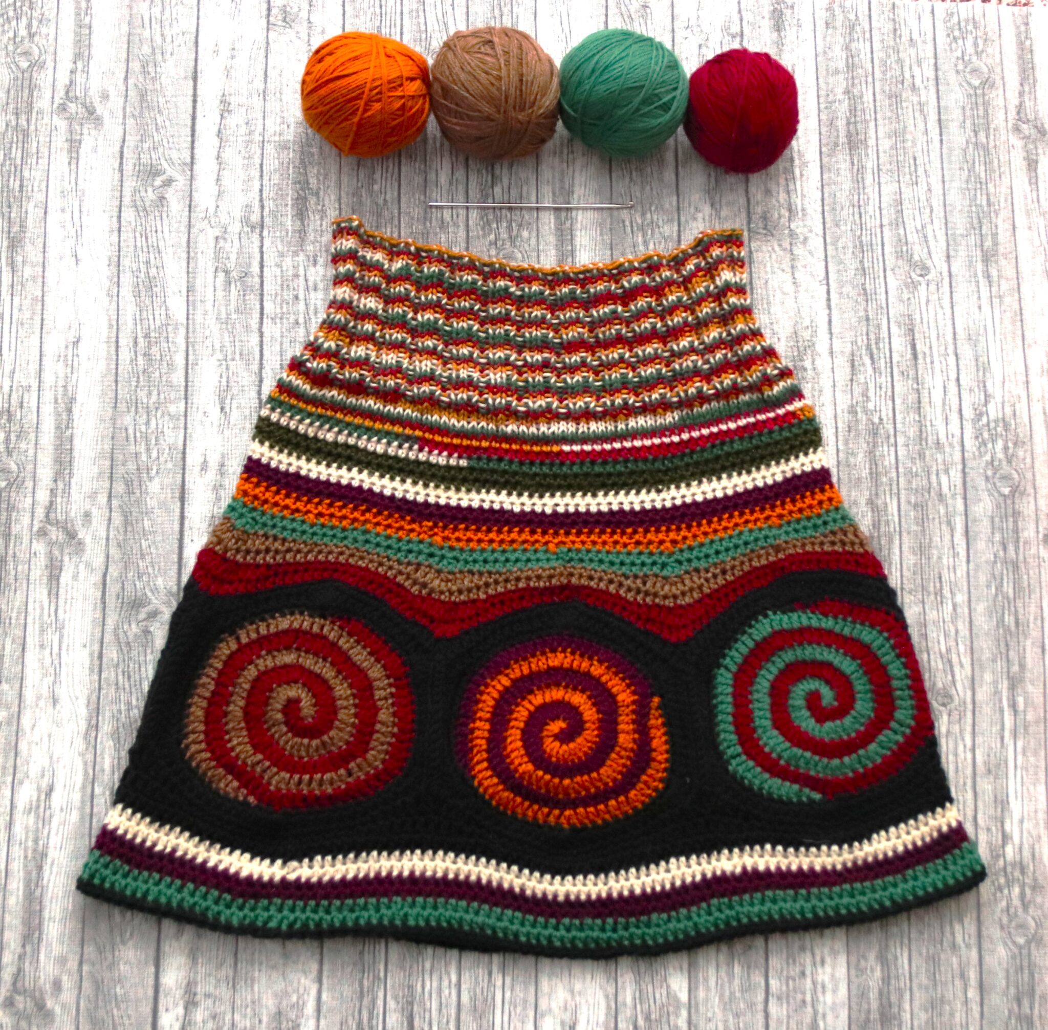 Tämän jälkeen virkataan/neulotaan kerroksia sekä spiraaliosion ylä- että alapuolella. Vyötärönkohtaan neulotaan pyöröpuikoille joustinneuletta.
