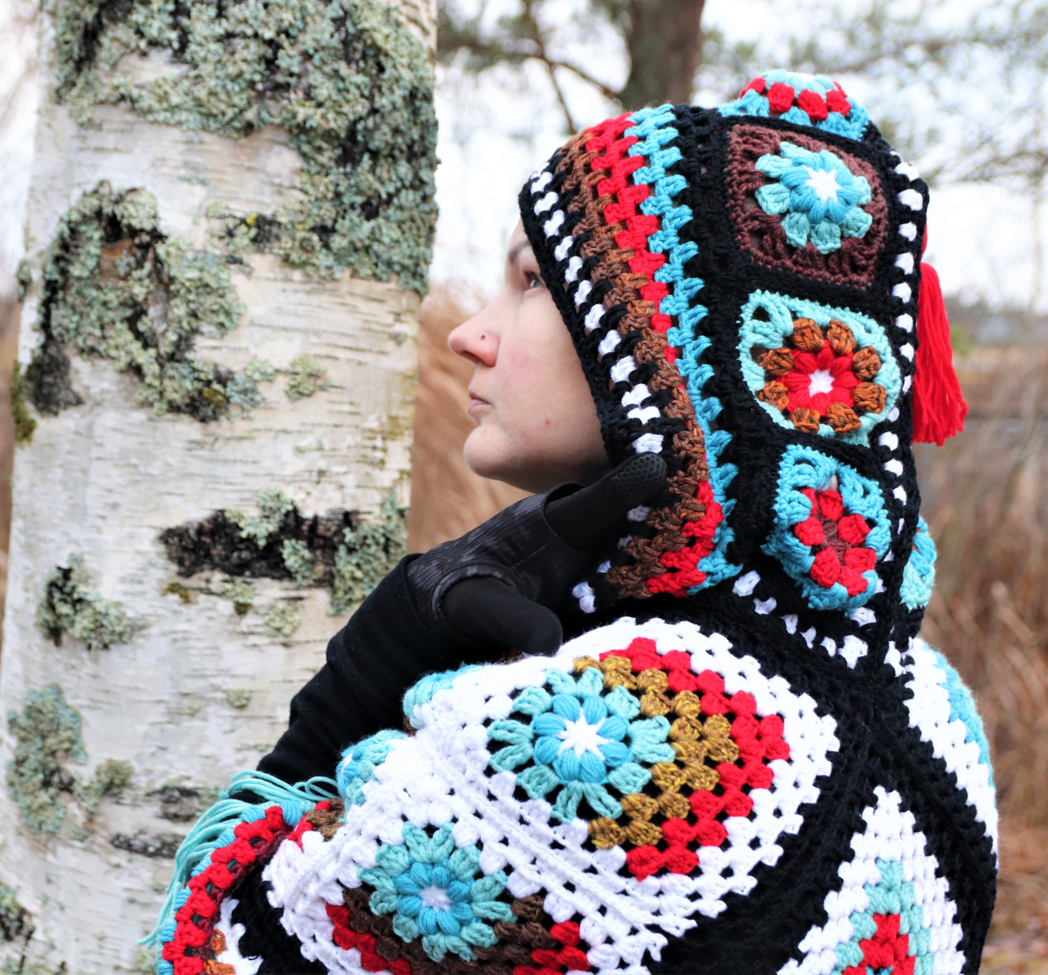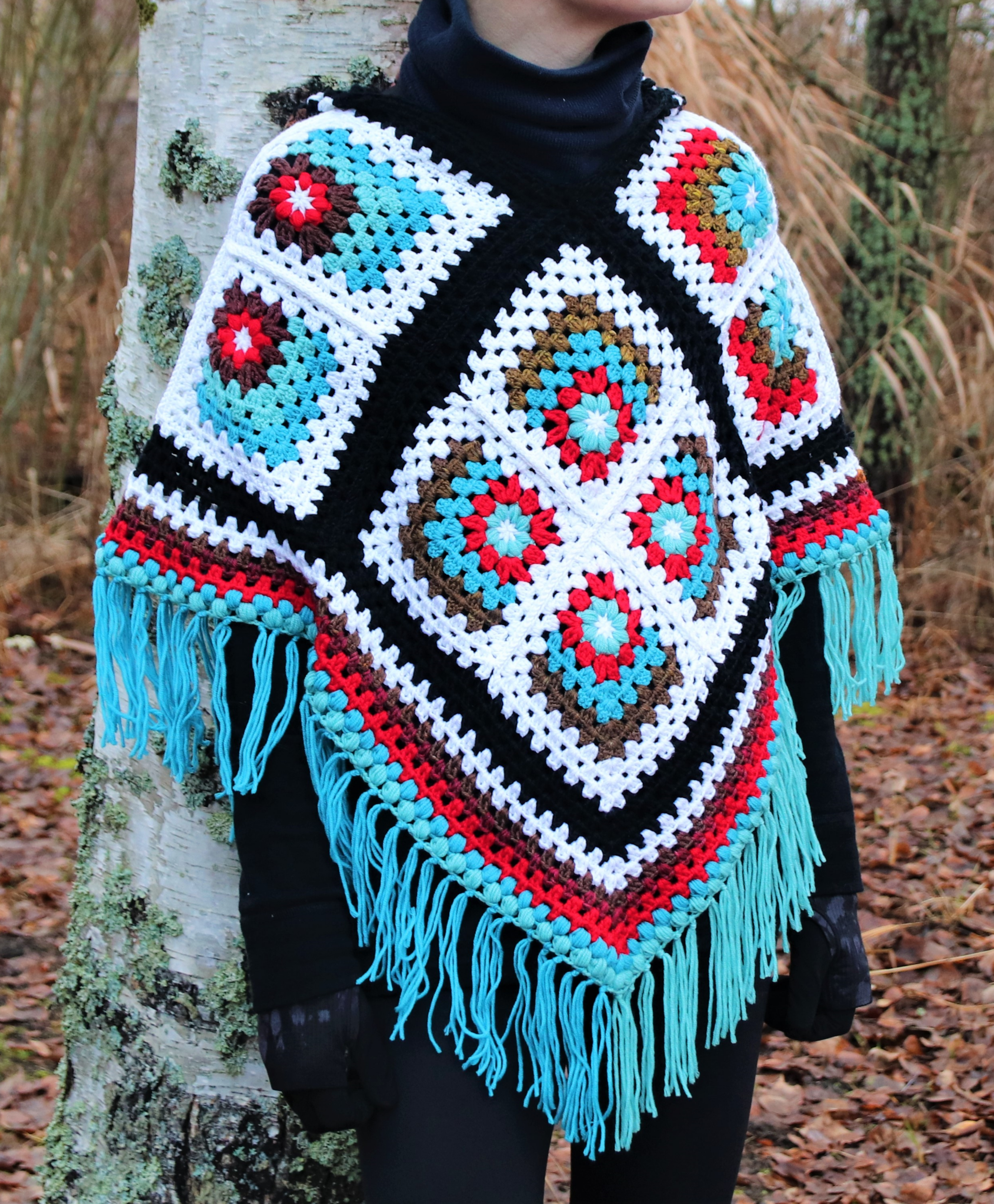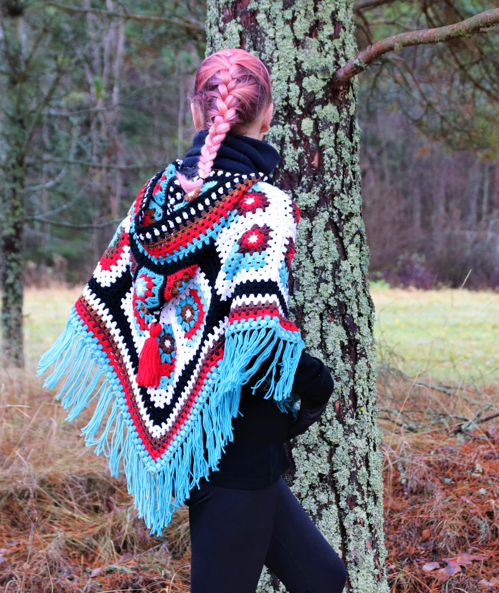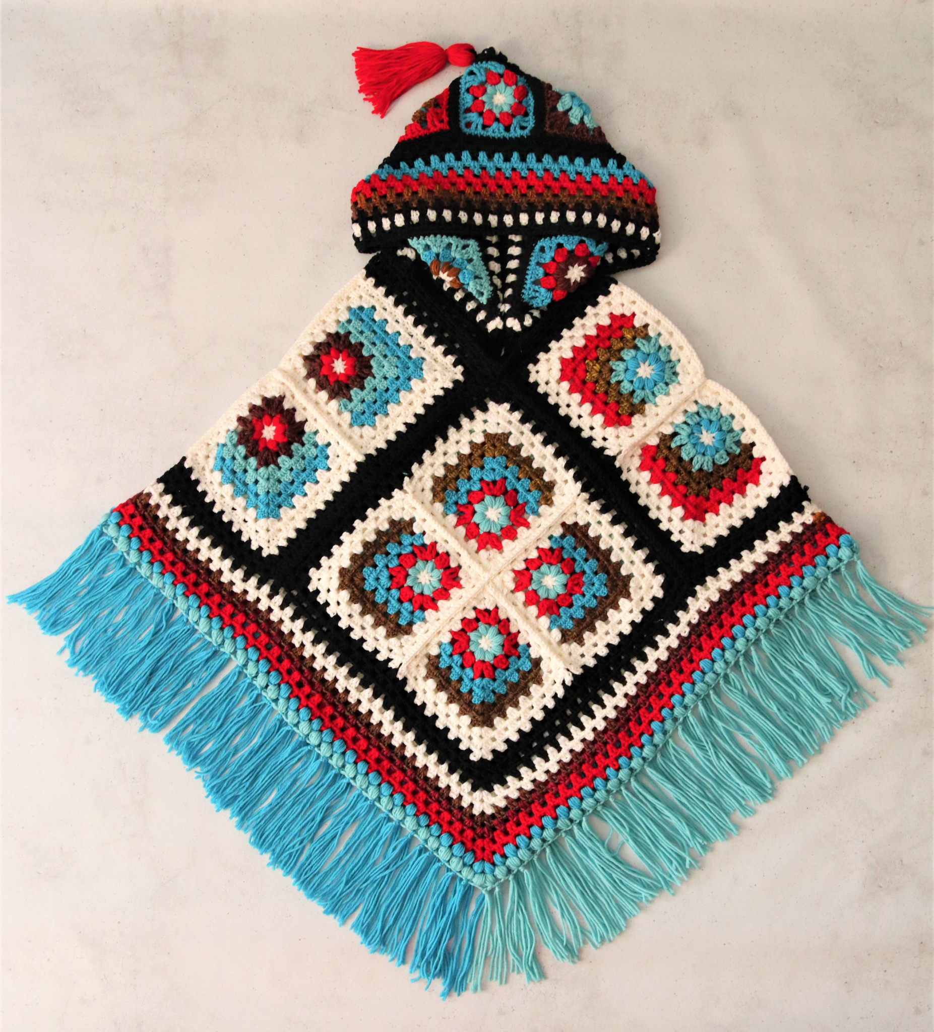 Tämä lämmin hupullinen poncho on näppärä kohde vaikka jämälangoille. 😊 Ponchoa varten virkataan ensin pienempiä neliöitä, jotka sitten yhdistetään isommiksi. Lämmittävä huppu tupsukoristeella (saa tehdä jos haluaa 😊) kruunaa kokonaisuuden!