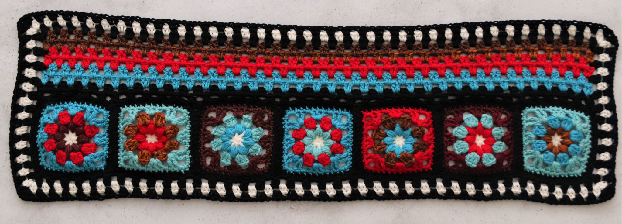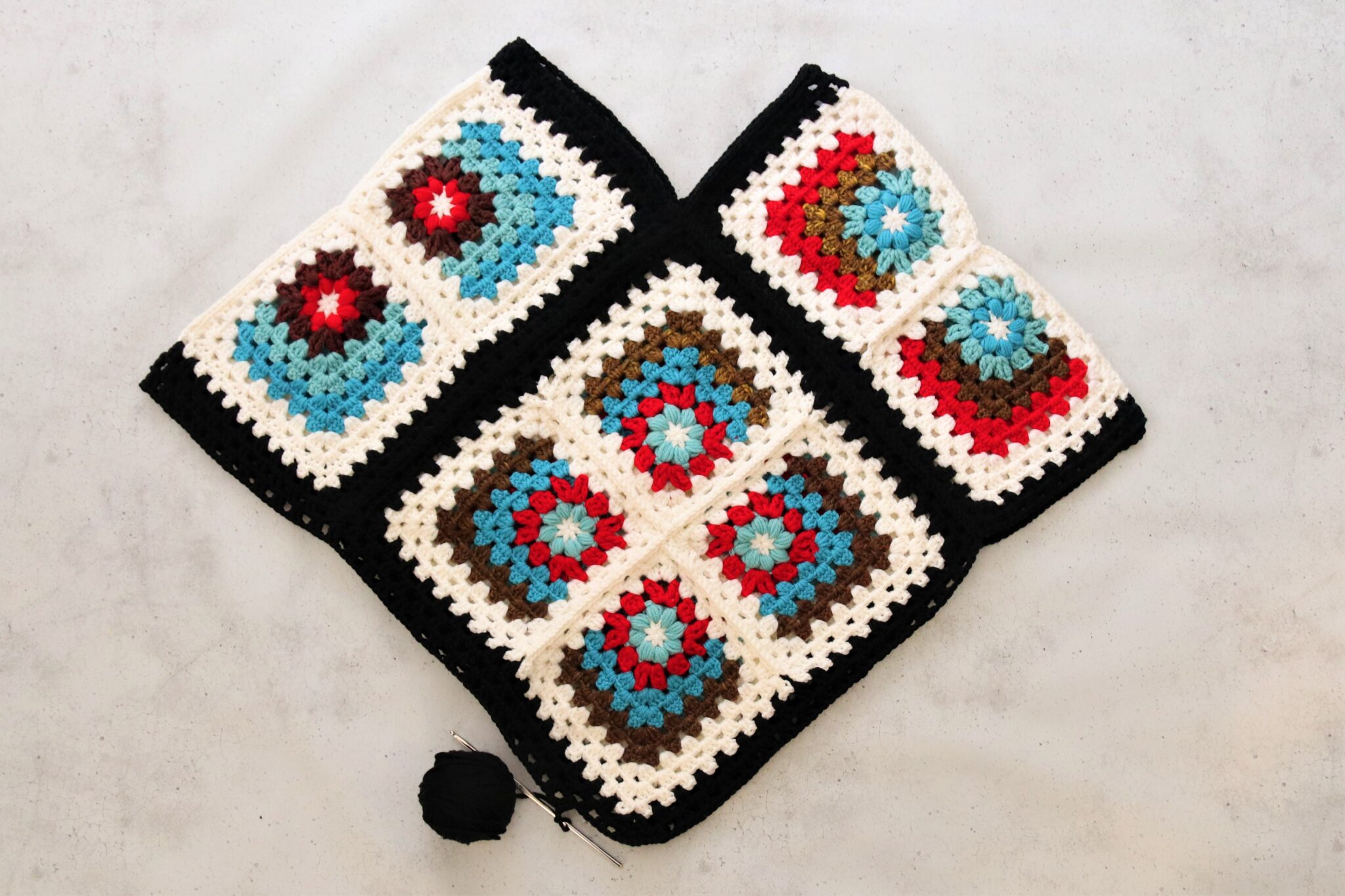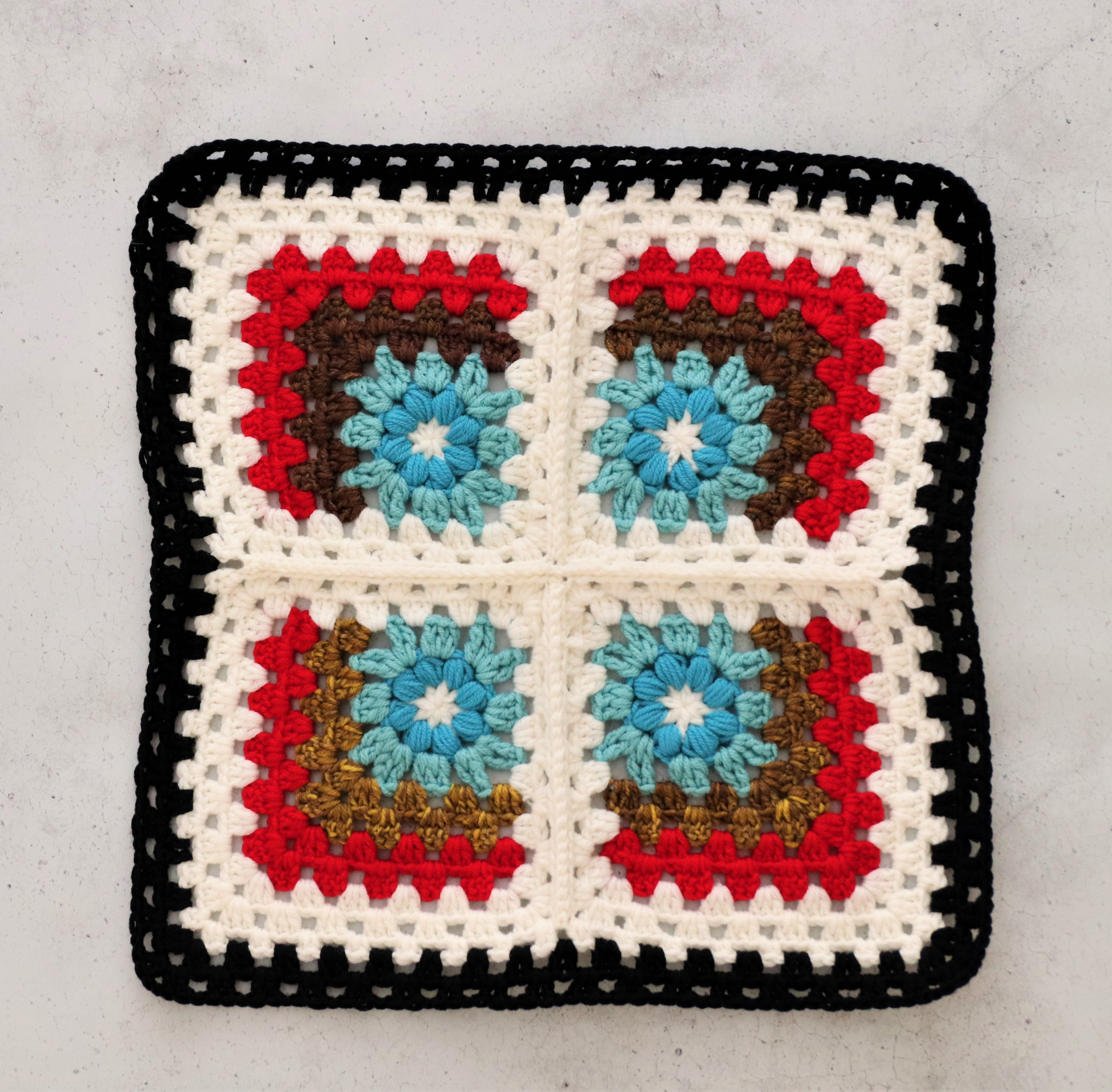 Virkkaa vielä tämän ison neliötilkun ympäri haluamasi määrä kerroksia isoäidinneliötekniikalla. Mallityössä ensin virkattu valkoisella kerros, sitten 2 kerrosta mustalla (2 p +1 kjs).