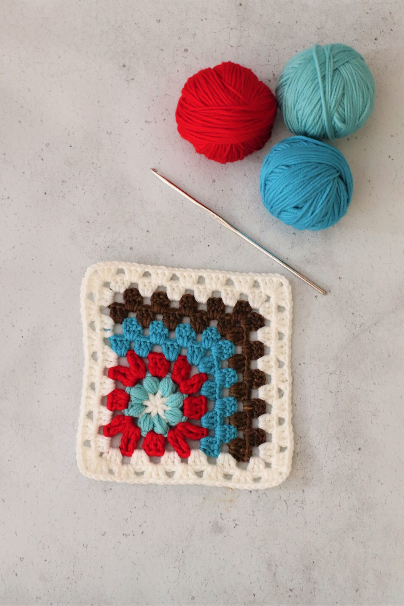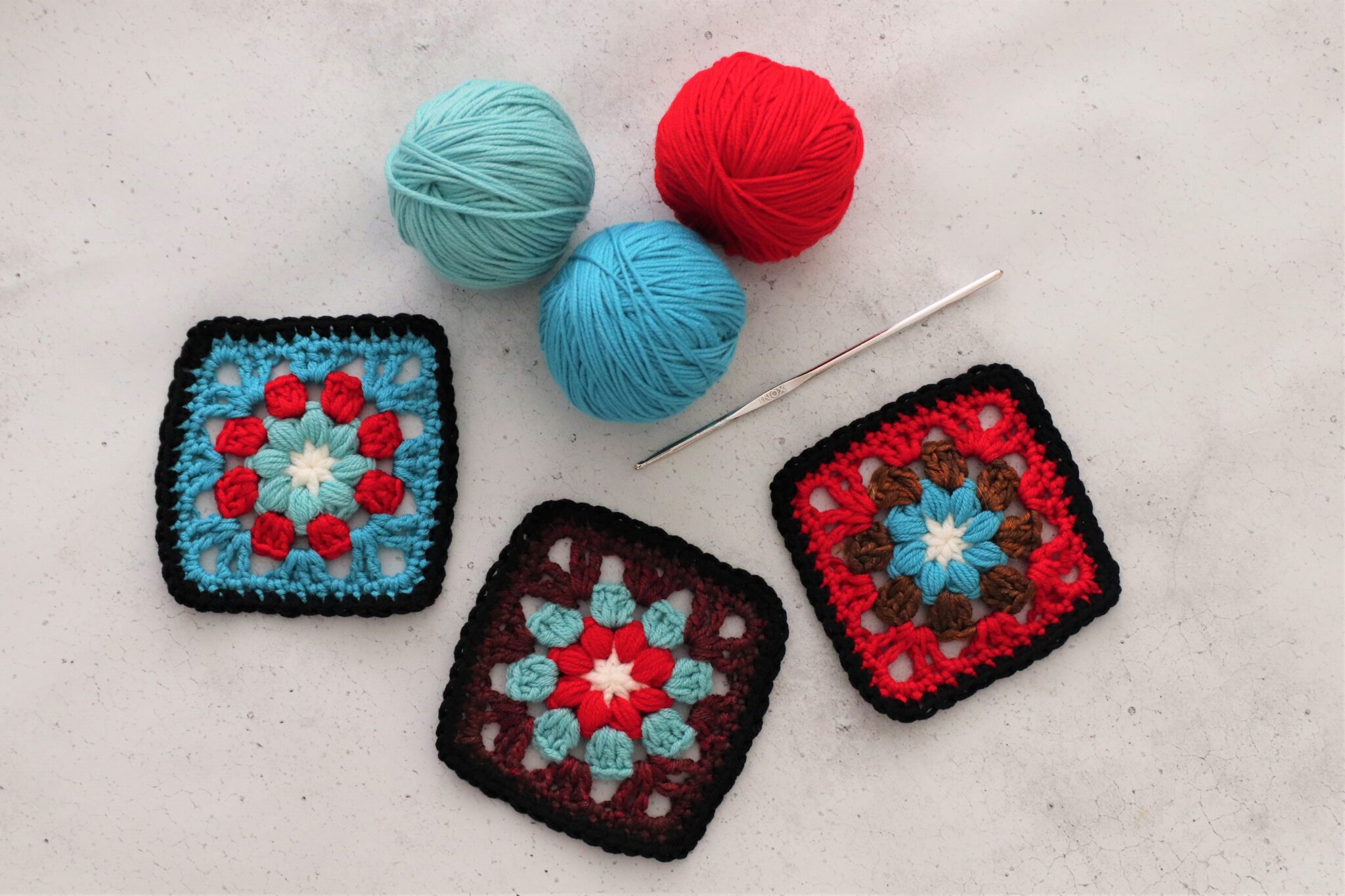 Voit virkata niin monta kerrosta isoäidinneliötekniikalla ja/tai puhvisilmukoilla kuin haluat. Mallityössä on virkattu isoäidinneliötekniikalla (2 p + 1 kjs) 7 kerrosta ja puhvisilmukoilla 2 kerrosta.
