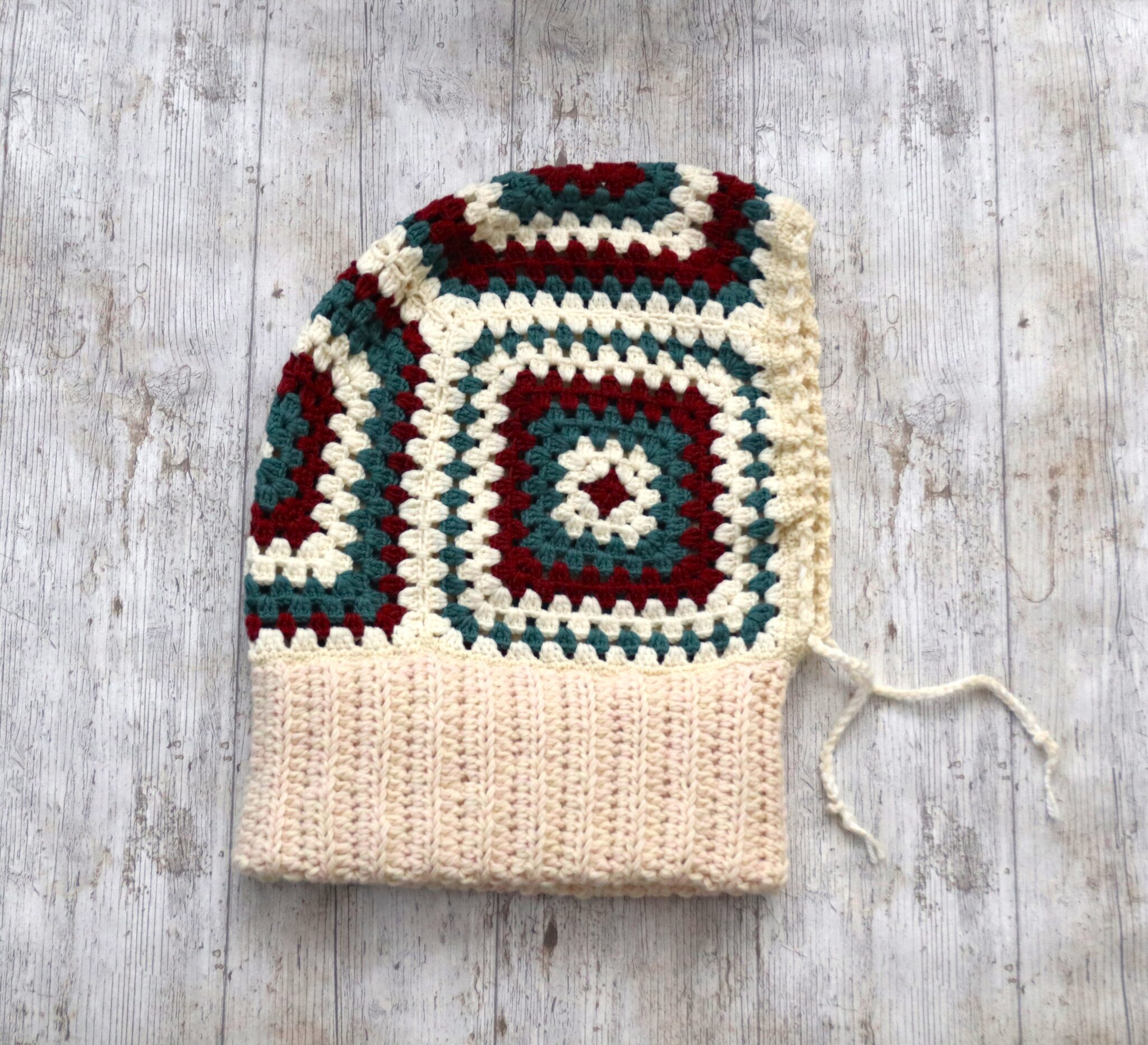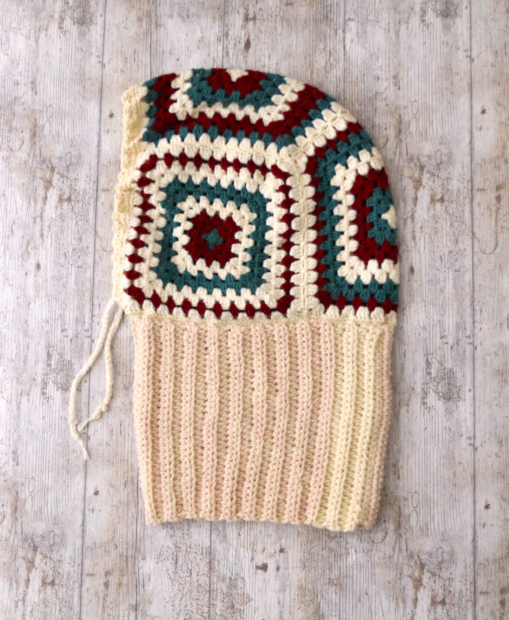 Balaclava-huppukaulurin idea on siis koota se tällä kertaa neljästä isommasta isoäidinneliöstä. Yleisemmin balaclavasta näkee niitä versioita, joissa on useampia isoäidinneliöitä. Itsekin sellaisia tullut tehtyä, ja jos sen ohje kiinnostelee niin tästä klikkaamalla löytyy. 😊