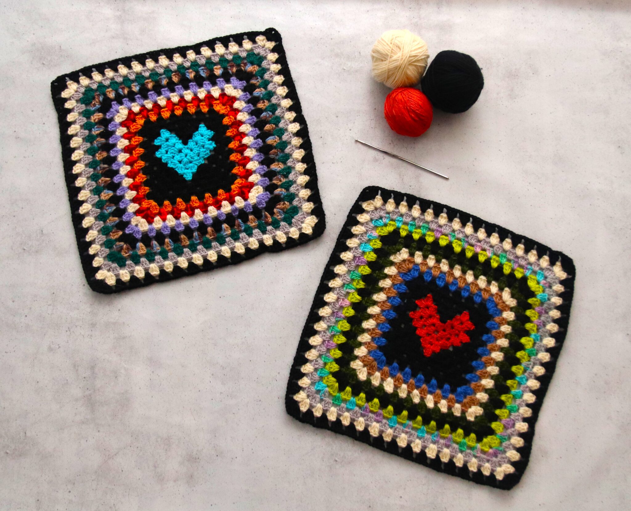 Isoäidinneliösydän virkataan kuten tavallinen isoäidinneliö, mutta värinvaihdoilla saadaan sydänkuvio esiin. Virkkaa aluksi samalla värillä 2 ensimmäistä kerrosta. Ota seuraavalla kerroksella pohjaväri (tässä musta) mukaan. Katso mallikuvista mihin kohtiin värinvaihdot tulevat. Jos haluat isomman sydänkuvion kuten selkäkappaleessa, pitää pohjavärin aloituskohta siirtää vasta neljännelle kerrokselle. Voit katkaista langan jokaisen värinvaihdon yhteydessä tai kuljettaa mukana nurjalla puolella. Päättele lopuksi hyvin ja ”ompele” langankuljetukset kiinni tilkkuun.