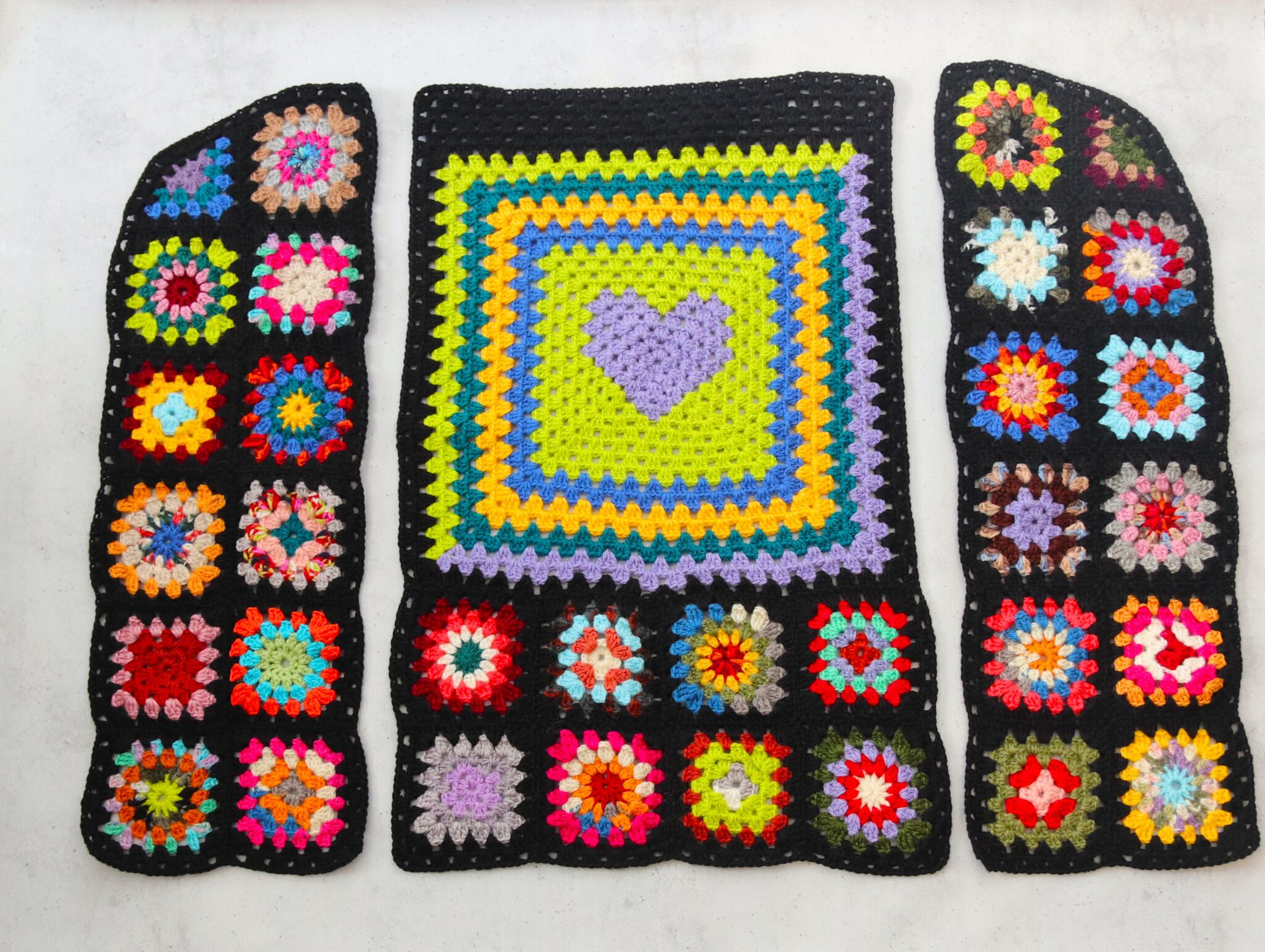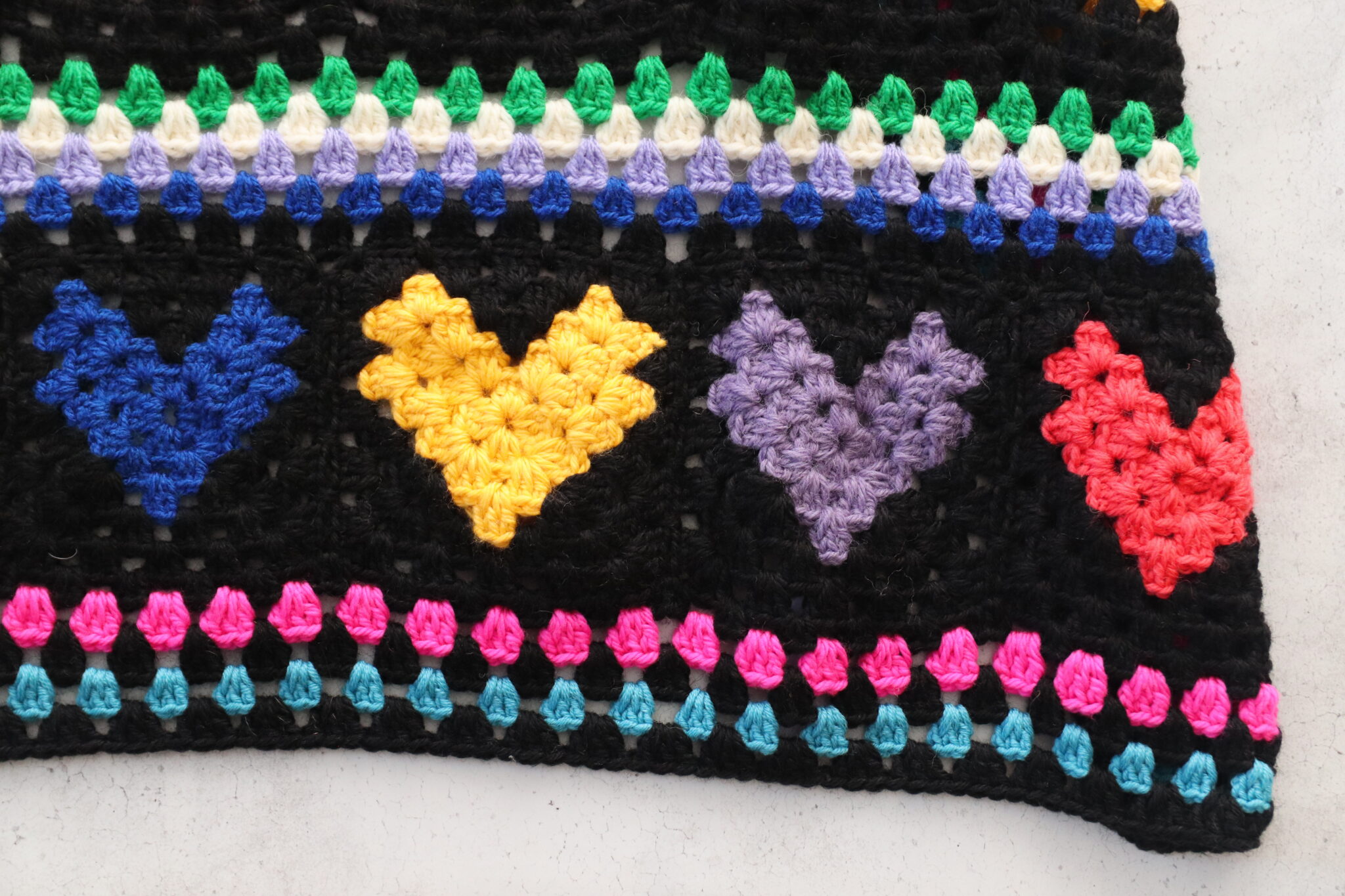 Helmaan on virkattu sydäntilkkuja 8 kpl. Virkkaa niistä samankokoiset kuin muistakin tilkuista, jotta kiinnityskohdat osuvat samoihin reikiin. Kun sydäntilkut ovat kiinni takissa, virkkaa taas koko takin ympäri muutama kerros vaihdellen eri värejä ja mustaa.