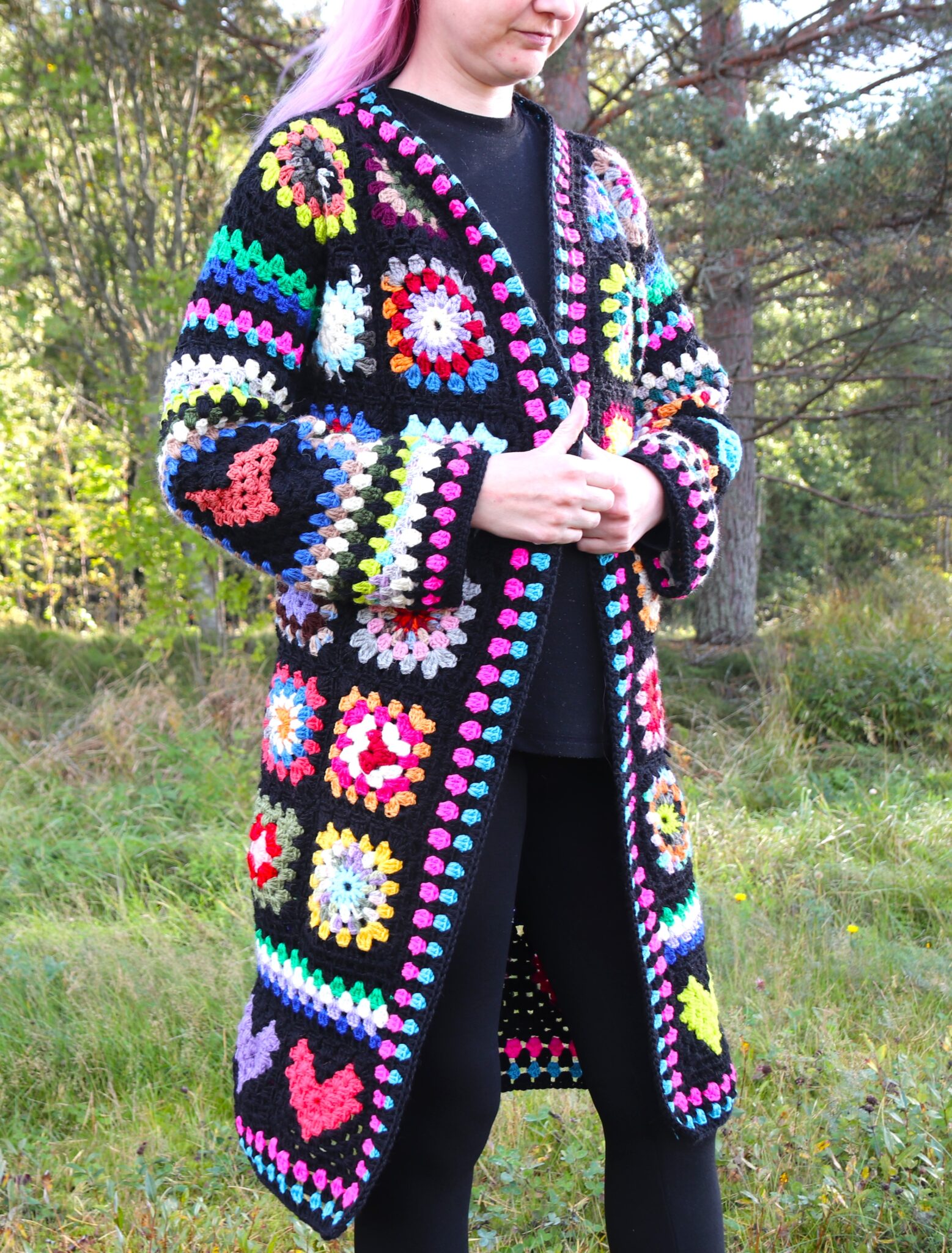 Nyt on mehukas (😊) jämälankojen hukutuskohde! Jos tämä päällä ei katseet käänny niin ei sitten millään. Virkattu pitkä sydänvillatakki on lopputulokseltaan juuri niin omaperäinen mitä vaan voi; eriväriset virkatut sydämet ja neliöt tekevät siitä persoonallisen – ja myös lämpimän villatakin! Tämä seuraavaksi koukulle, tässä tulevat ohjeet! 😊