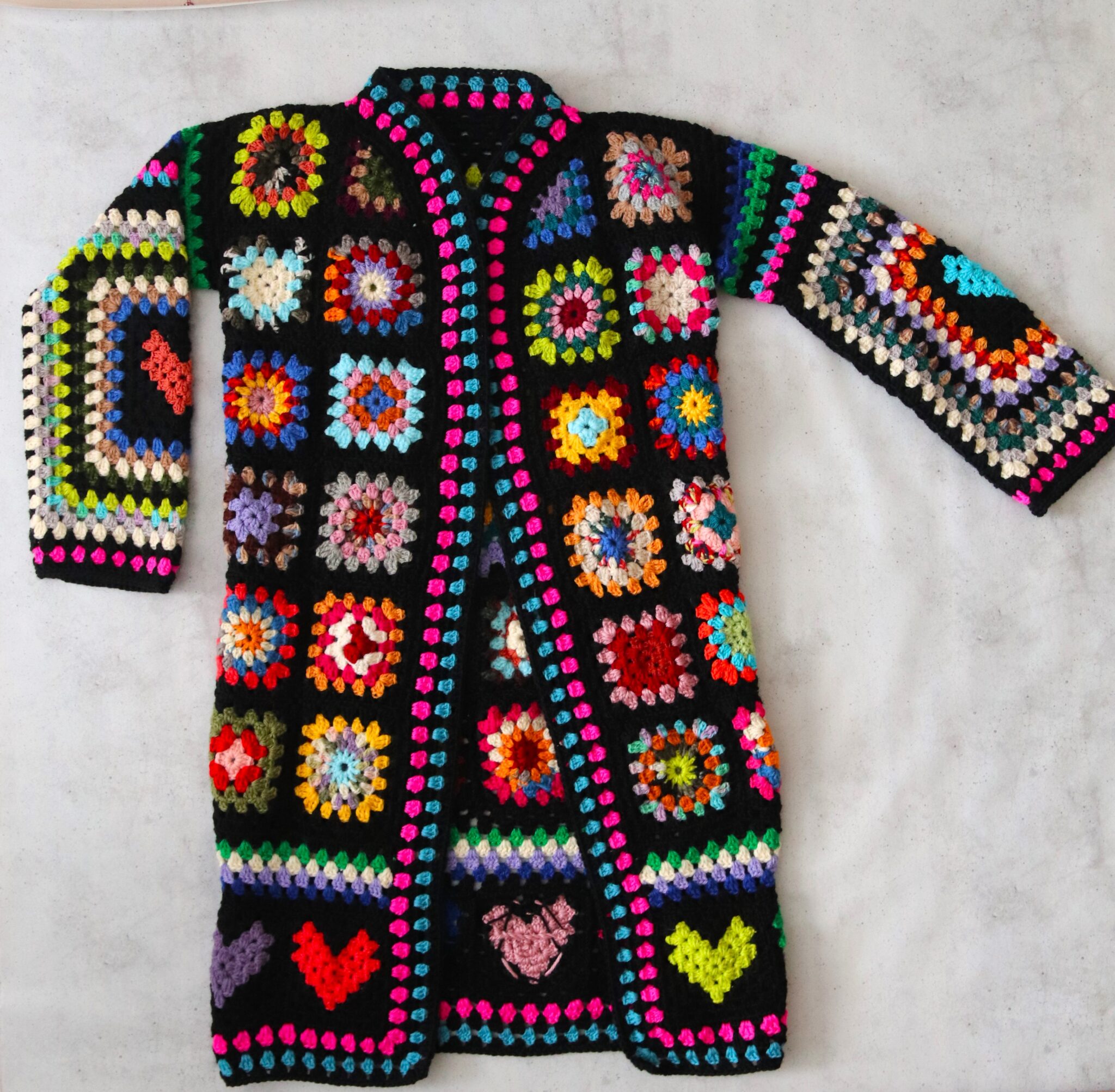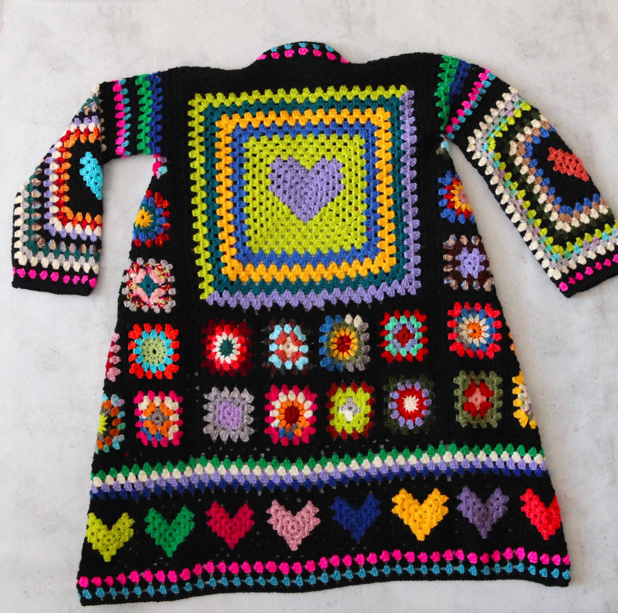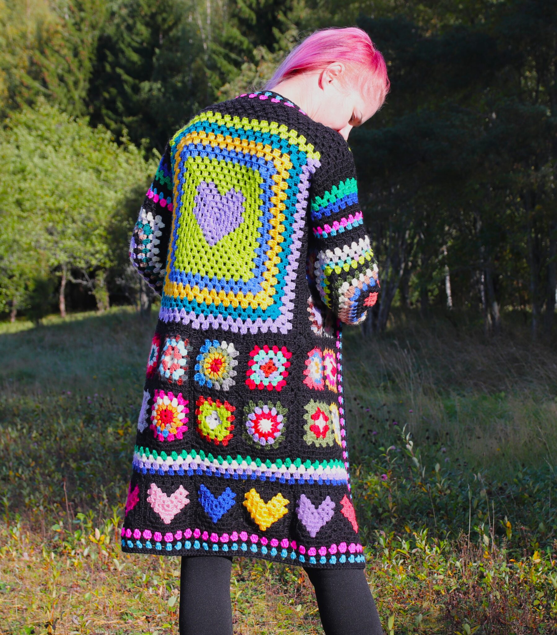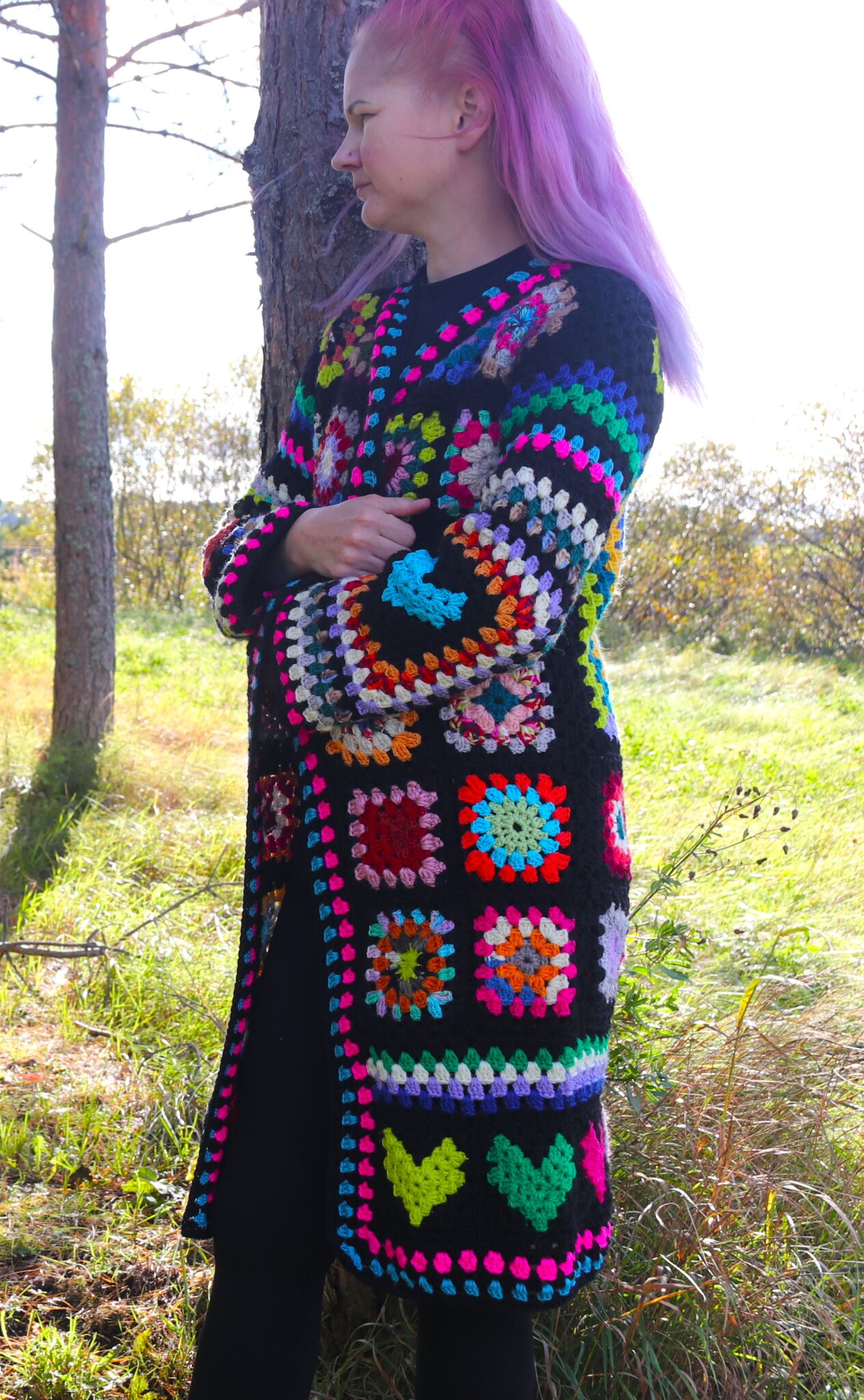 Nyt on mehukas (😊) jämälankojen hukutuskohde! Jos tämä päällä ei katseet käänny niin ei sitten millään. Virkattu pitkä sydänvillatakki on lopputulokseltaan juuri niin omaperäinen mitä vaan voi; eriväriset virkatut sydämet ja neliöt tekevät siitä persoonallisen – ja myös lämpimän villatakin! Tämä seuraavaksi koukulle, tässä tulevat ohjeet! 😊