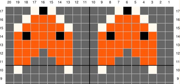 2. Kettukuvion jälkeen lisää 4 silmukkaa (jos äsken kavensit ne pois). Sen jälkeen 6 välikerrosta ja toinen kuvio (kts piirros) vielä uudelleen.