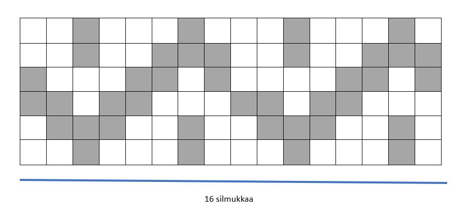 5. Seuraavaksi vuorossa kuvion neulominen (kts piirros). Tämä onnistuu silmukkajaolla 64. Jos koet helpommaksi niin jaa silmukat neljälle puikolle (16 s / puikko).