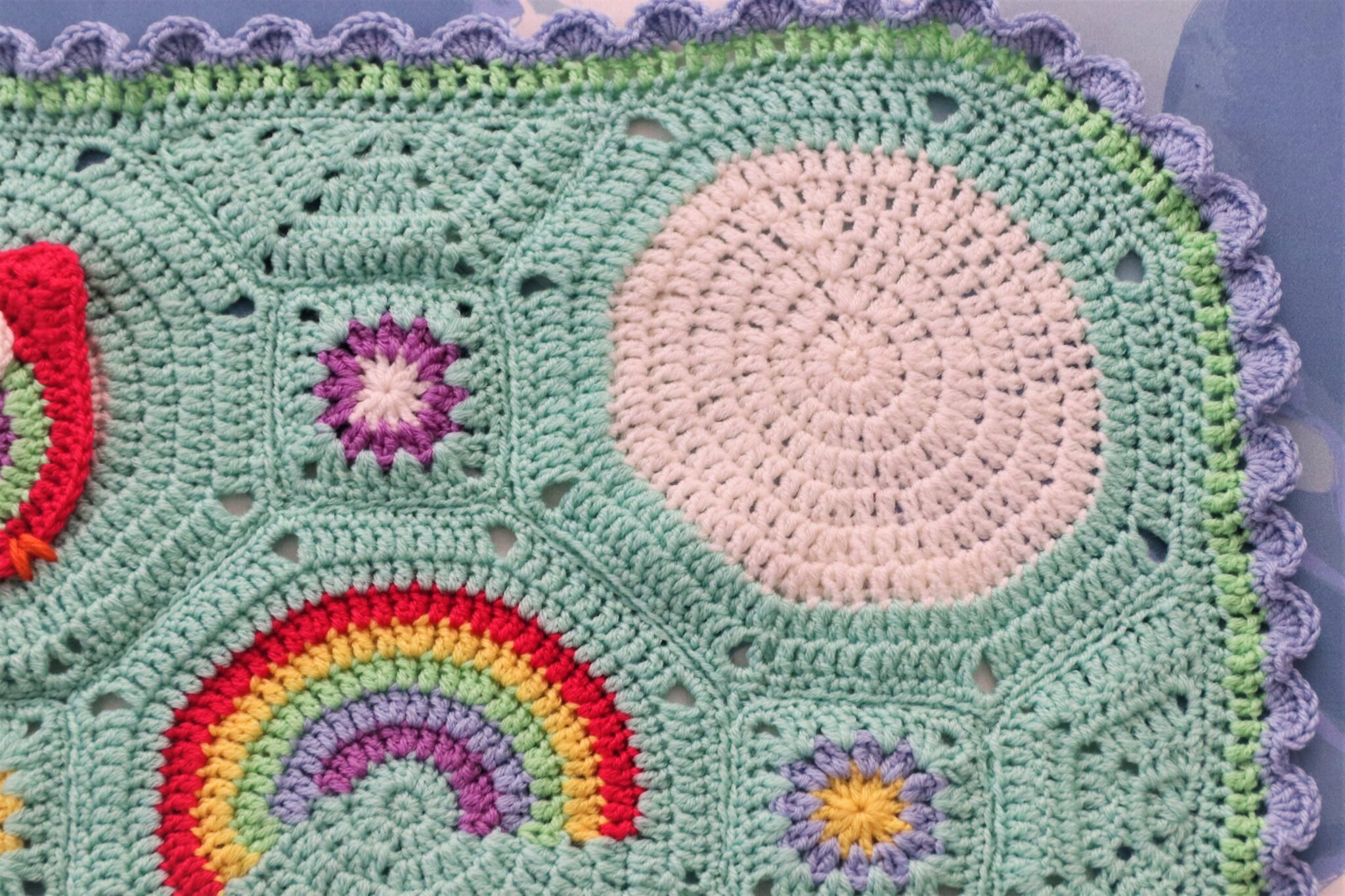 Voit vielä virkata koko peiton ympäri pylväitä/kiinteitä silmukoita ja/tai koristereunuksen (3 ks, 6 p samaan s:aan, 3 ks, 6 p samaan s:aan ….).