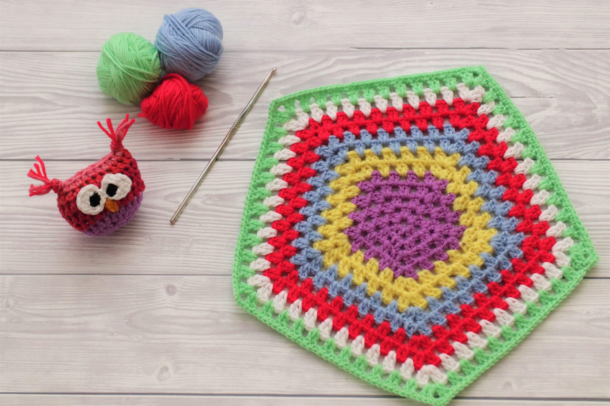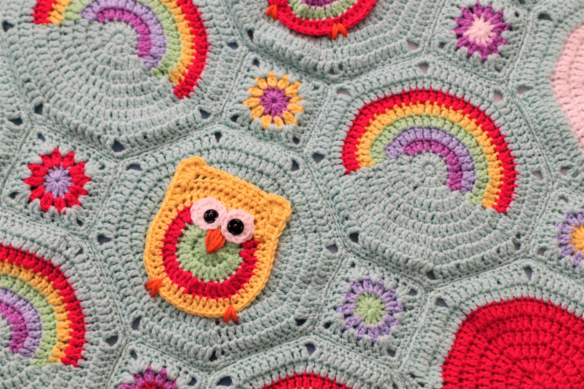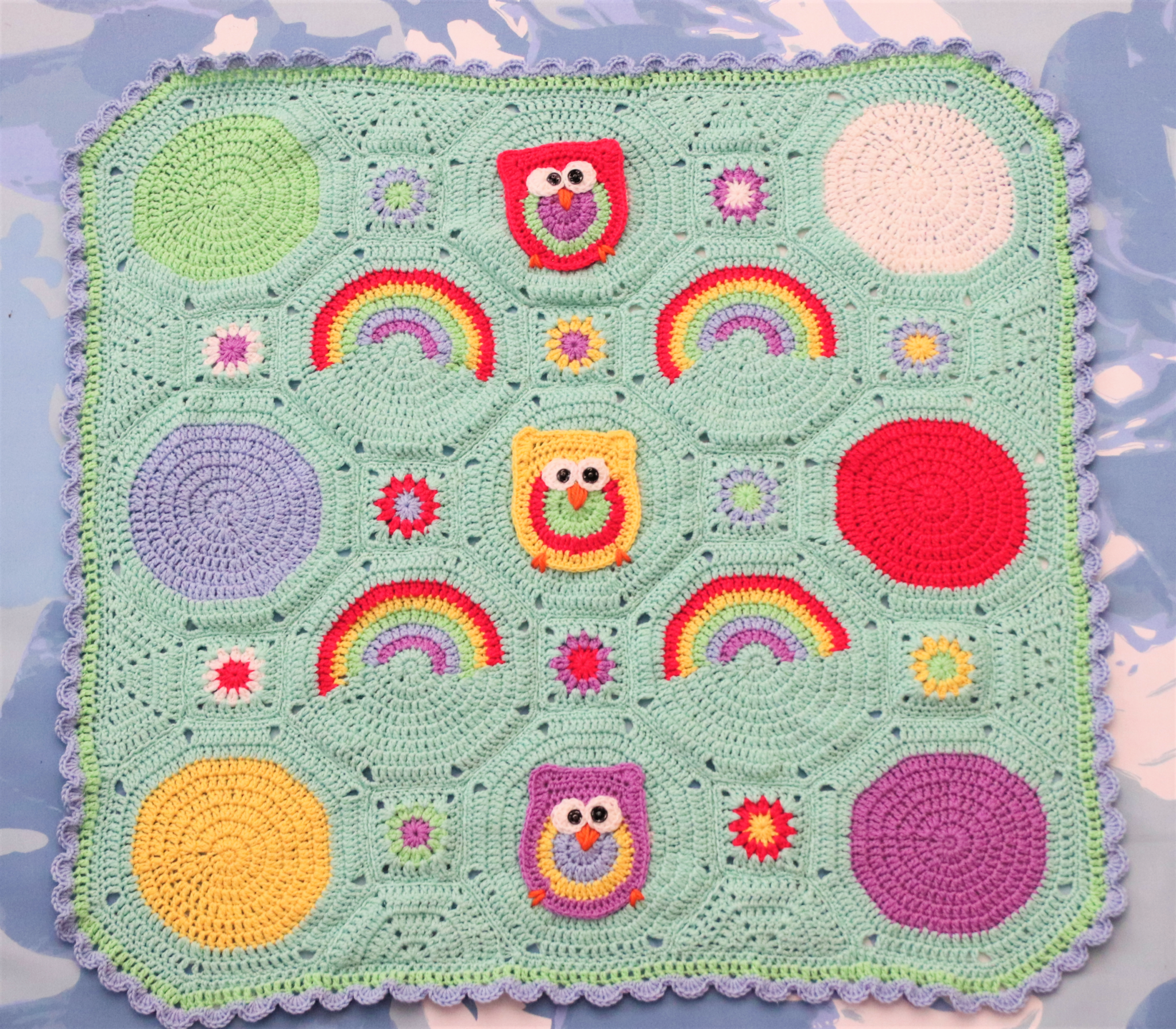 Kahdeksankulmioita virkataan peittoon 13 kpl. Osaan kiinnitetään pöllö, osaan tehdään sateenkaarimainen värimaailma ja osa on yksivärisiä. Jokainen kahdeksankulmio on samalla perusohjeella (pöllön pohja, sateenkaari, yksivärinen tilkku).