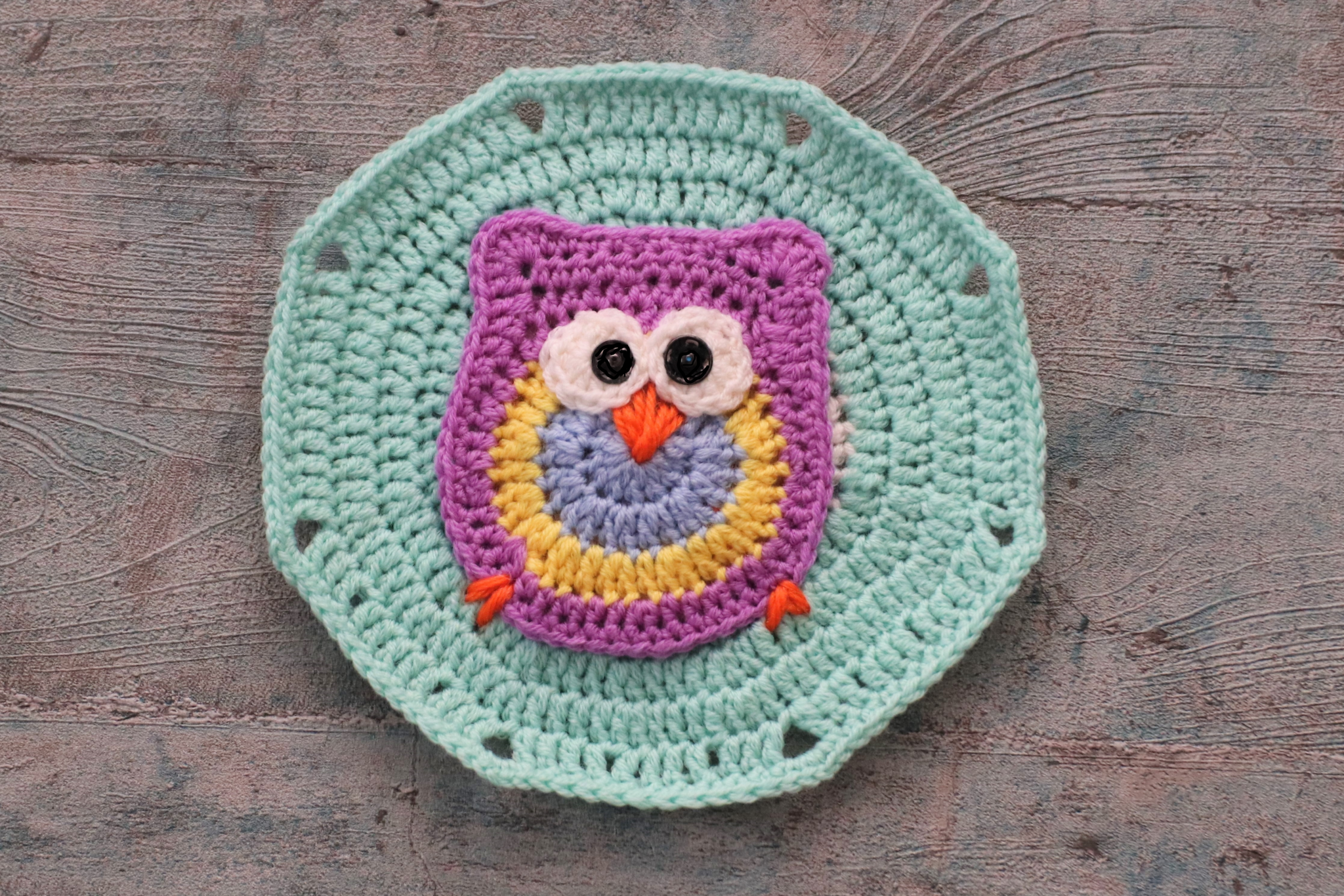 Virkkaa 8-kulmainen tilkku normaalisti. Pöllö kiinnitetään siihen neulalla ja langalla.