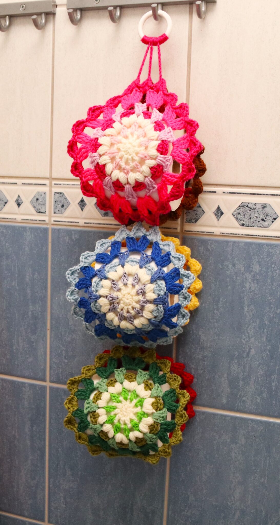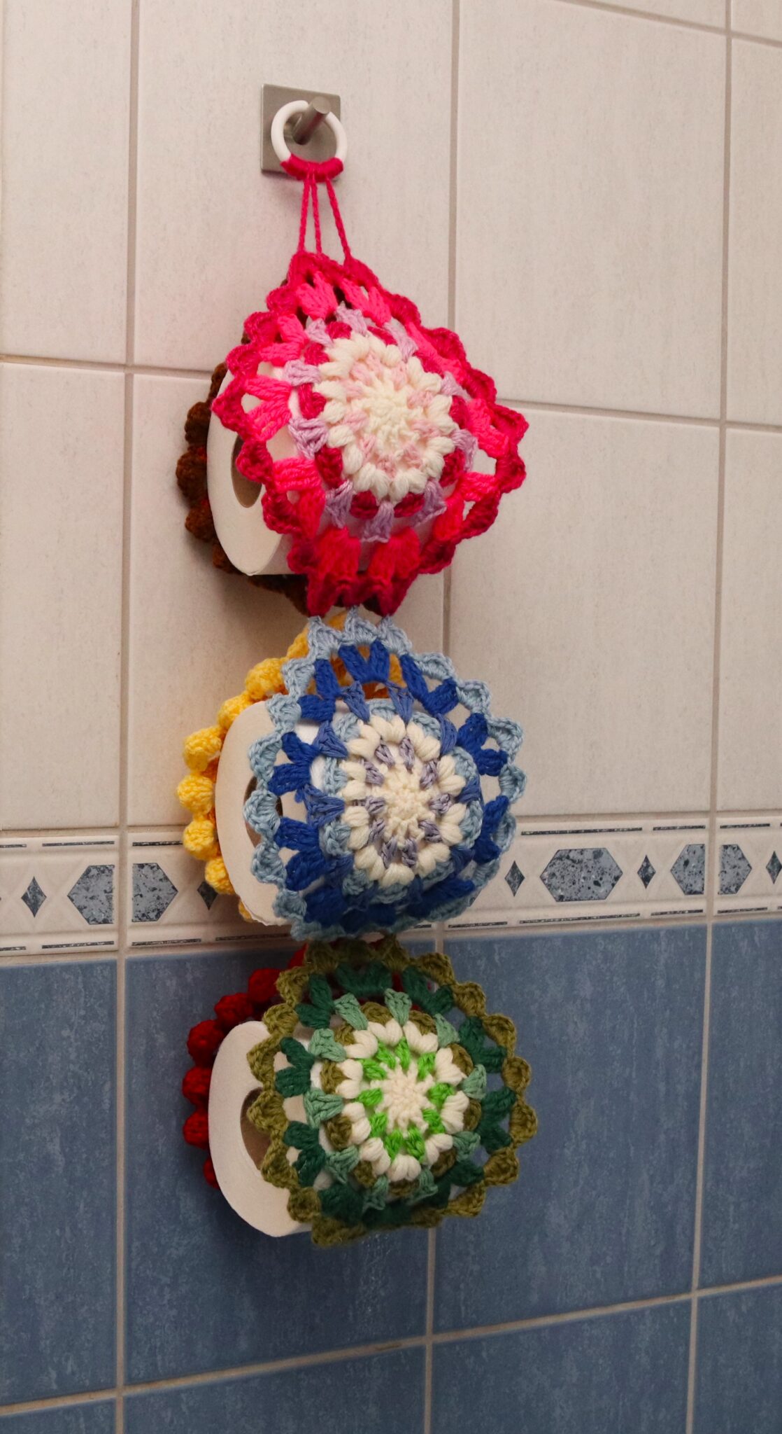 Tässäpä näppärä ja hyödyllinen virkkausprojekti: Virkattu wc-paperiteline kolmelle rullalle! 😊 Virkattu wc-paperiteline koostuu kolmesta toiseensa kiinnitetystä taskusta, joissa wc-paperirullia voi säilyttää. Yhdessä rullataskussa on 2 tilkkua vastakkain, yläreunoistaan toisiinsa kiinnitettyinä.