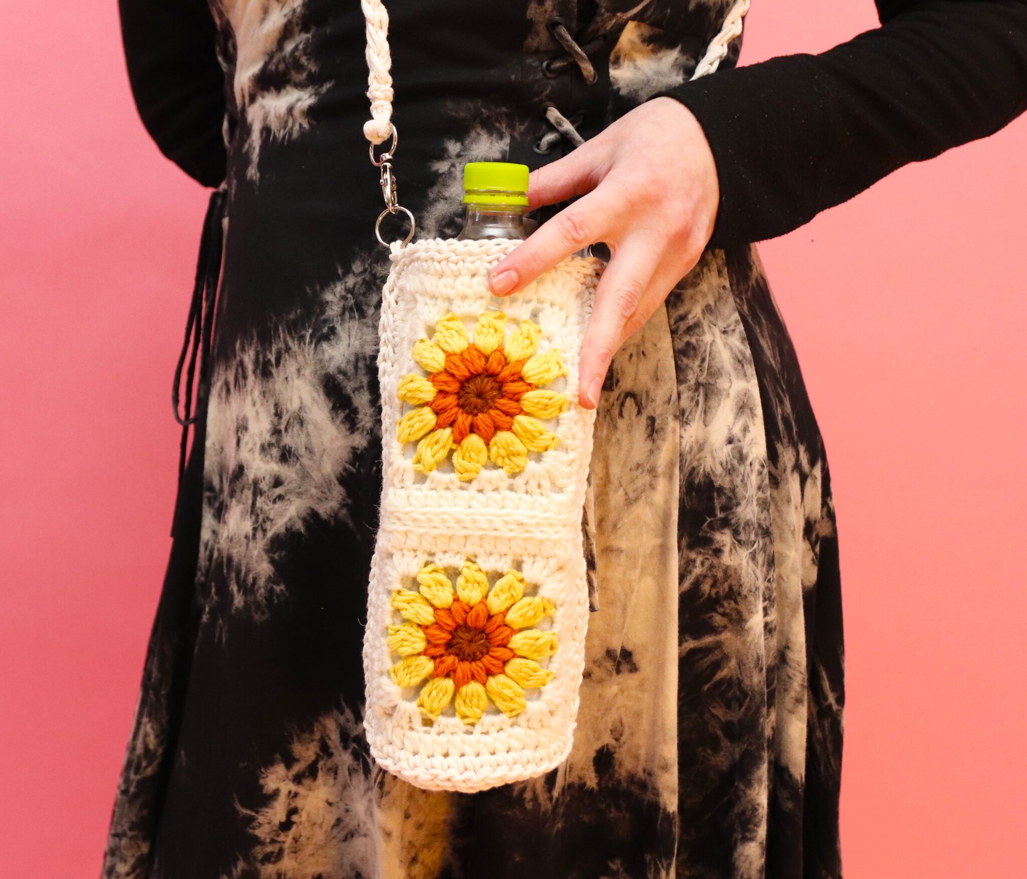Virkattu pullopussukka puhelintaskulla koostuu neljästä kukkatilkusta ja sisälle virkatusta suorakulmion muotoisesta sisätaskusta.