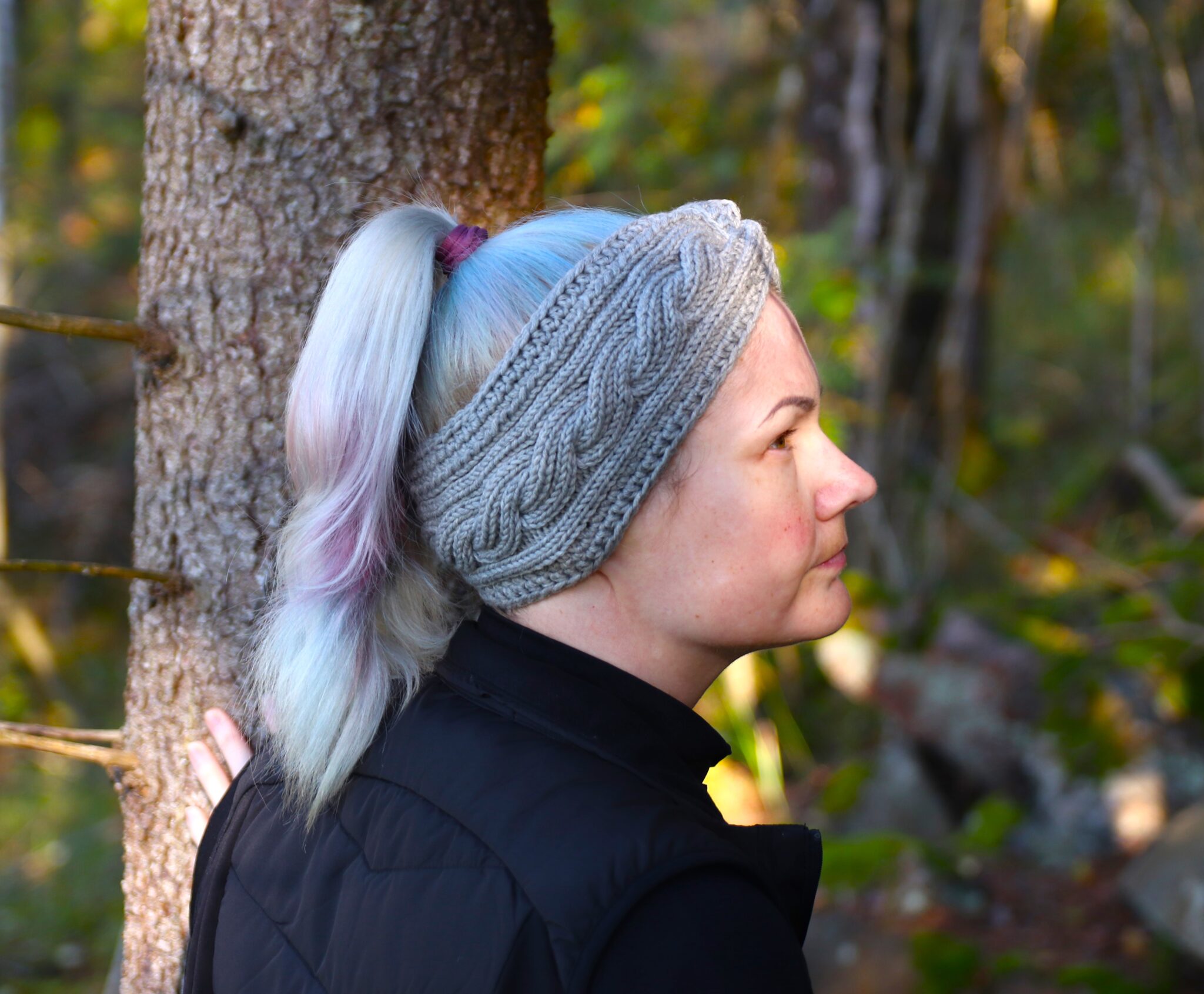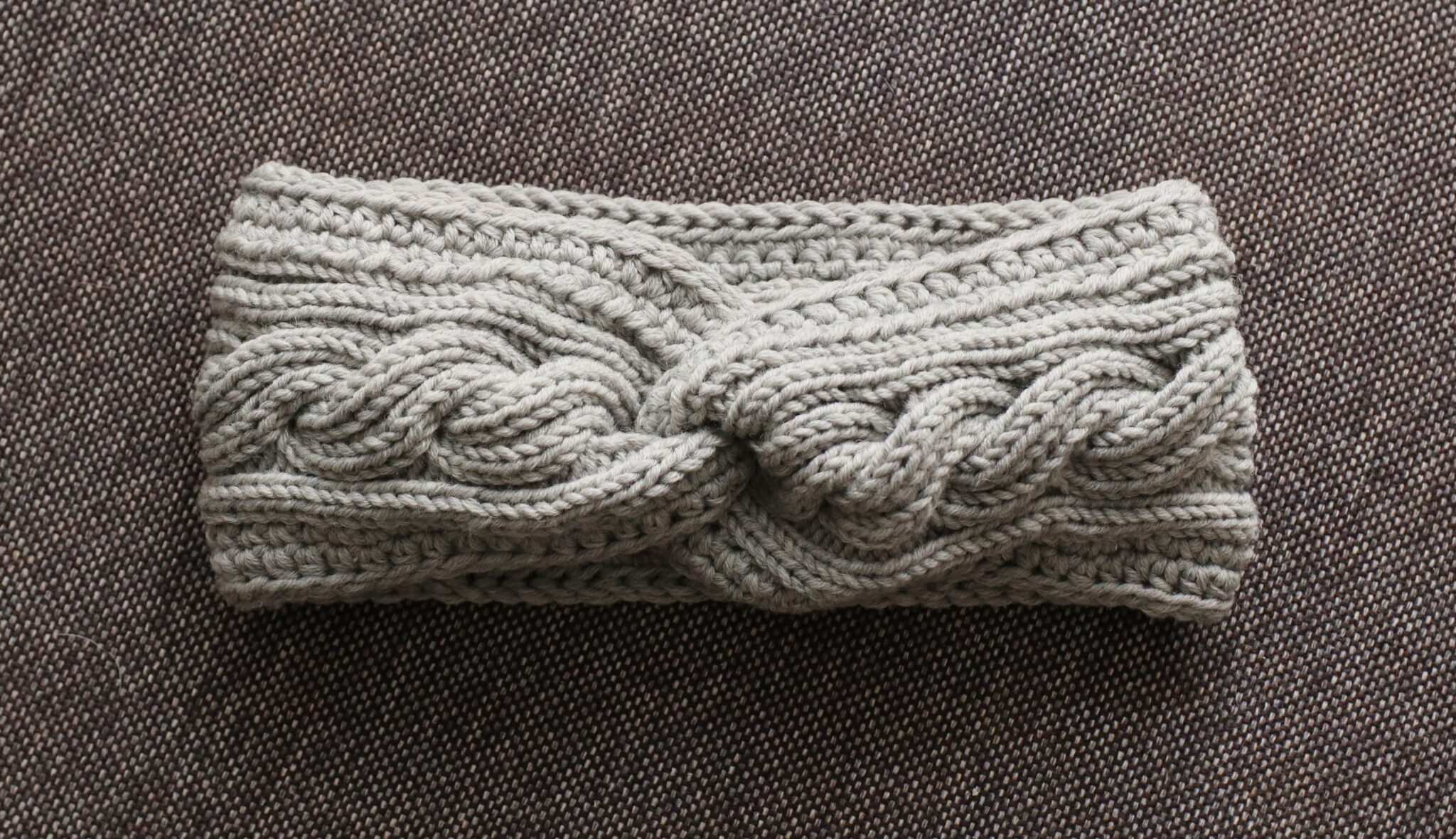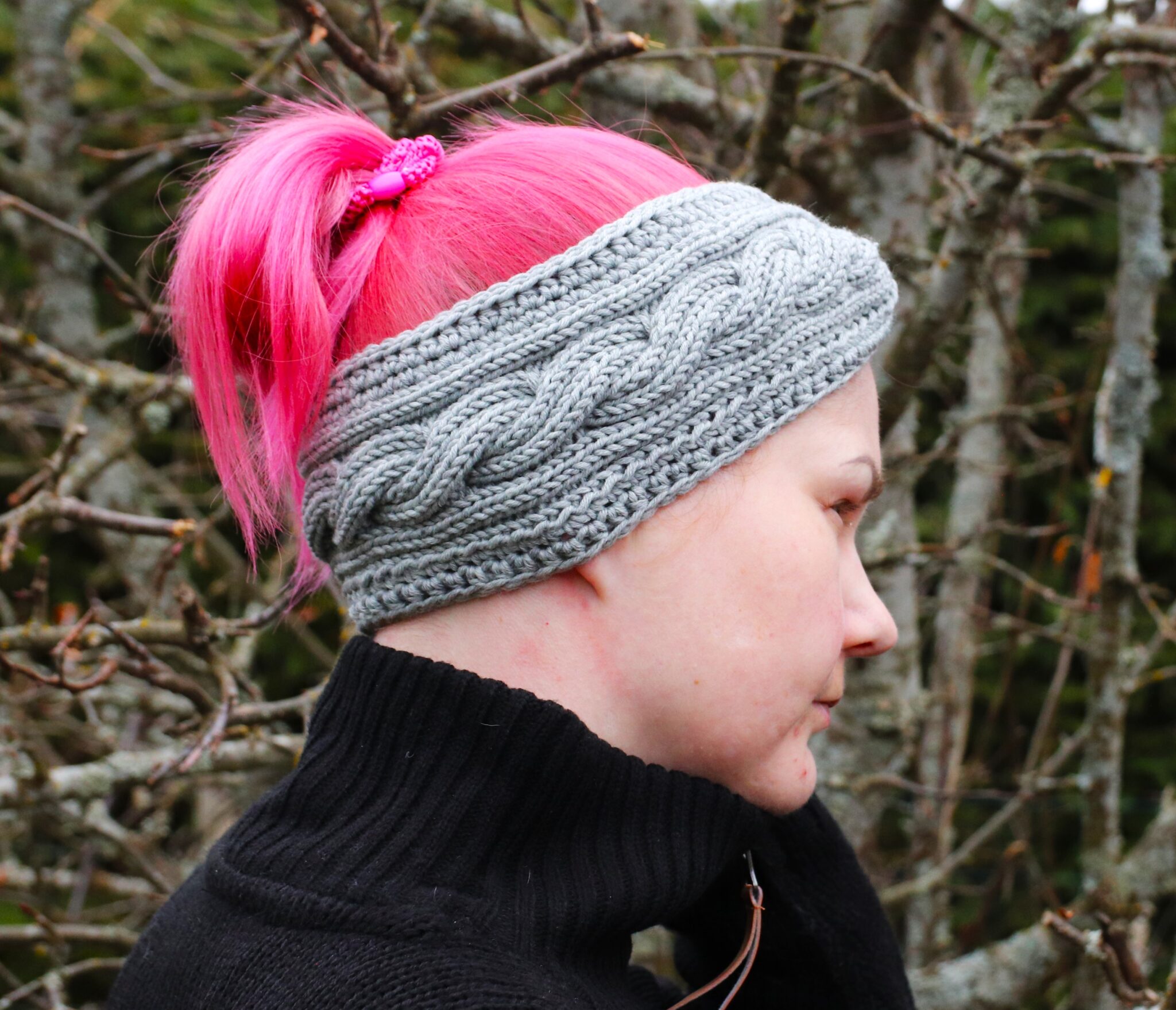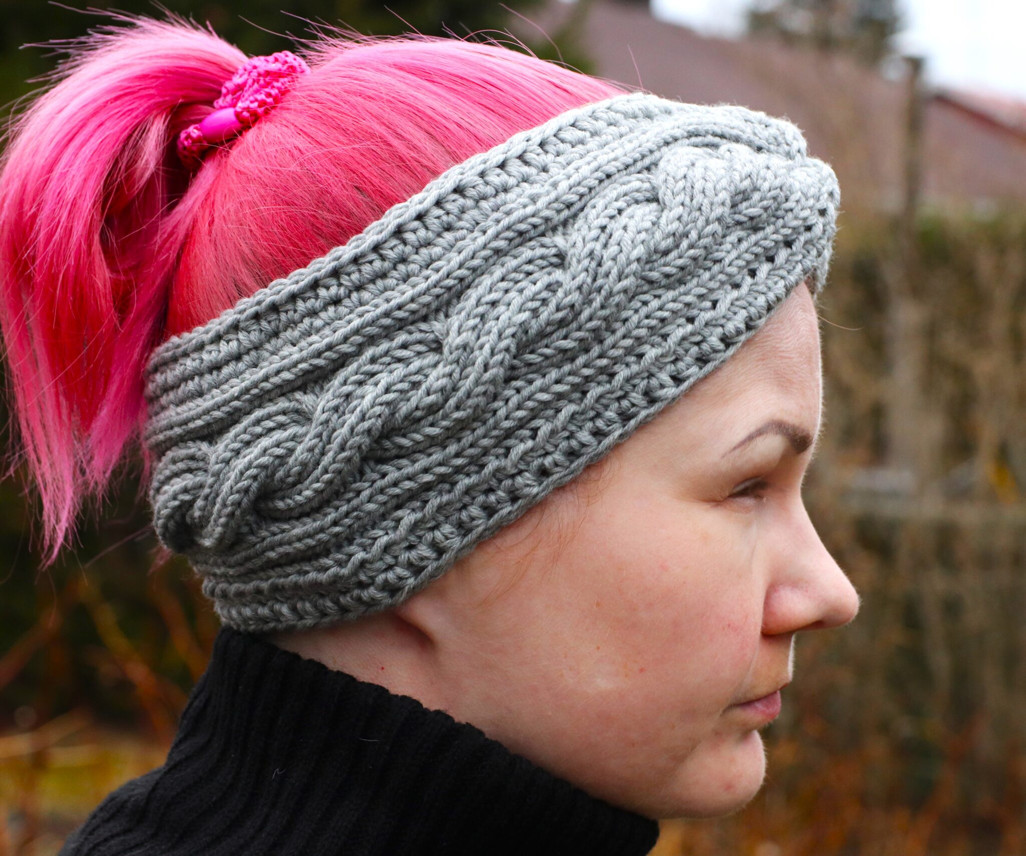 3. *Jatka joustinneuletta 2 n 2 o taas 10 kerrosta, jonka jälkeen palmikonkierto kuten kohdassa 2.* Toista *_* kunnes pannan pituus on noin 54 cm – tai halutun mittainen.