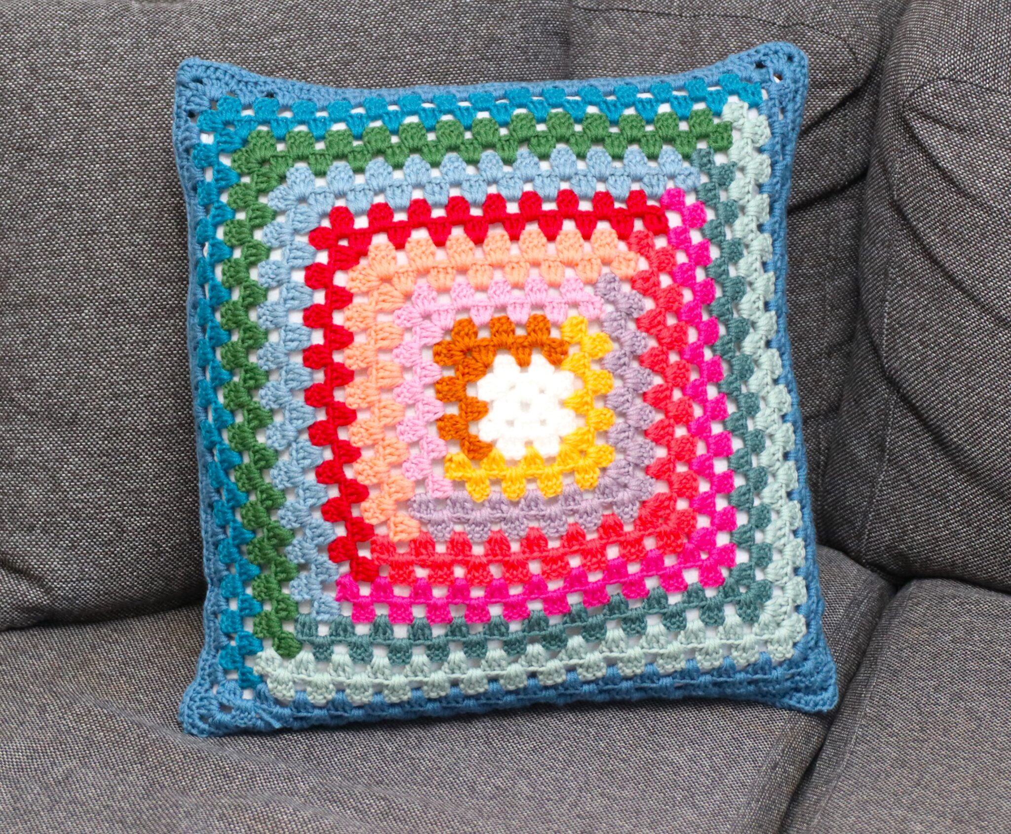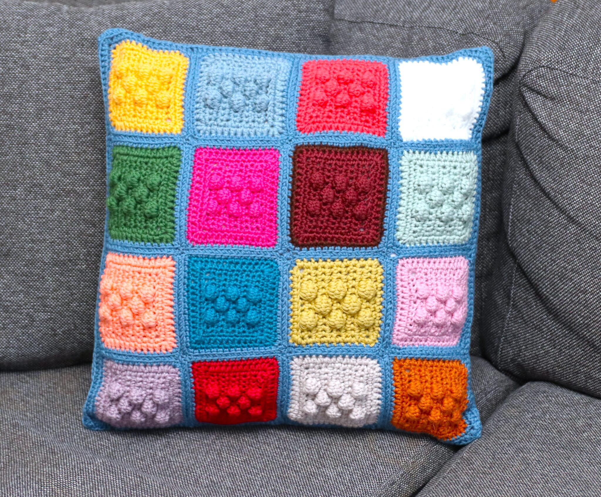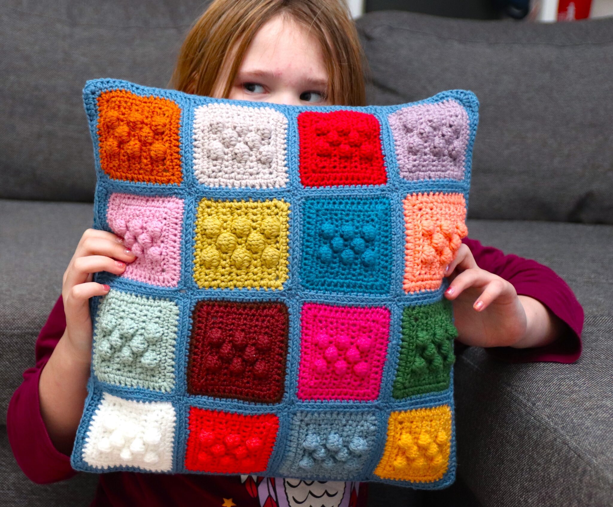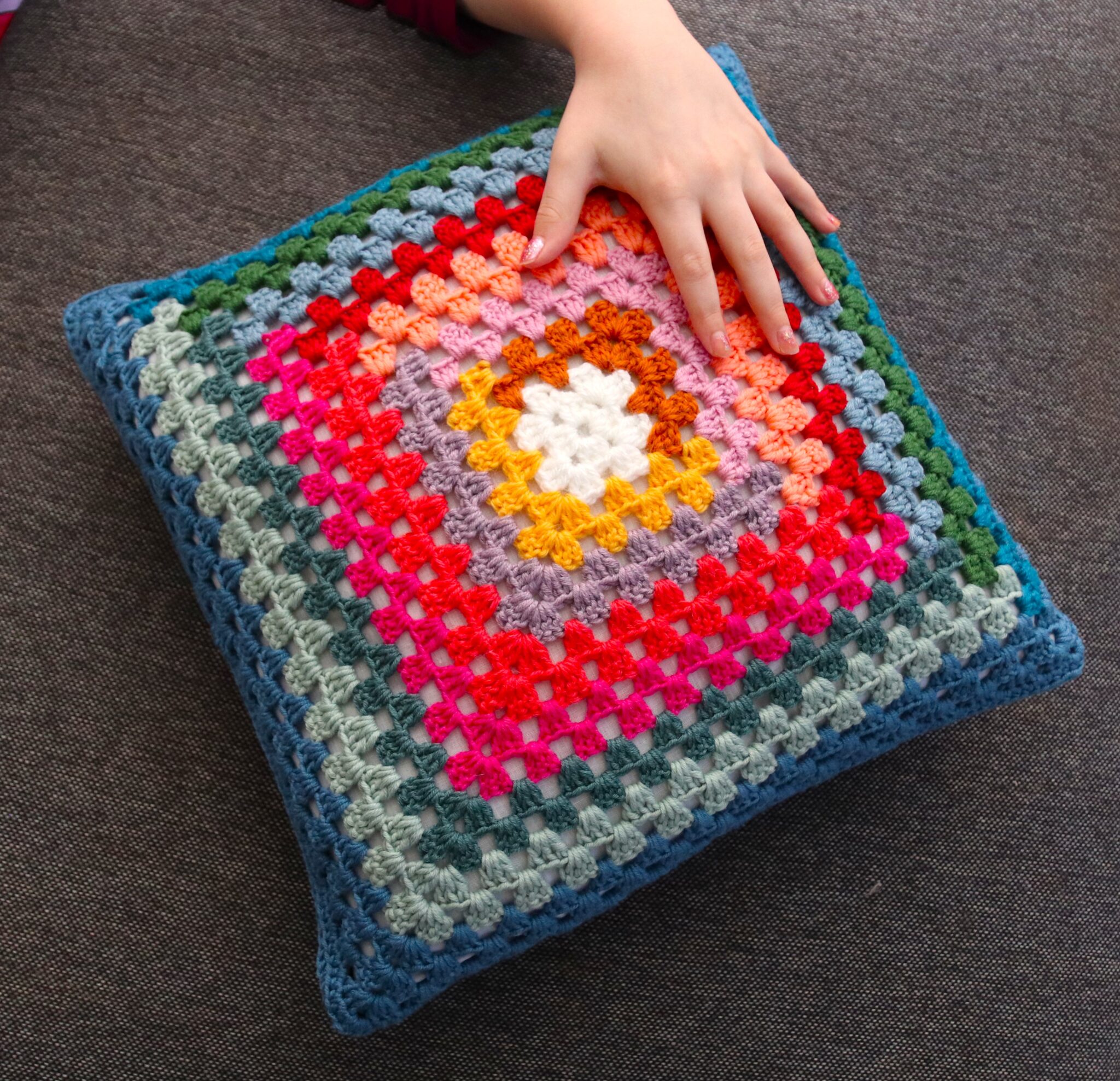 Tämän kaksipuoleisen tyynyn toisella puolella on värikäs isoäidinneliö ja toisella puolella pieniä erivärisiä nyppylätilkkuja. Hauska ja rentouttava tyyny hypisteltäväksi! 😊 Kaksipuoleinen tyyny on helppo ja nopea virkkausprojekti, johon saa kivasti upotettua vaikka jämälangat! 😊