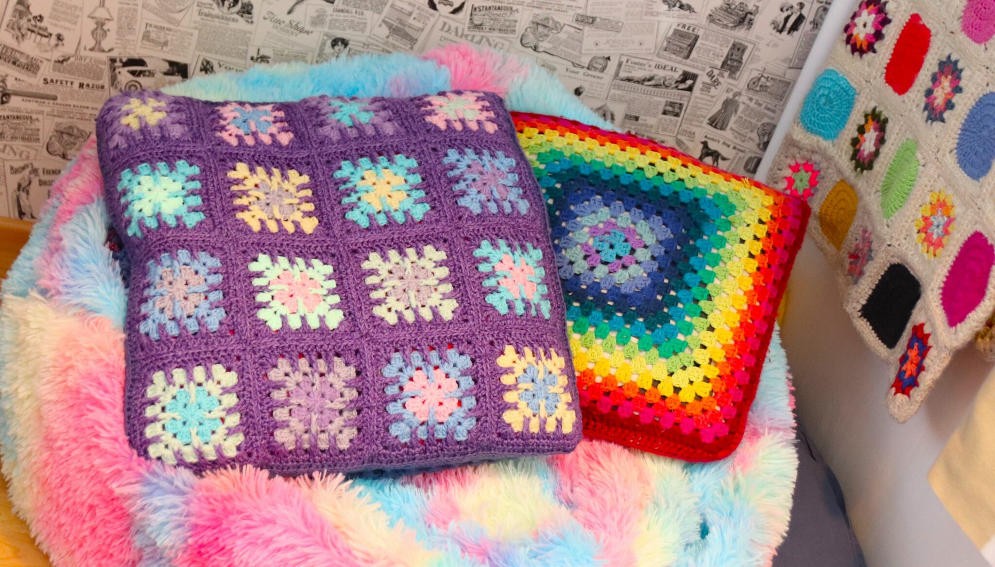 Näitä neliötilkkuja voisi kai kutsua eräänlaisiksi isoäidinneliöiden versioiksi. Jäljittelevät kuitenkin aika lailla kyseistä mallia. 😊 Tämä virkattu tyynynpäällinen oli tilaustyö; tytär halusi säkkituoliin mätsäävän koristetyynyn – ja tässä se on. 😊 Saattaa olla tulossa lisääkin näitä ”sisäisiä” tilaustöitä, joten palaan mahdollisesti asiaan seuraavassa postauksessa. 😊