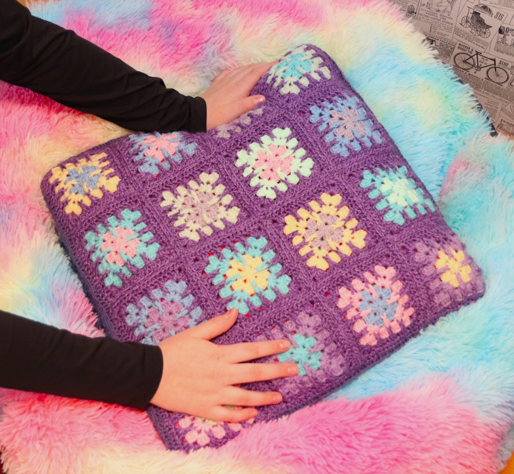 Näitä neliötilkkuja voisi kai kutsua eräänlaisiksi isoäidinneliöiden versioiksi. Jäljittelevät kuitenkin aika lailla kyseistä mallia. 😊 Tämä virkattu tyynynpäällinen oli tilaustyö; tytär halusi säkkituoliin mätsäävän koristetyynyn – ja tässä se on. 😊 Saattaa olla tulossa lisääkin näitä ”sisäisiä” tilaustöitä, joten palaan mahdollisesti asiaan seuraavassa postauksessa. 😊