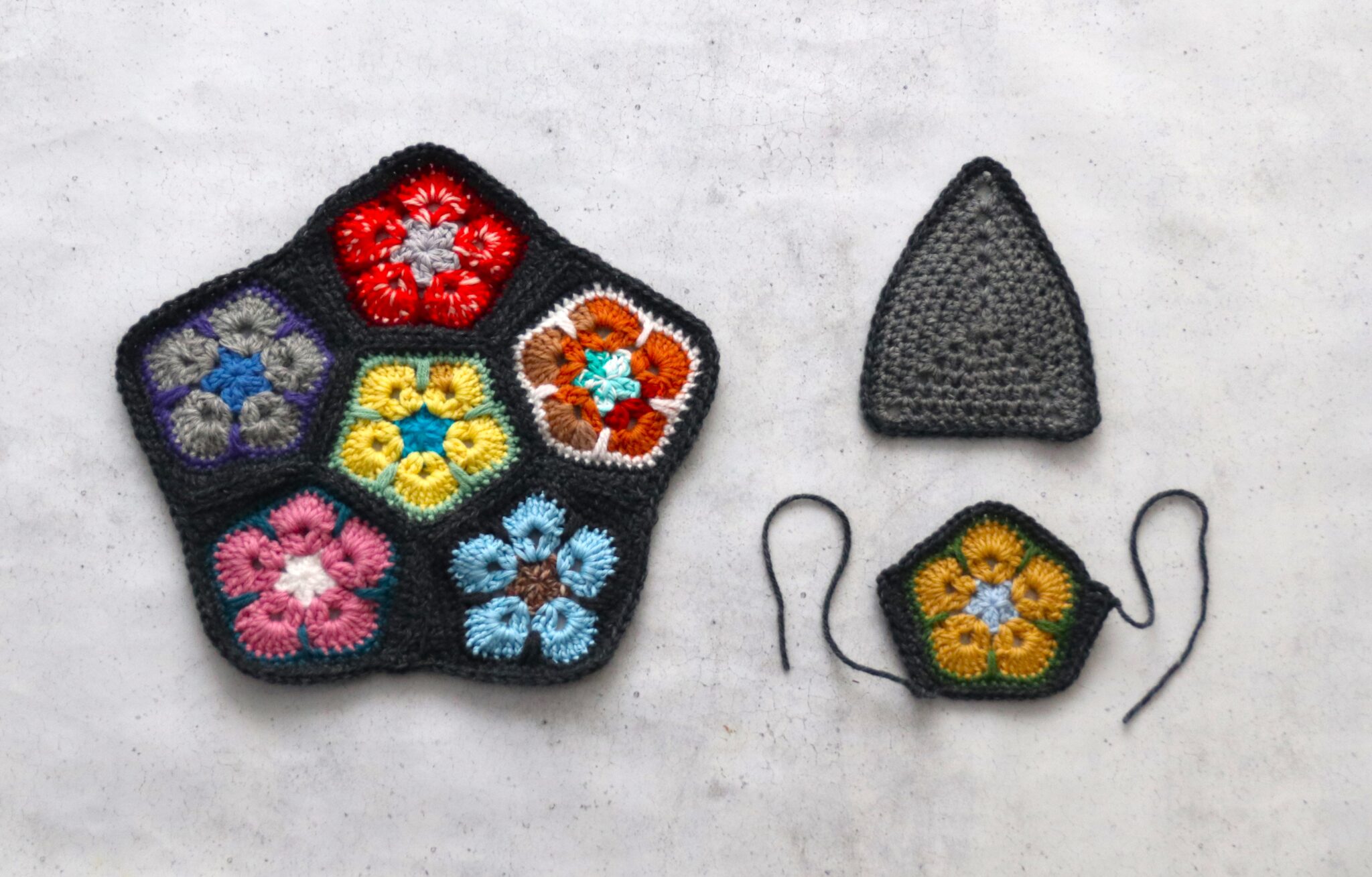 Näitä viisikulmioita virkataan yhtä keskikokoista viisikulmiota varten 6 kpl (yksi keskelle ja loput sen ympäri). Jotta viisikulmiot ”taipuvat” kauniisti keskimmäisen ympäri, tulee virkata jokaisen ympäröivän viisikulmion kahdelle vastakkaiselle sivulle kerrokset silmukoita.