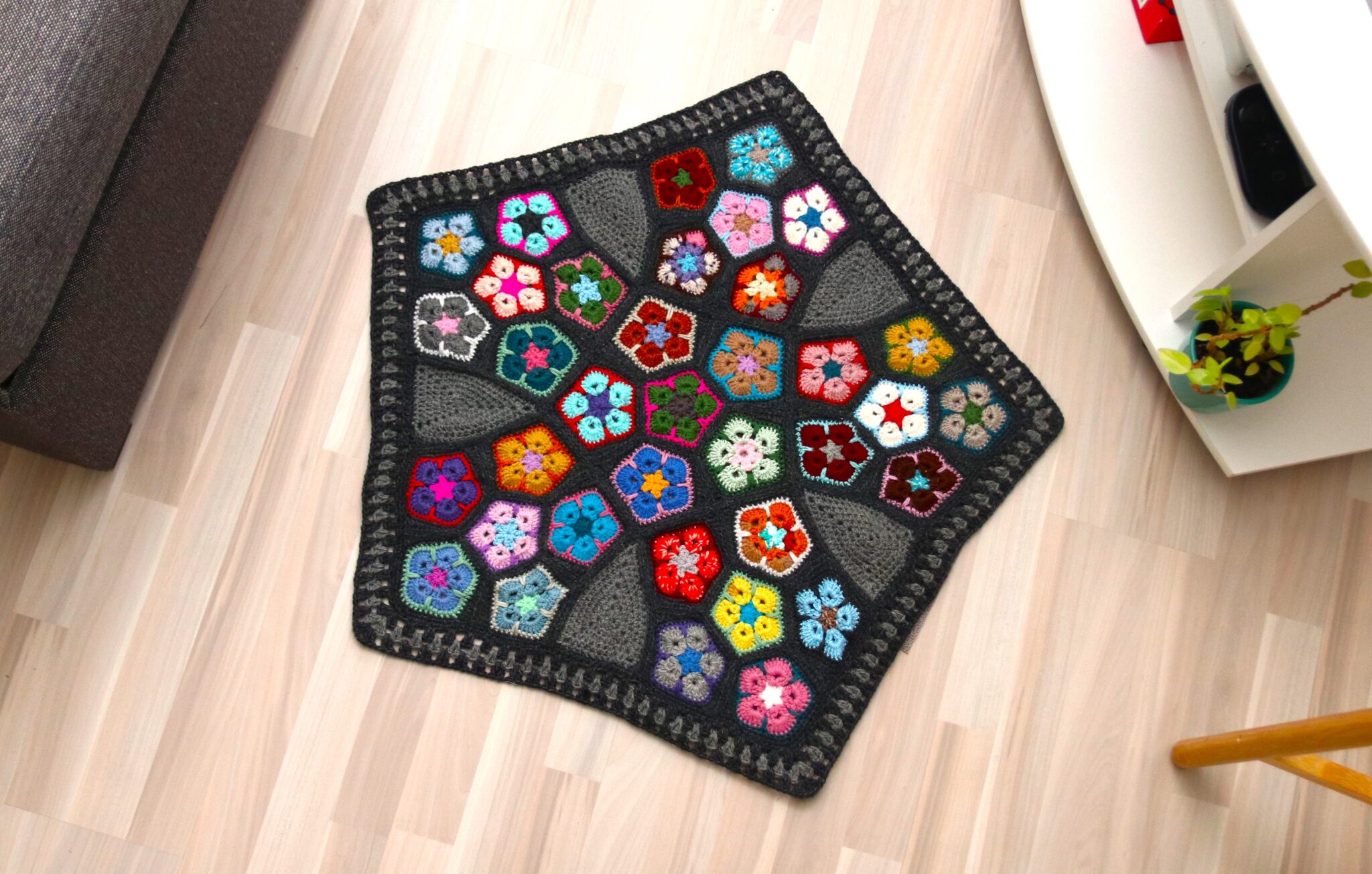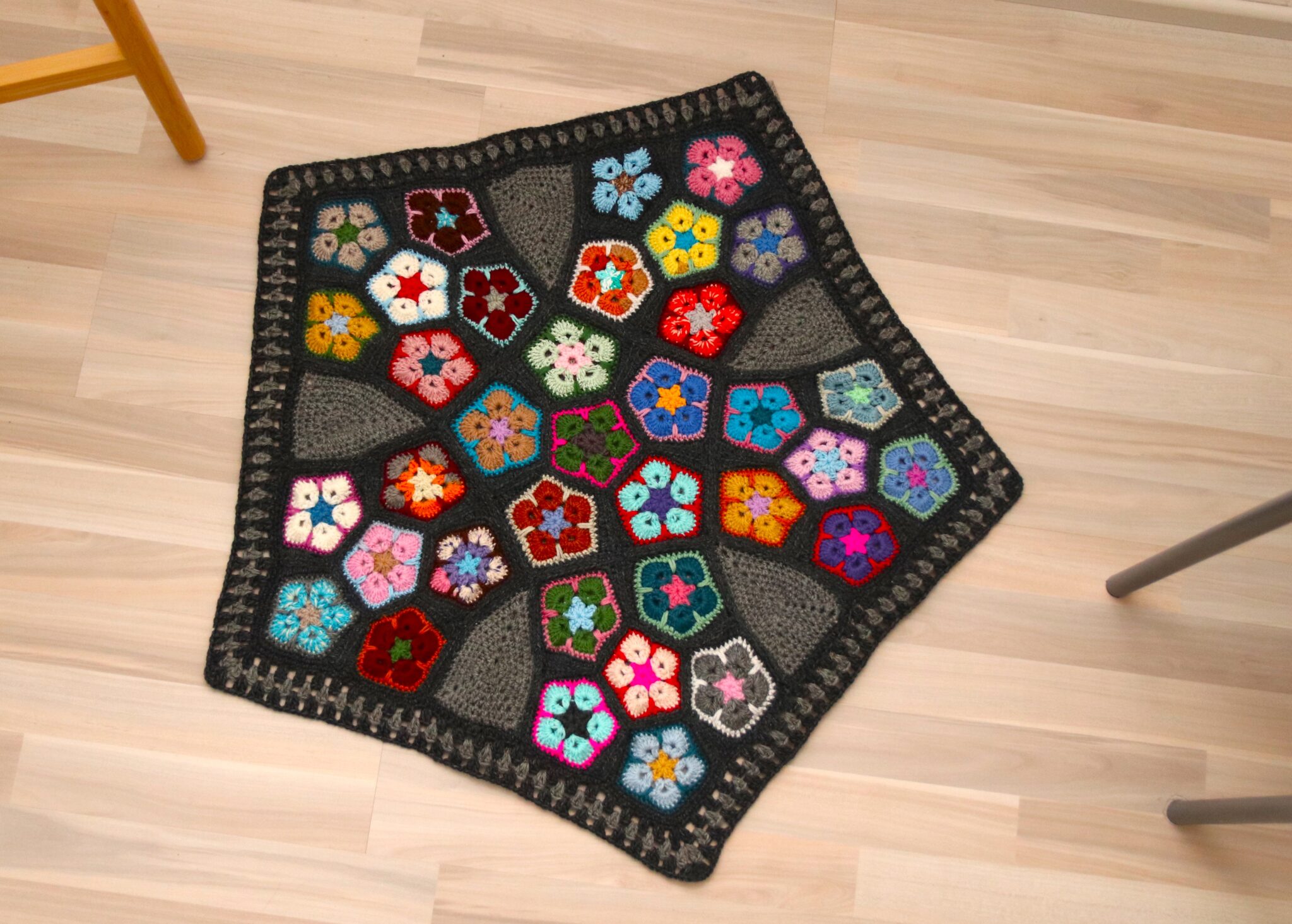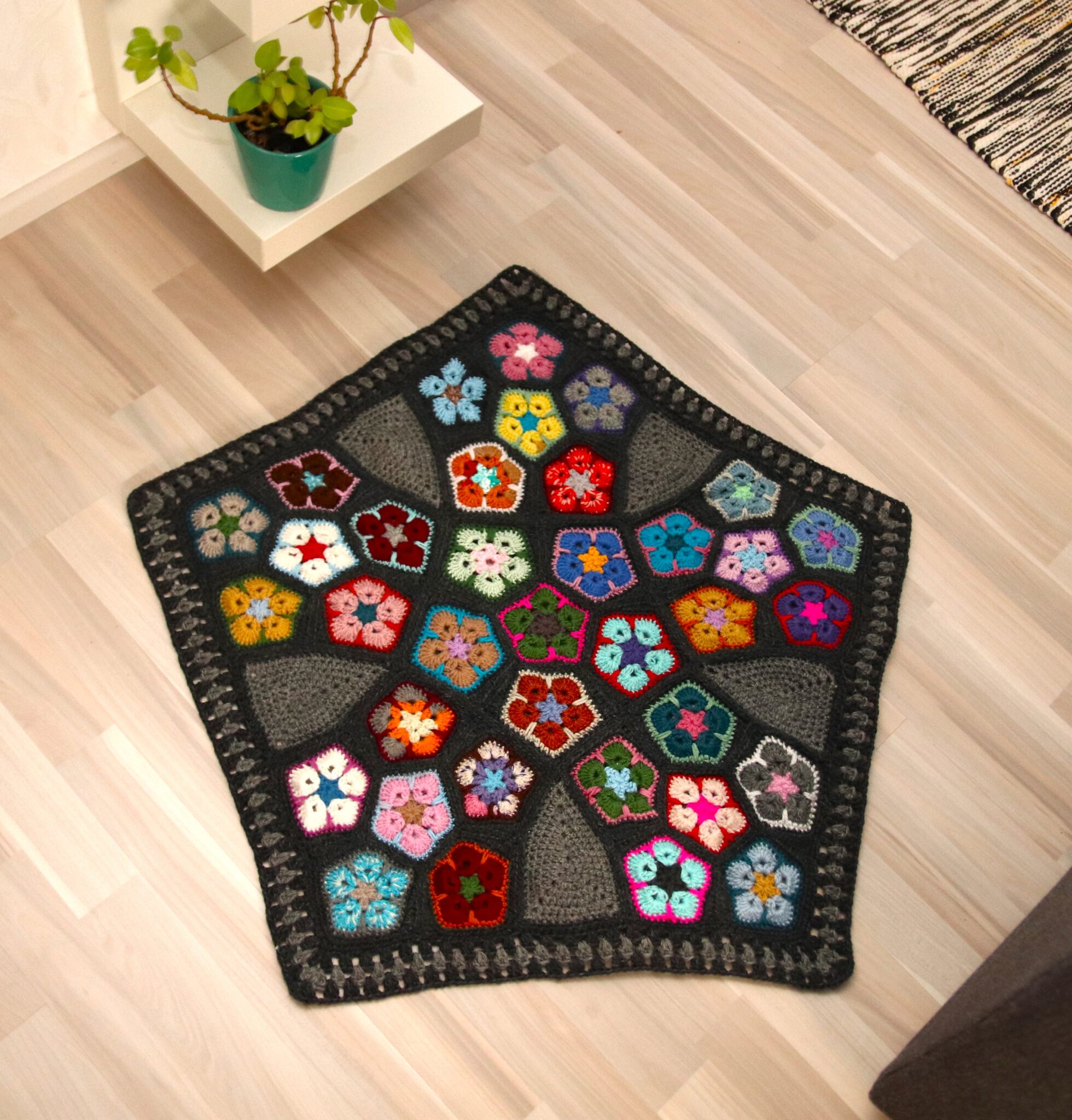 Tämä viisikulmion muotoinen matto on virkattu ja koostettu pienemmistä afrikankukkaviisikulmioista. Koska viisikulmiot eivät taivu sommitteluun yhtä helposti kuin neli- ja kuusikulmiot, vaatii tämä virkkausprojekti pieniä muokkauksia. 😊