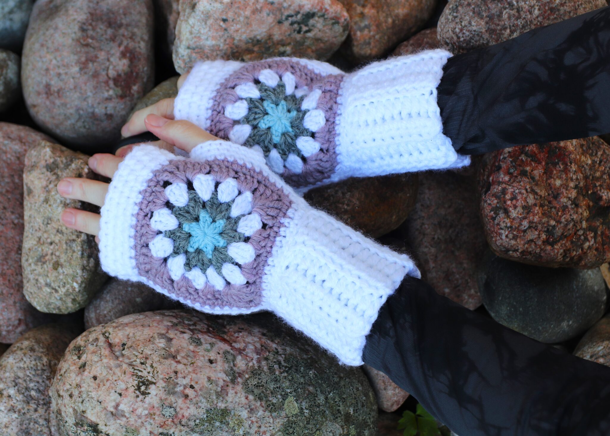 - Ranne- ja sormiosat on virkattu kaksinkertaisella langalla.