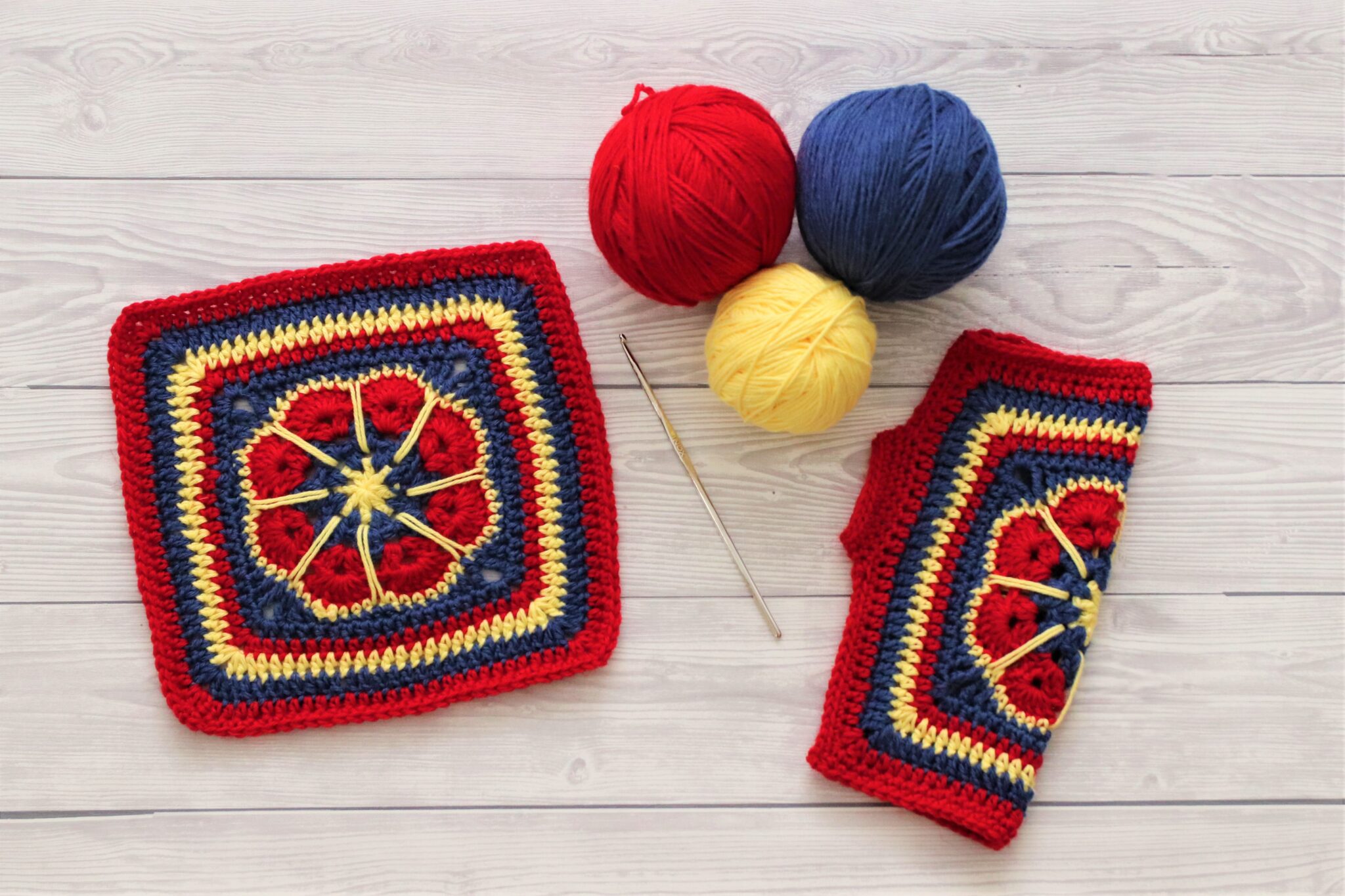 Yhdistä sisä- ja päällyspuolen tilkut toisiinsa oikealta puolelta piilosilmukoilla. Toinen sivu tulee kokonaan umpeen, toiseen jätetään peukalolle aukko, mutta muuten umpeen, osittain tilkun alareunat ja yläreunasta vaan kulmat kiinni toisiinsa. Muista tehdä kämmekkäistä vasempaan ja oikeaan käteen ”omansa” eli se kukkapuoli kämmenen selkäpuolelle. 😊