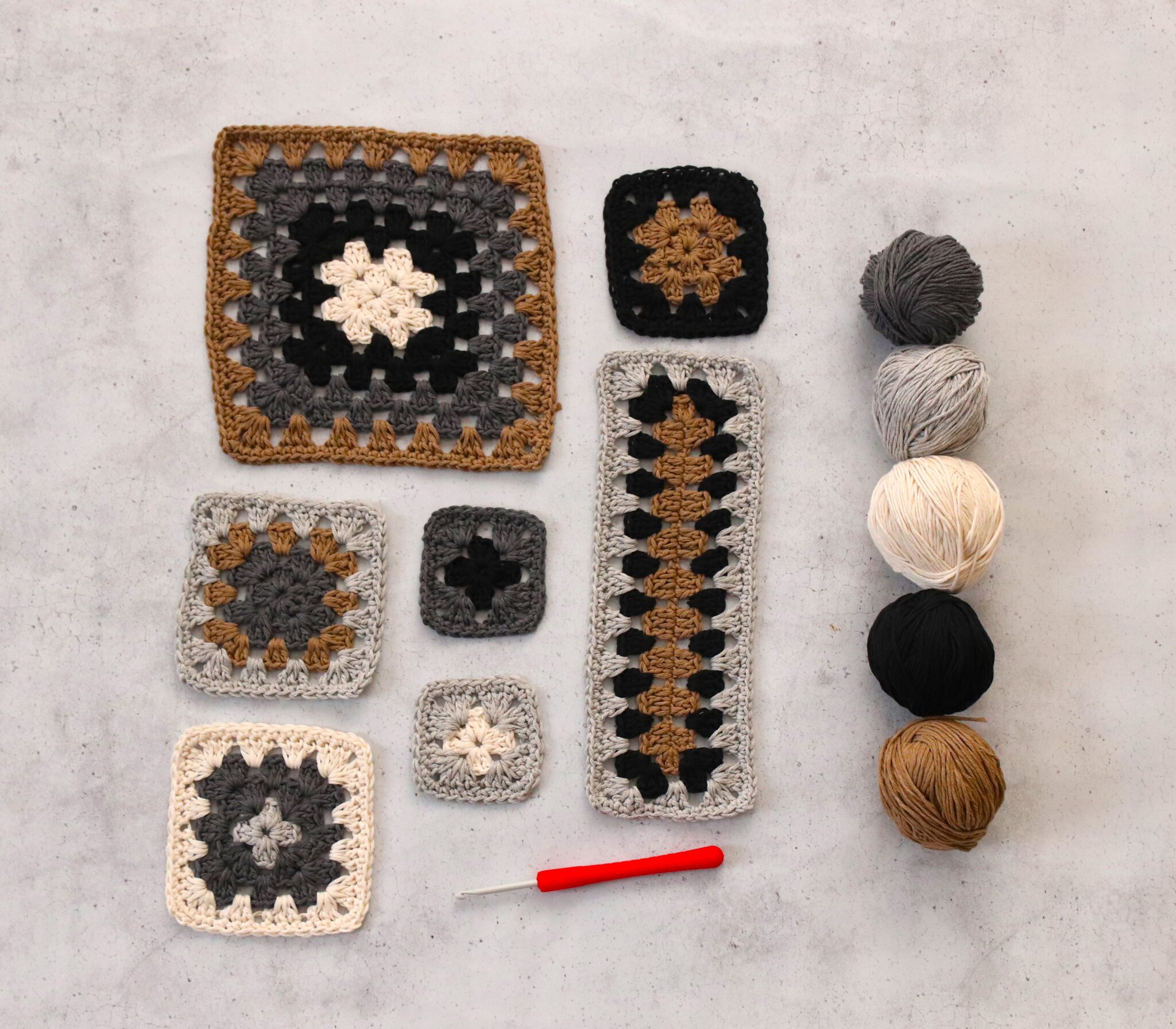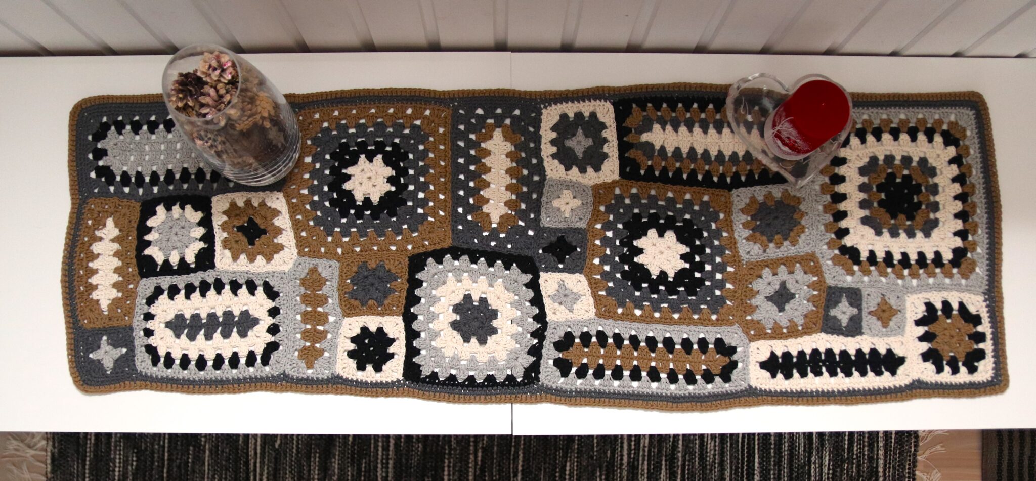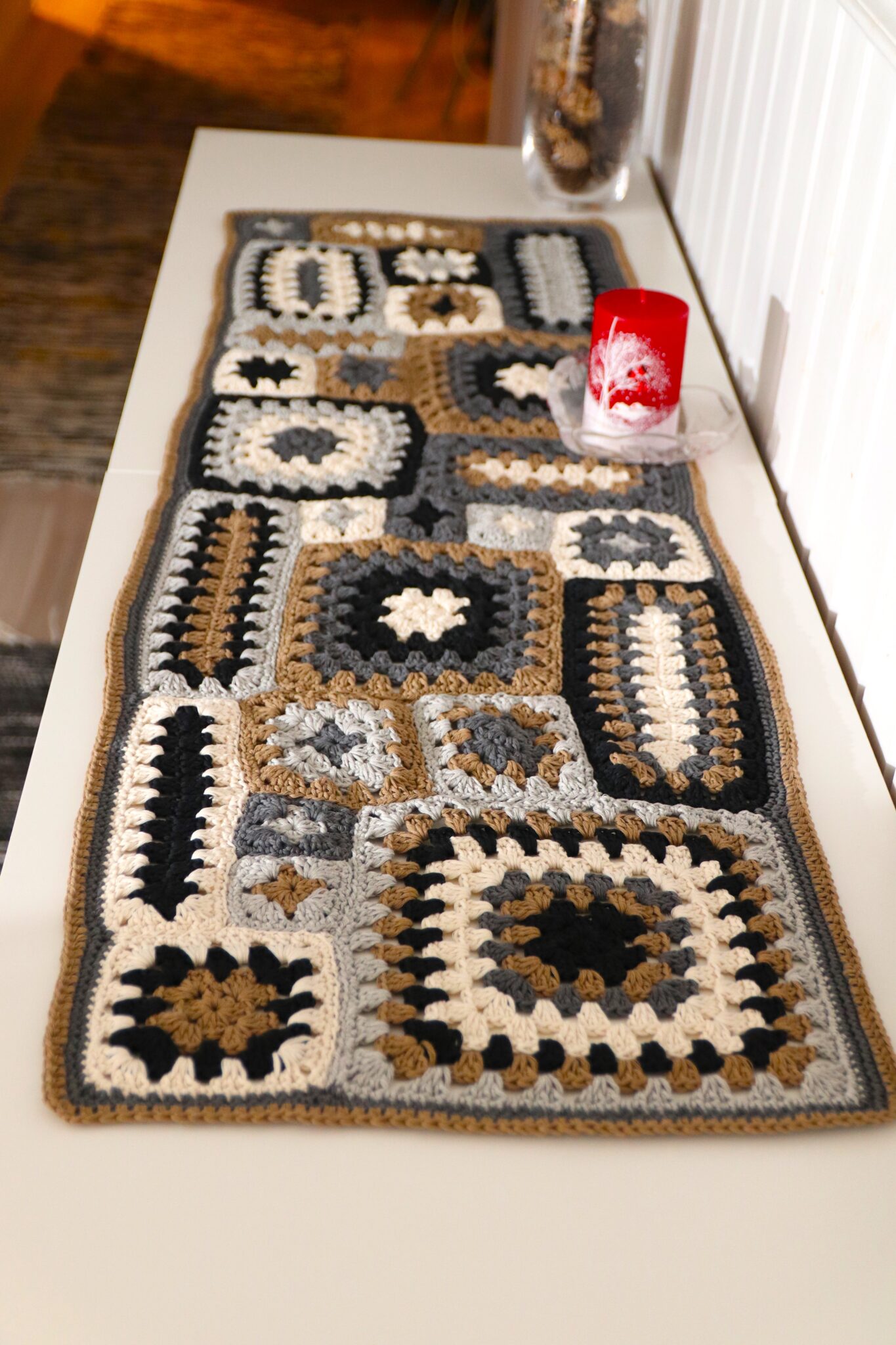 Virkattu isoäidinneliöpöytäliina on kuin iso palapeli. Liina koostuu erikokoisista neliöistä ja suorakulmioista, jotka on aseteltu limittäin ja lomittain sopimaan toistensa kylkeen. 😊