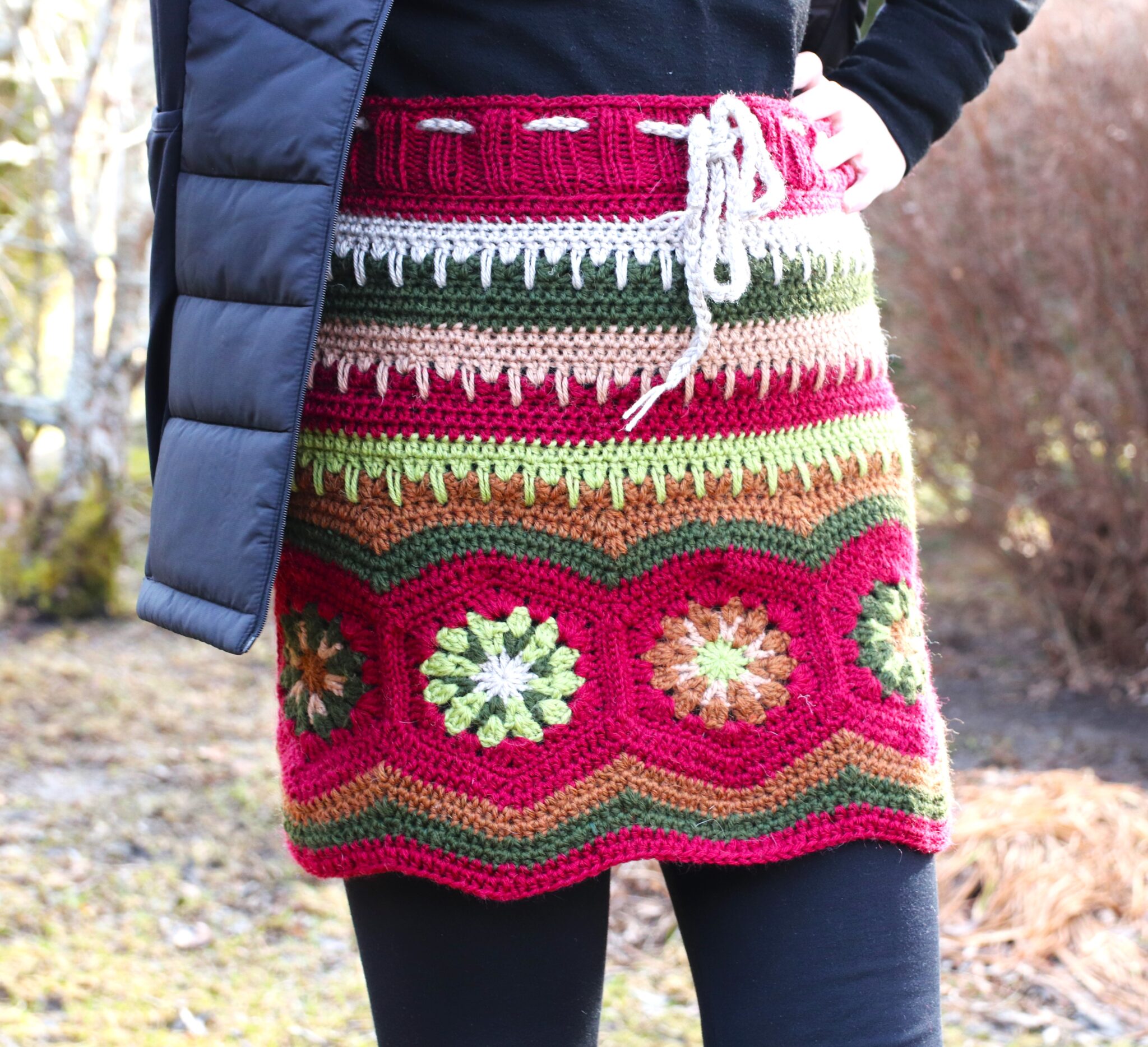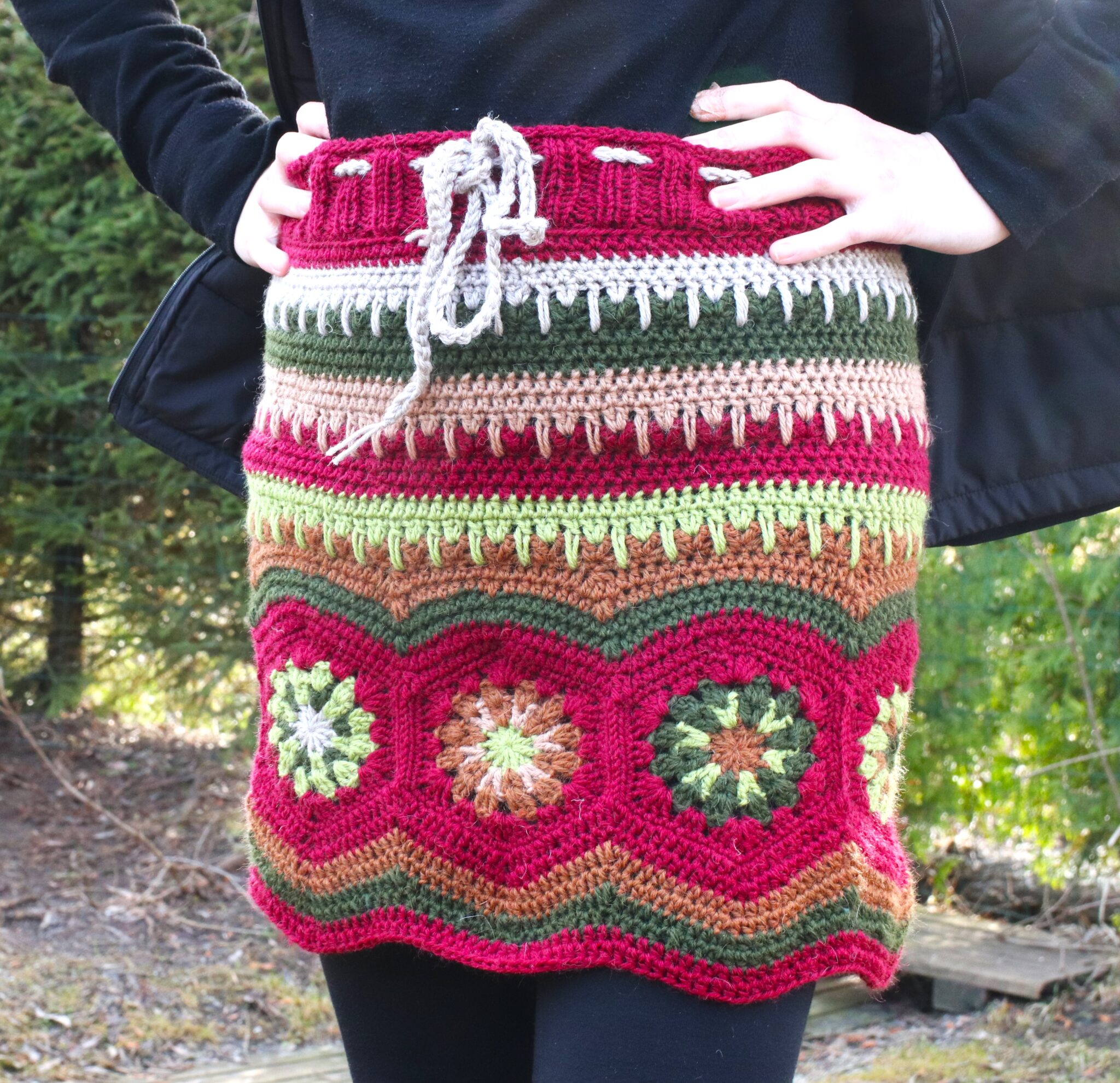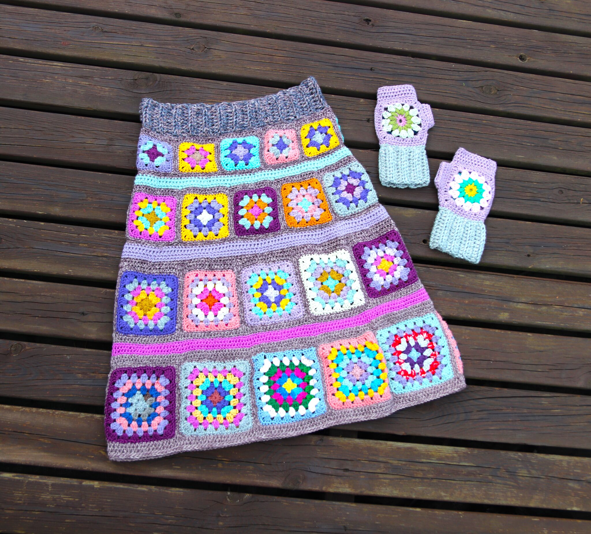 Itse aloitin ensin virkkaamalla sen tilkkukerroksen, jossa isoäidinneliössä on 4 pylväskerrosta. Kun nämä tilkut ommellaan yhdeksi ”isoksi renkaaksi” ja se menee lantion kohdalta hyvin niin koko on oikea. Mutta toki kannustan, kehotan ja melkein jopa pakotan (!) sovittamaan sitä omaa hametta enemmän kuin tarpeeksi, jotta sitten ei jossain kohtaa havahdu siihen, että tuli liian löysä tai liian kapea…