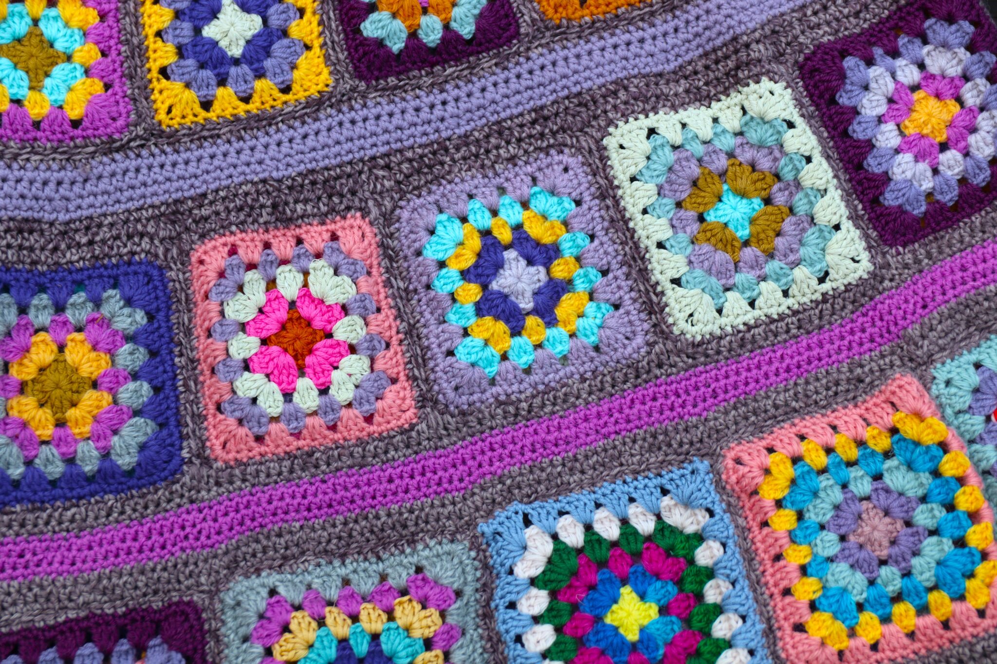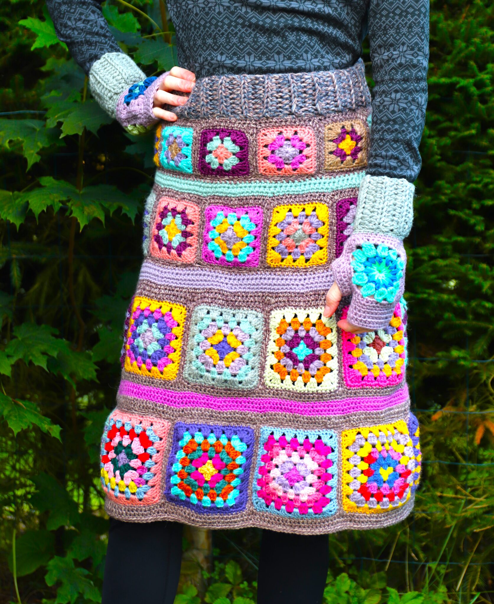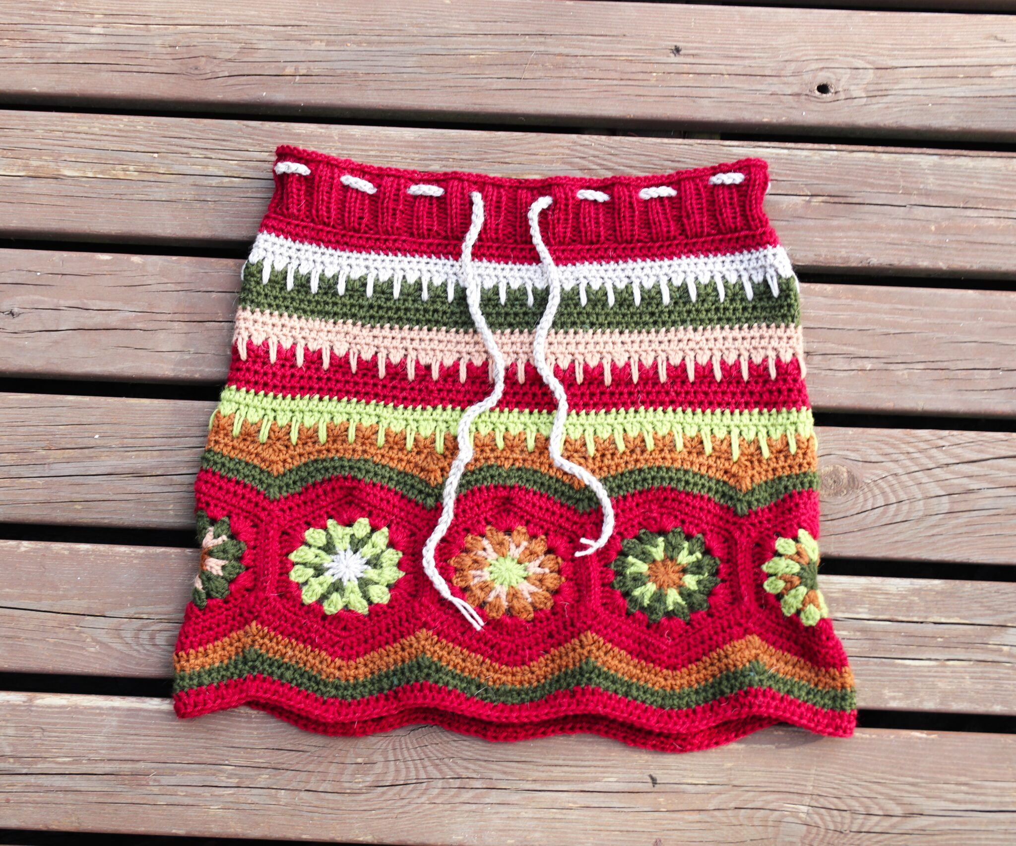 Itse aloitin ensin virkkaamalla sen tilkkukerroksen, jossa isoäidinneliössä on 4 pylväskerrosta. Kun nämä tilkut ommellaan yhdeksi ”isoksi renkaaksi” ja se menee lantion kohdalta hyvin niin koko on oikea. Mutta toki kannustan, kehotan ja melkein jopa pakotan (!) sovittamaan sitä omaa hametta enemmän kuin tarpeeksi, jotta sitten ei jossain kohtaa havahdu siihen, että tuli liian löysä tai liian kapea…