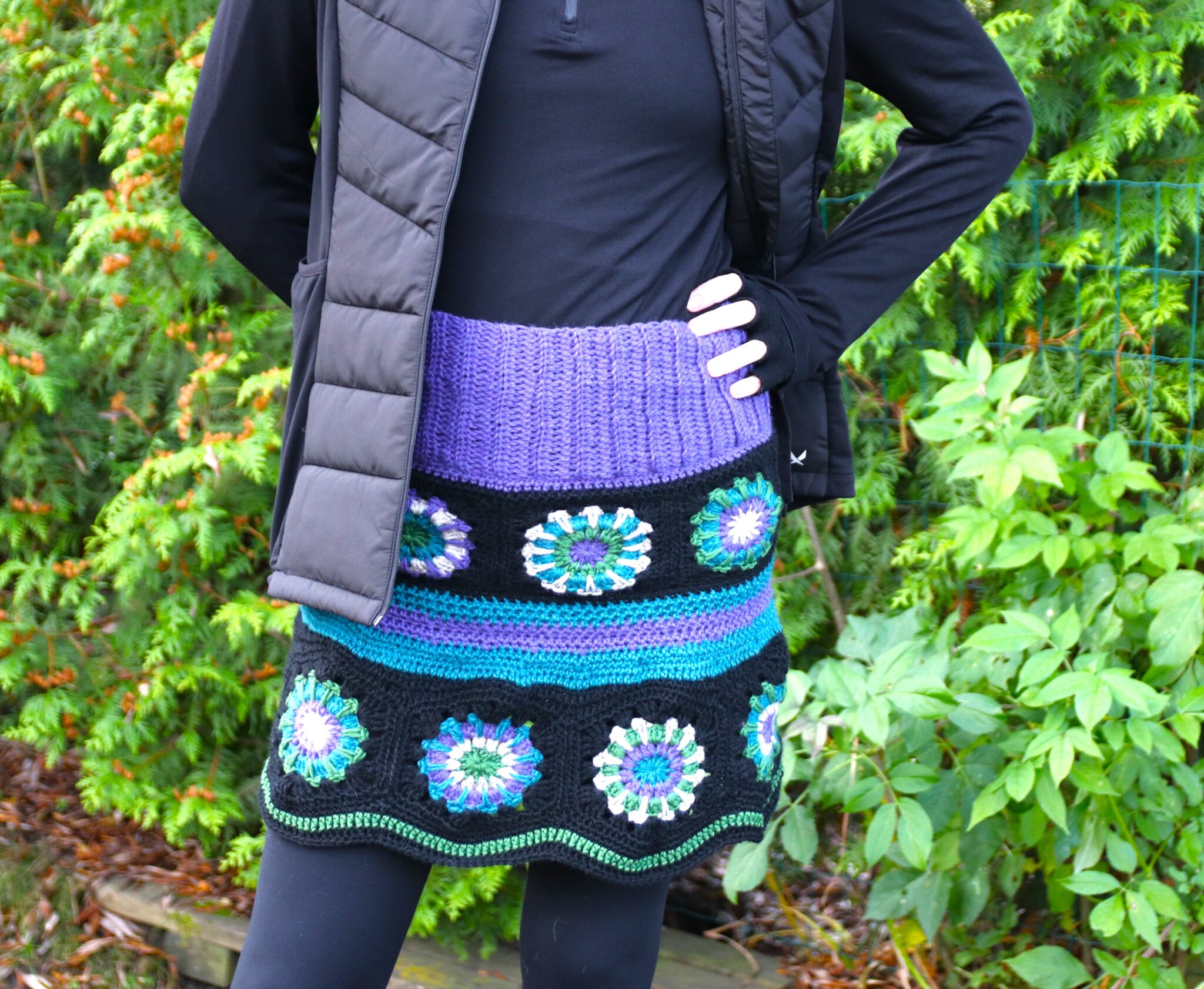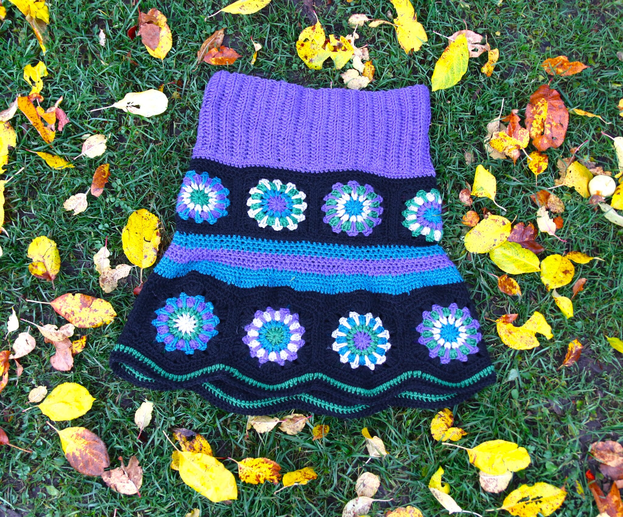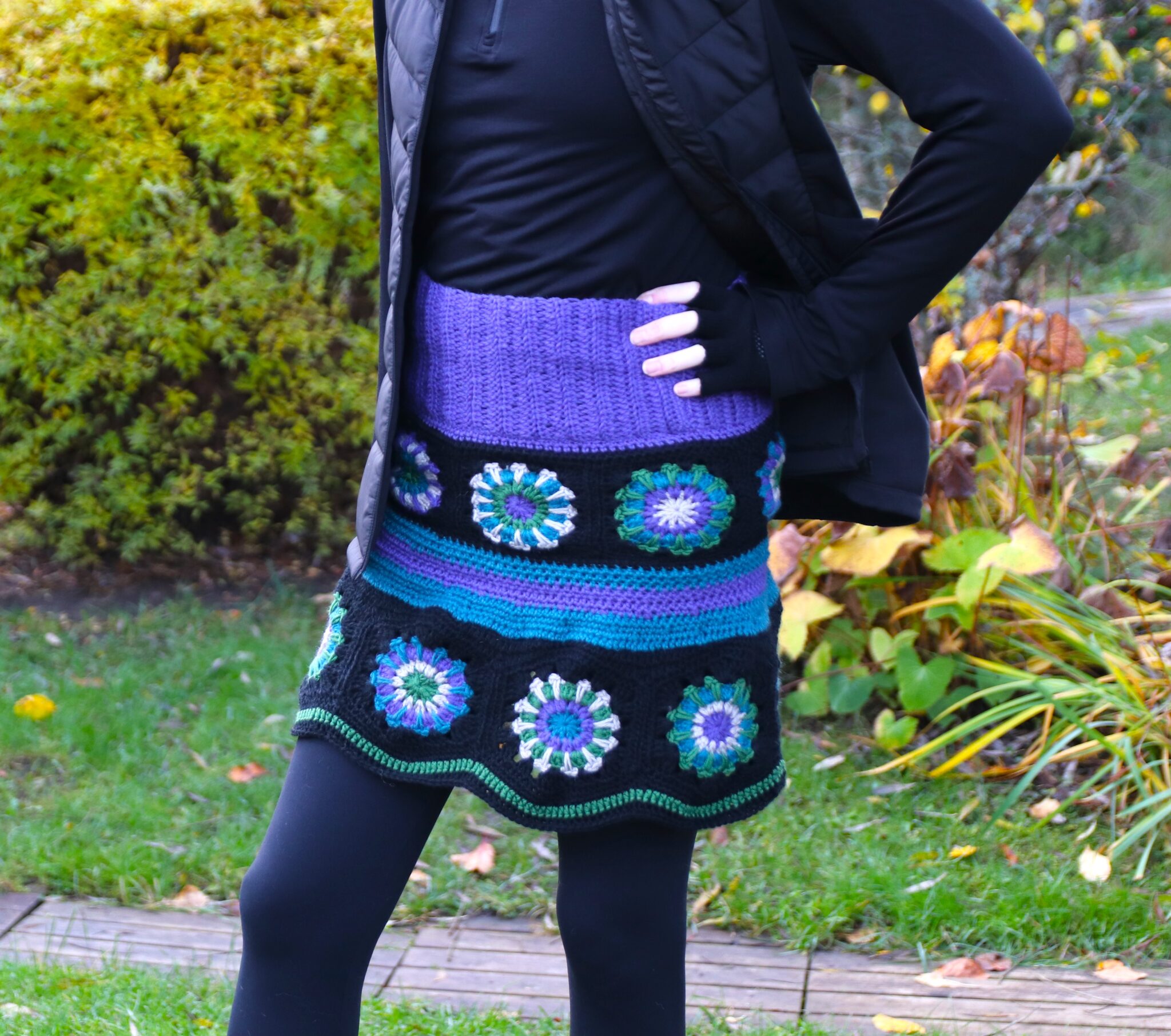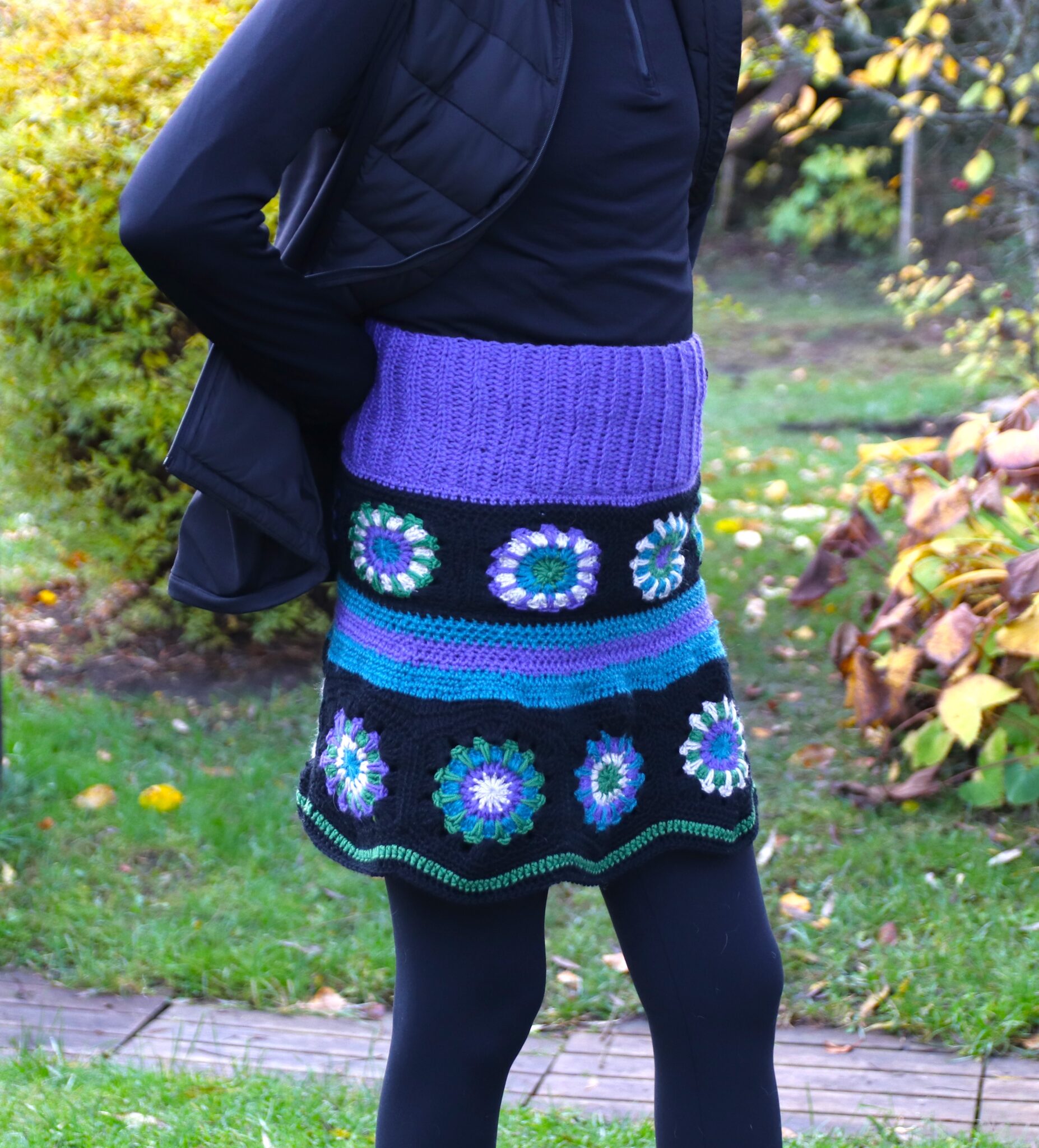 Pointtihan on se, että nämä helmaosan virkatut tilkut ommellaan toisiinsa kiinni yhdeksi ”isoksi renkaaksi” ja sen tulisi mennä lantion/leveimmän kohdan ympäri – mielellään niin, ettei kiristä (mutta toisaalta ettei nyt roikukaan…)