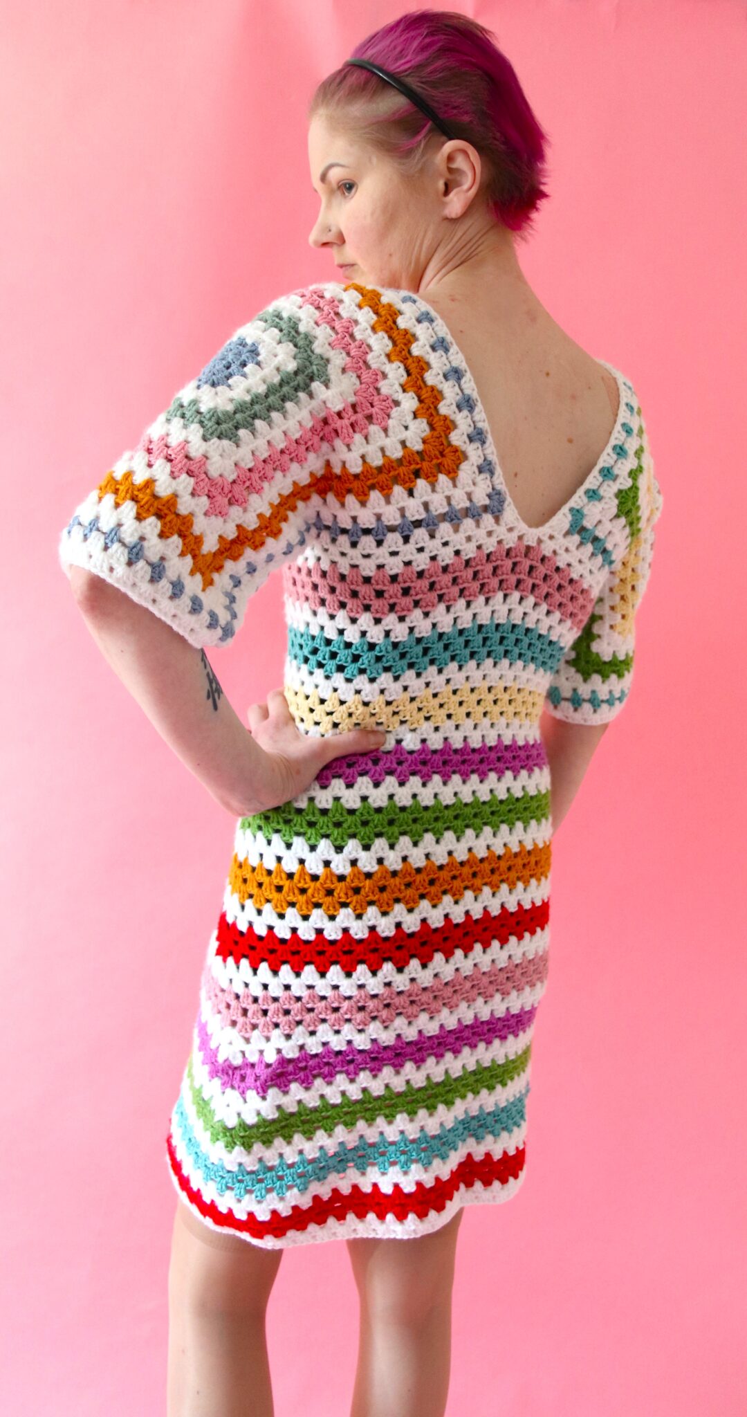 Tämä mekko ”lähtee liikkeelle” hihoista, jotka ovat siis isoja isoäidinneliöitä. Kun siitä lähdetään jatkamaan alaspäin, on meillä yht’äkkiä käsissä mekko – ja vaikka sanonkin niin pirun hyvännäköinen!