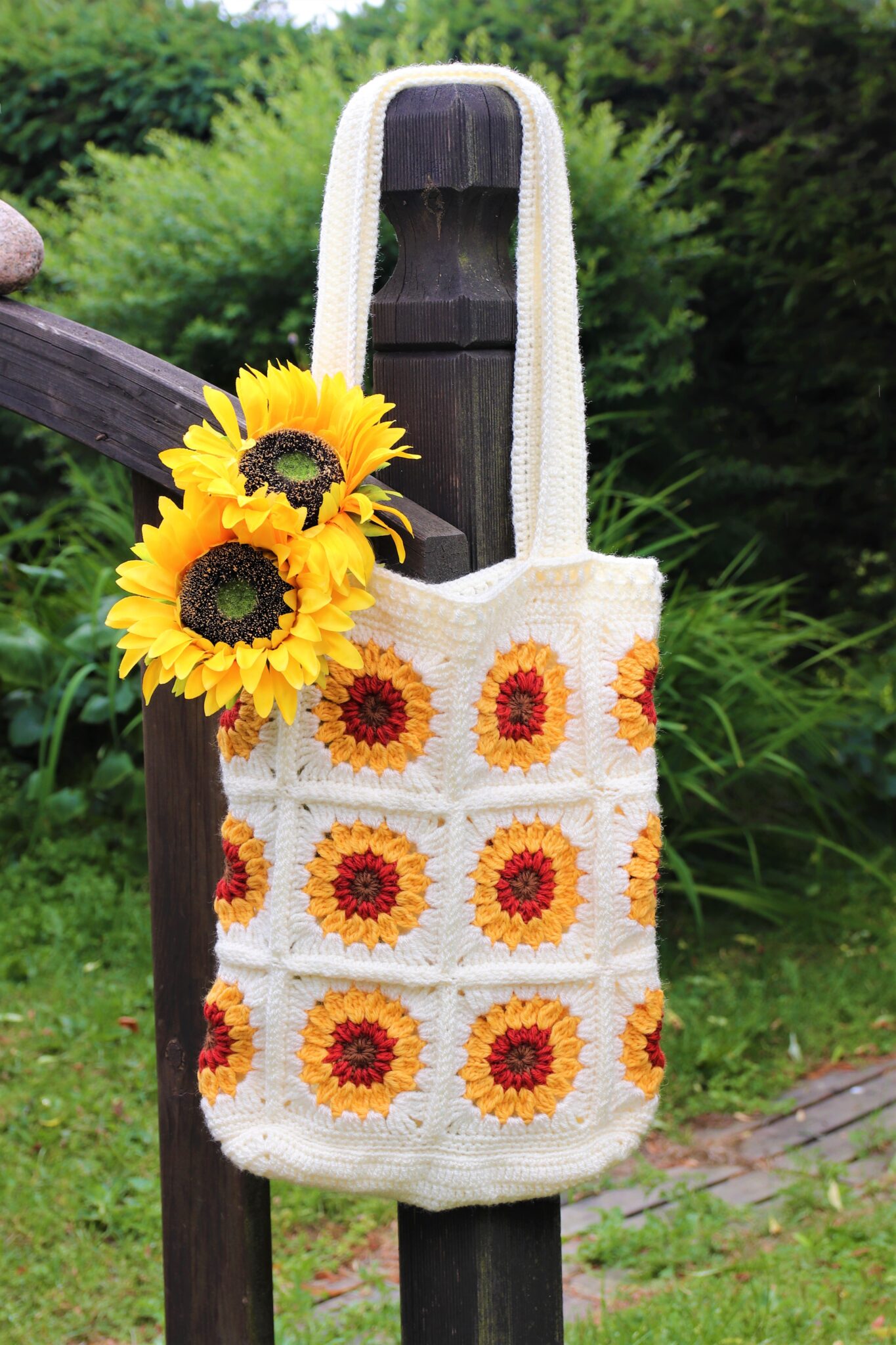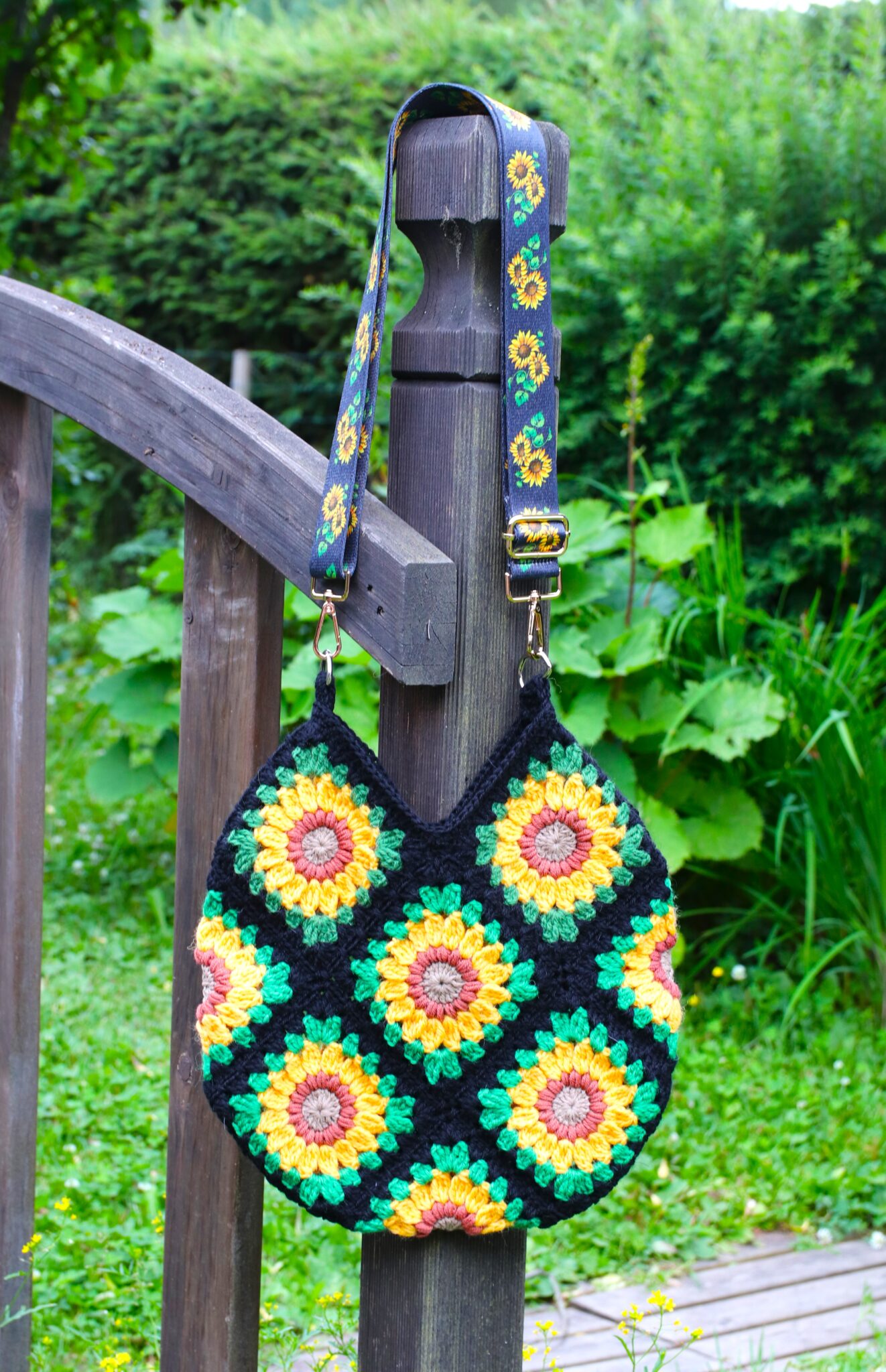 Tänä kesänä on somevirrassa näkynyt paljon tämän muotoisia virkattuja laukkuja. Joko isoäidinneliöillä tai tällä sunburst -kukkatilkulla. 😊 Sattuipa vielä omista kätköistä löytymään tuollainen kiva auringonkukkateemainen laukun olkahihna niin tämä selvä: seuraavana työlistalla oli siis virkattu auringonkukkalaukku. 😊 Näitä on tullut ennenkin tehtyä, samalla ajatuksella siis. Laitan postauksen loppuun linkit ohjeisiin. 😊