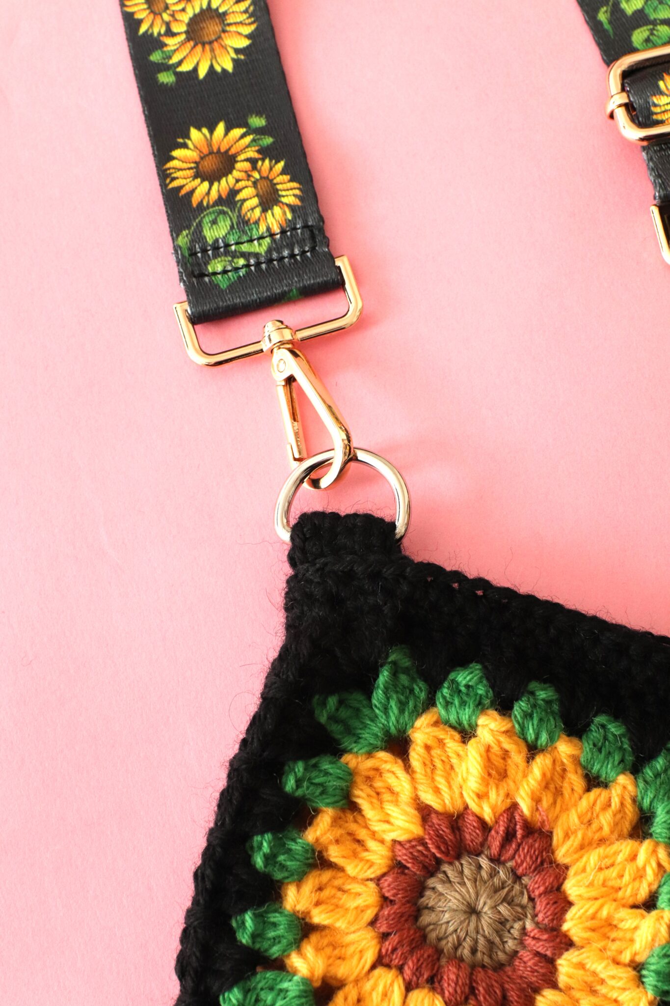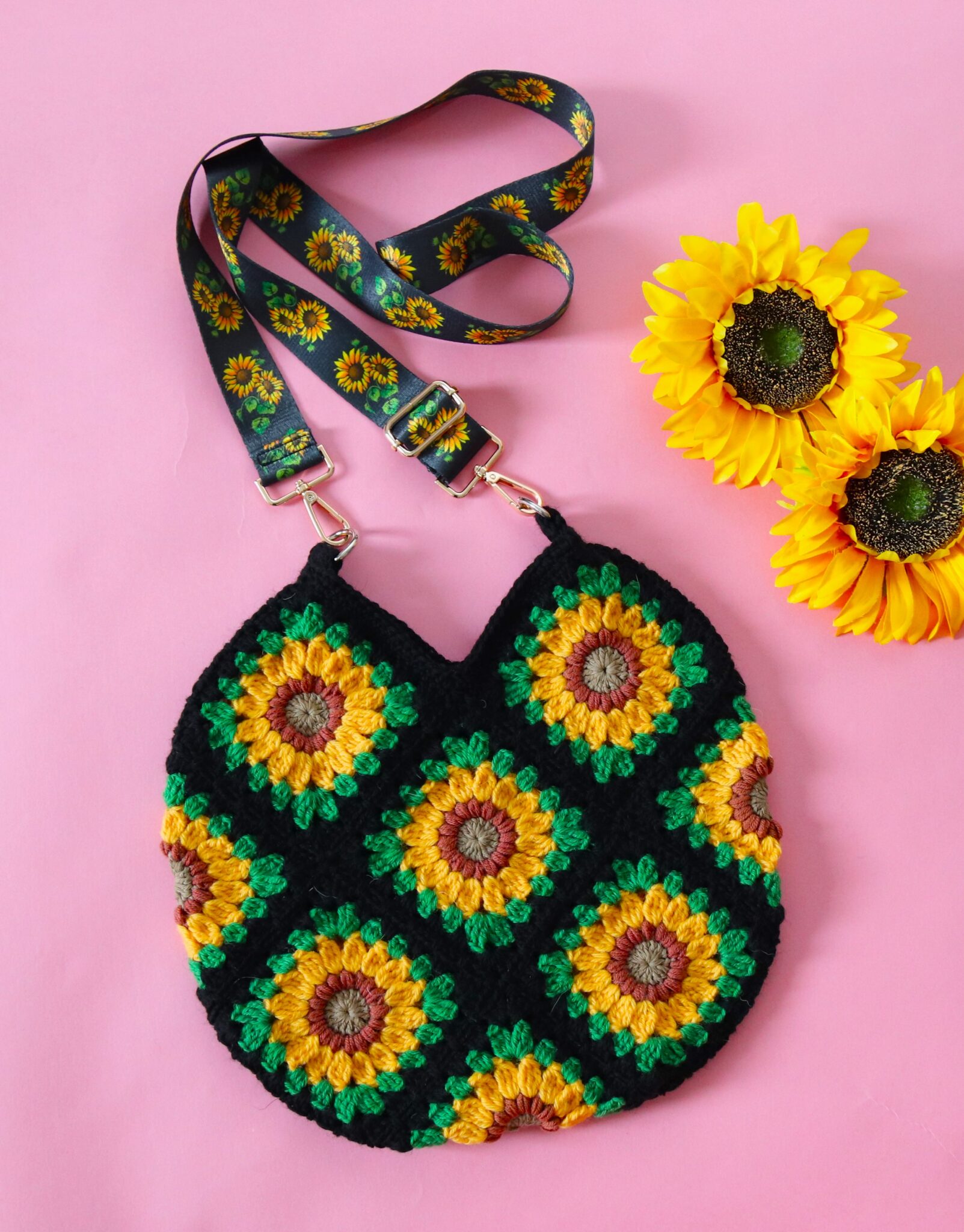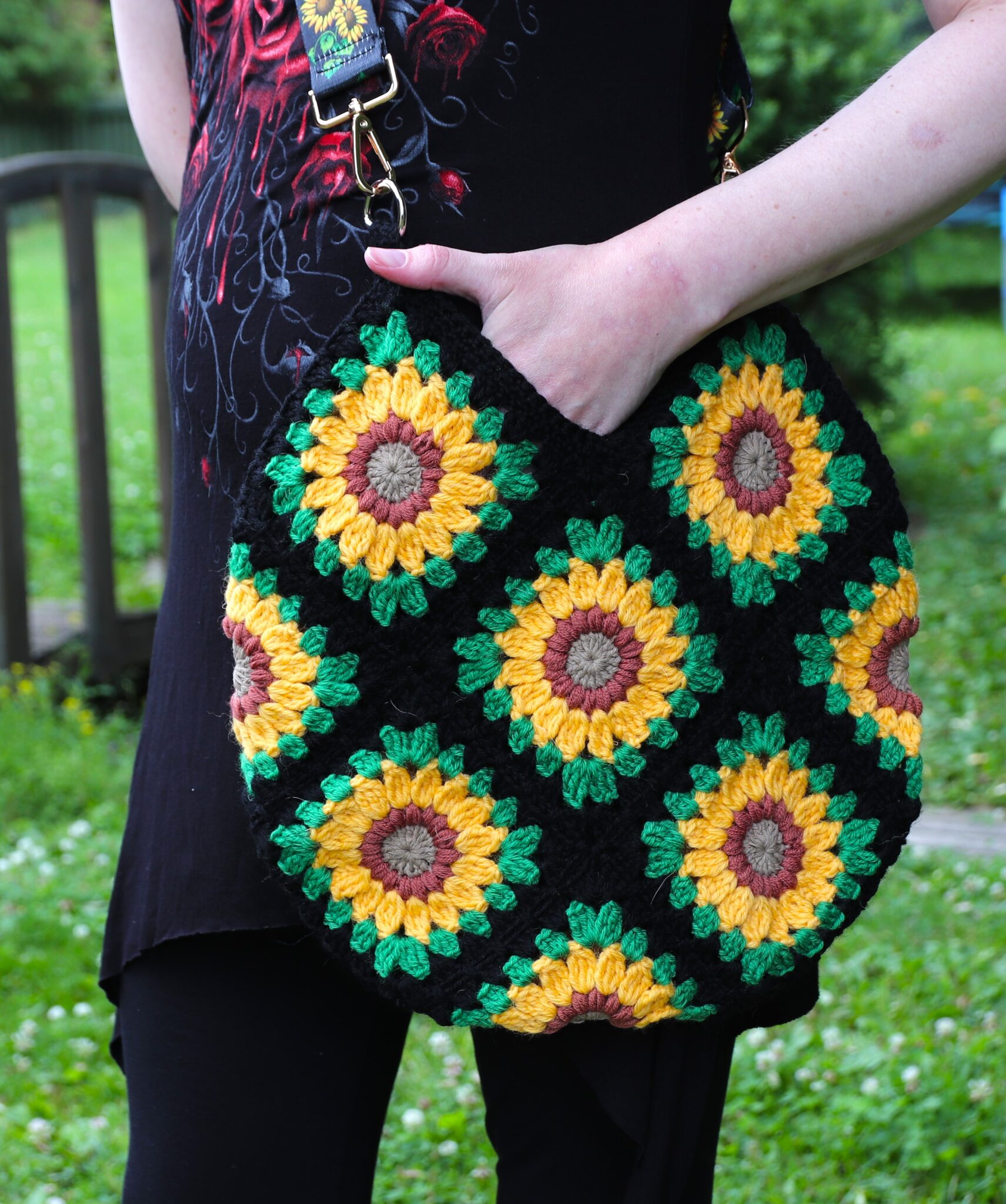 Virkattu mustapohjainen pienempi auringonkukkalaukku