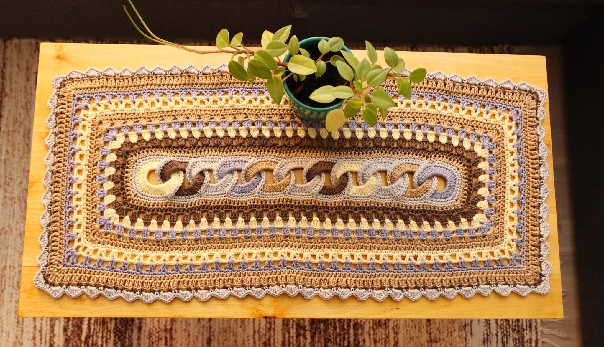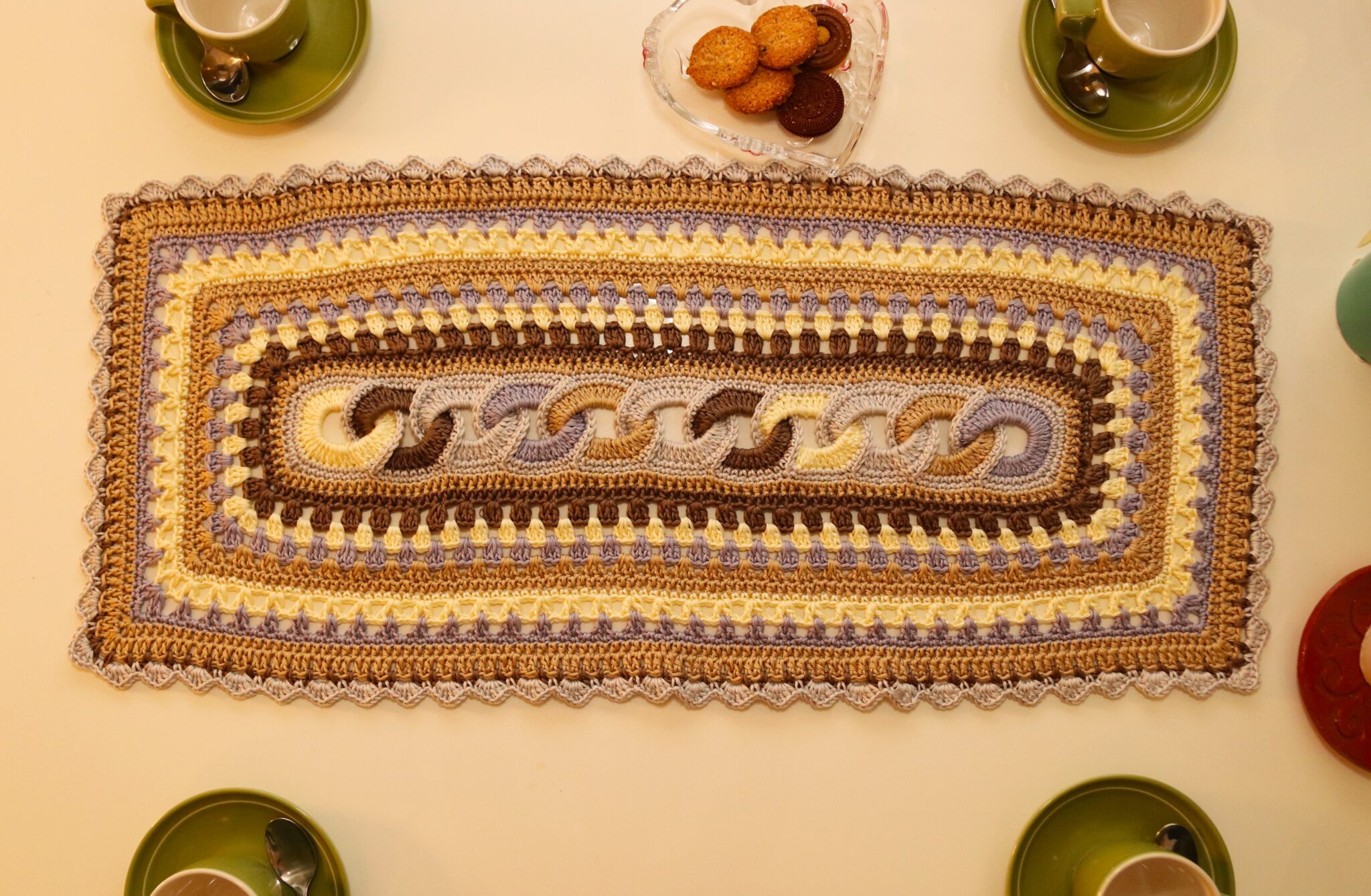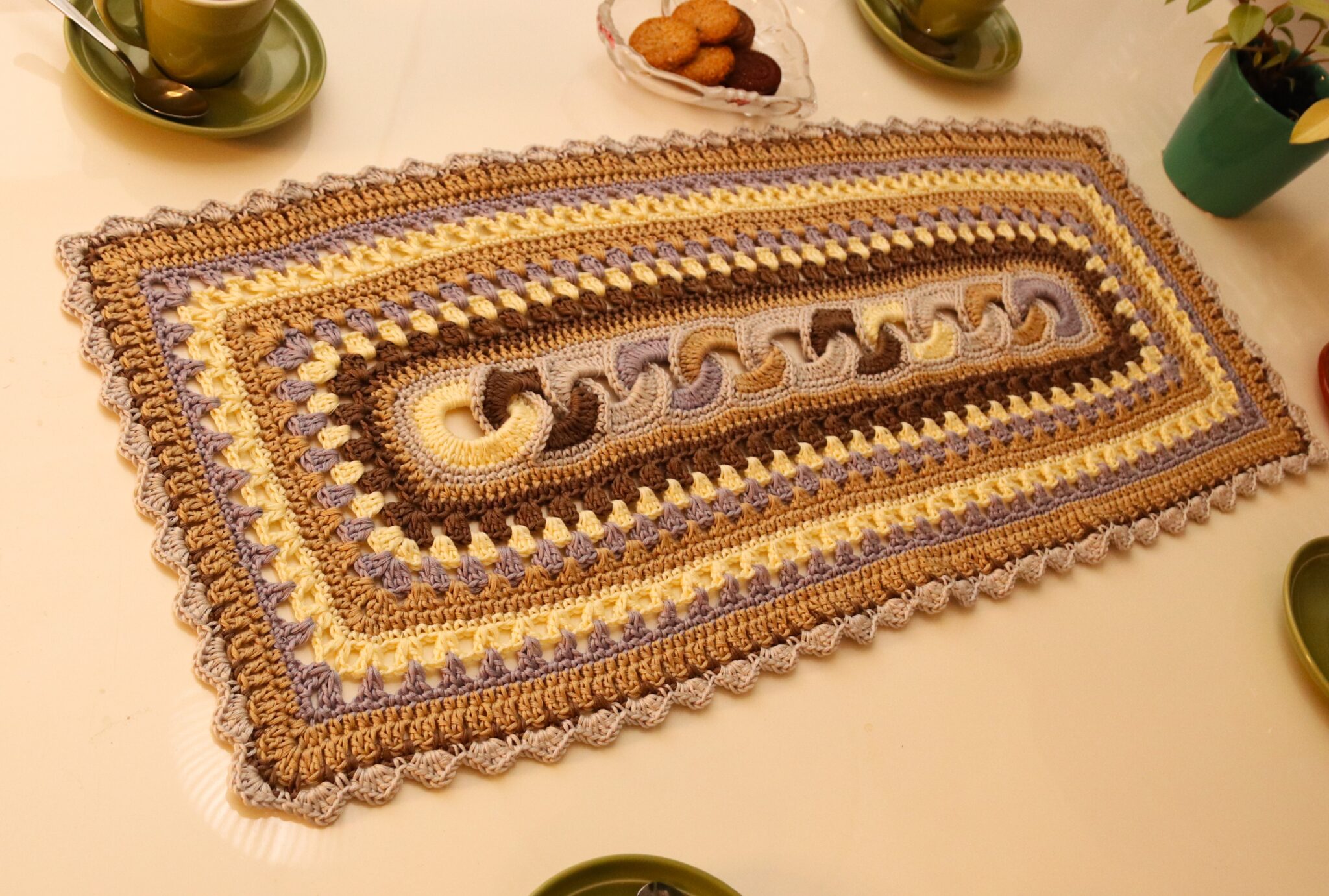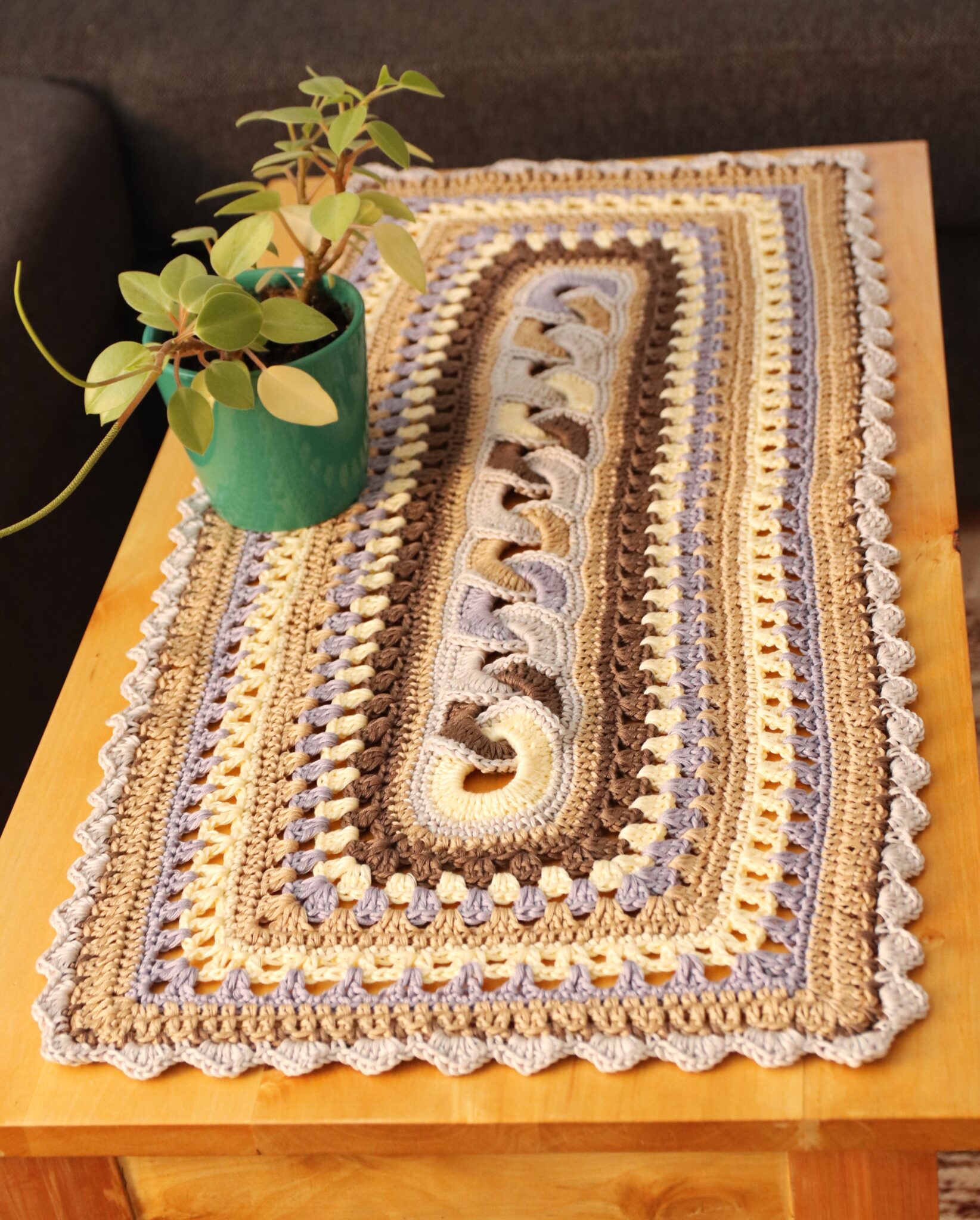 Voit kasvattaa pöytäliinan kokoa myös virkkaamalla tavallisia pylväskerroksia.