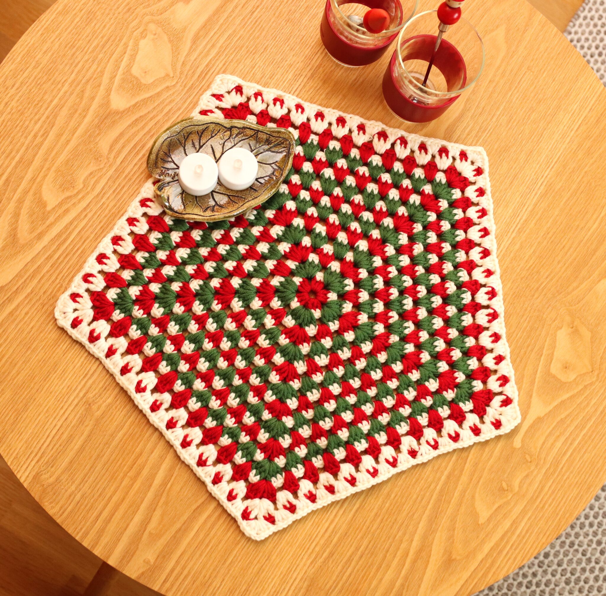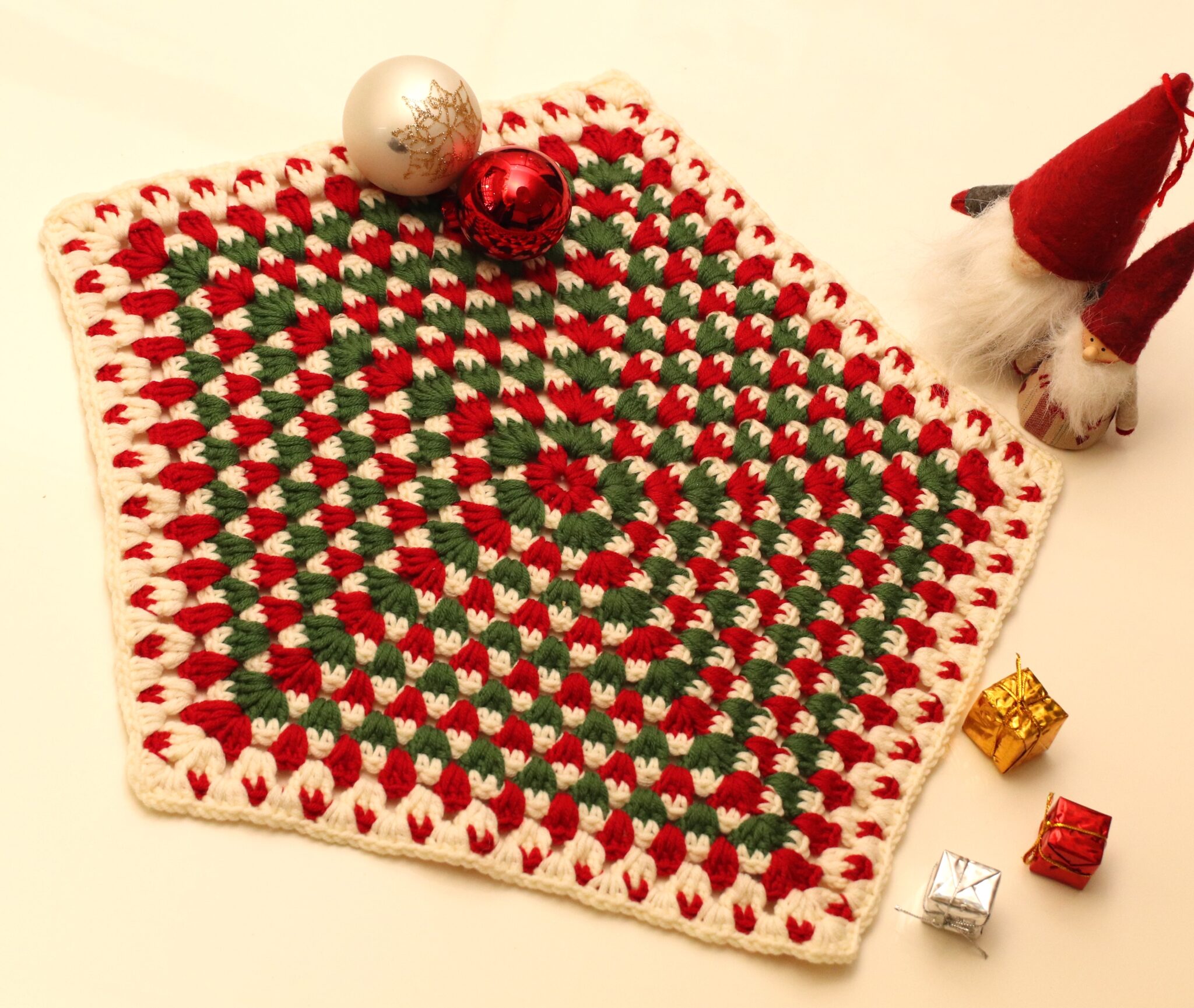 Tämä jouluinen pöytäliina on näppärä virkkausprojekti, joka valmistuu hetkessä. 😊 Virkkaa viisikulmiosta halutun kokoinen ja käytä joulun värejä. Kaunis pöytäliina tuo joulun tuntua ja asettuu kivasti vaikka pienemmänkin pöydän koristeeksi. 😊