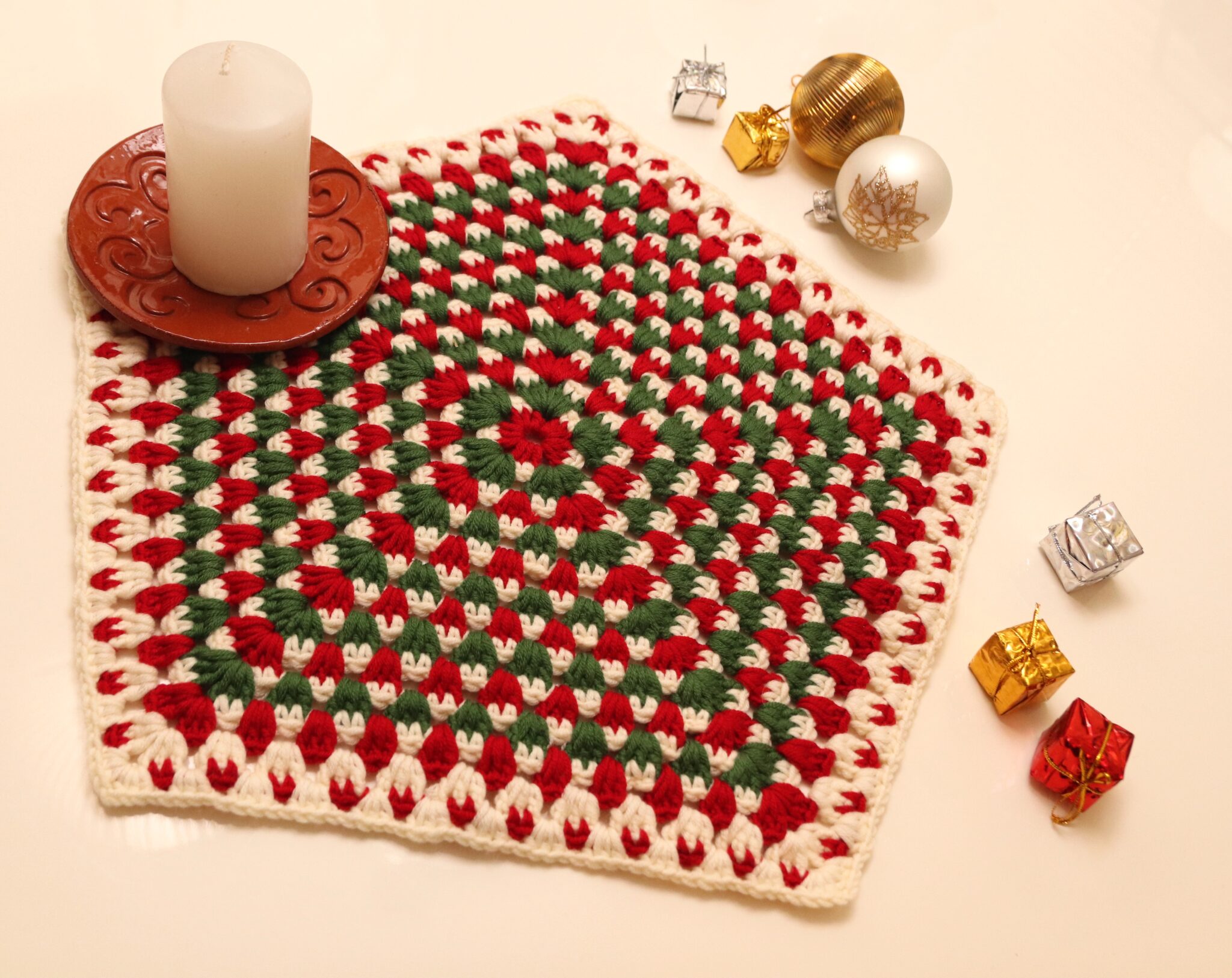 Tämä jouluinen pöytäliina on näppärä virkkausprojekti, joka valmistuu hetkessä. 😊 Virkkaa viisikulmiosta halutun kokoinen ja käytä joulun värejä. Kaunis pöytäliina tuo joulun tuntua ja asettuu kivasti vaikka pienemmänkin pöydän koristeeksi. 😊