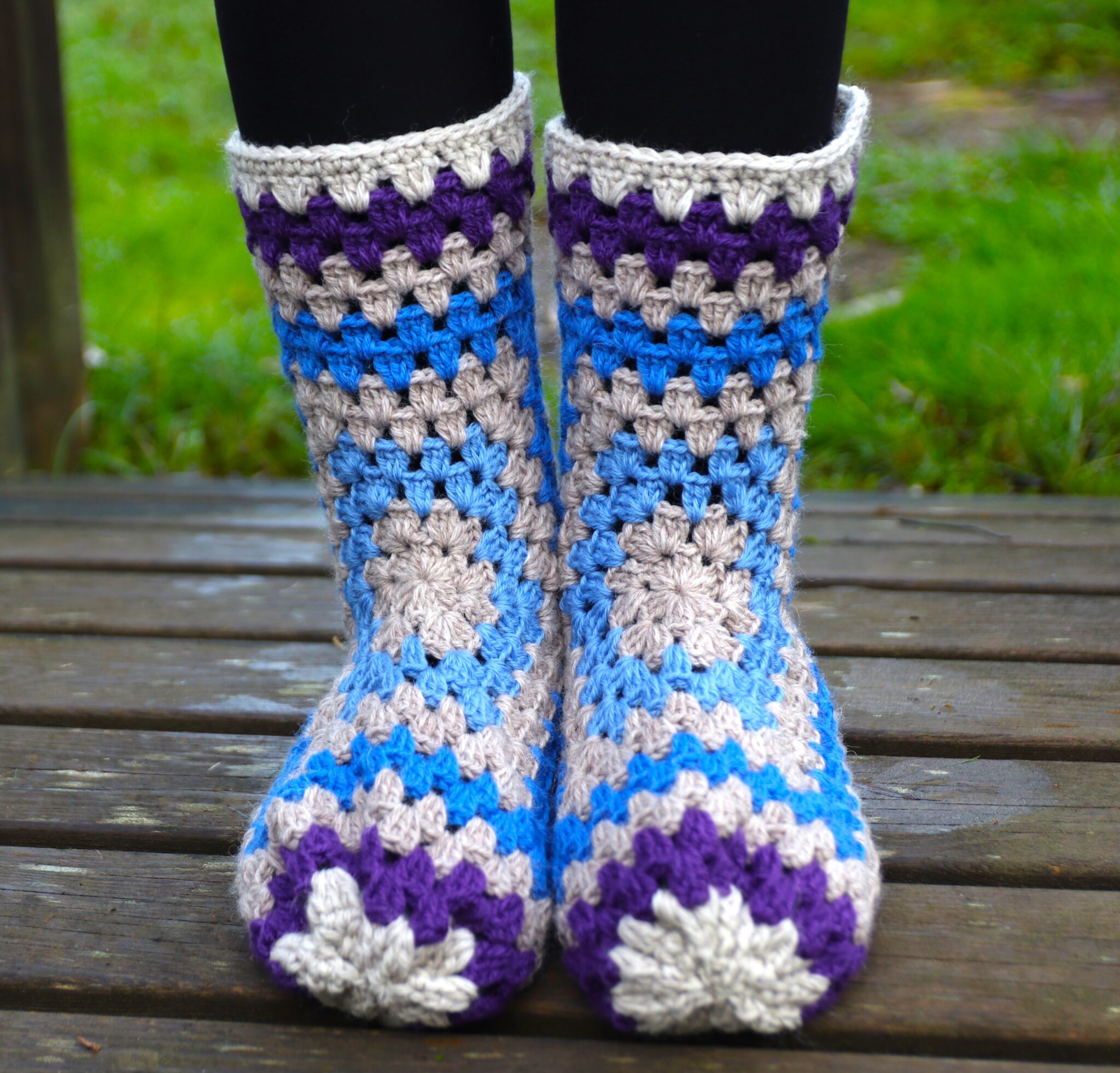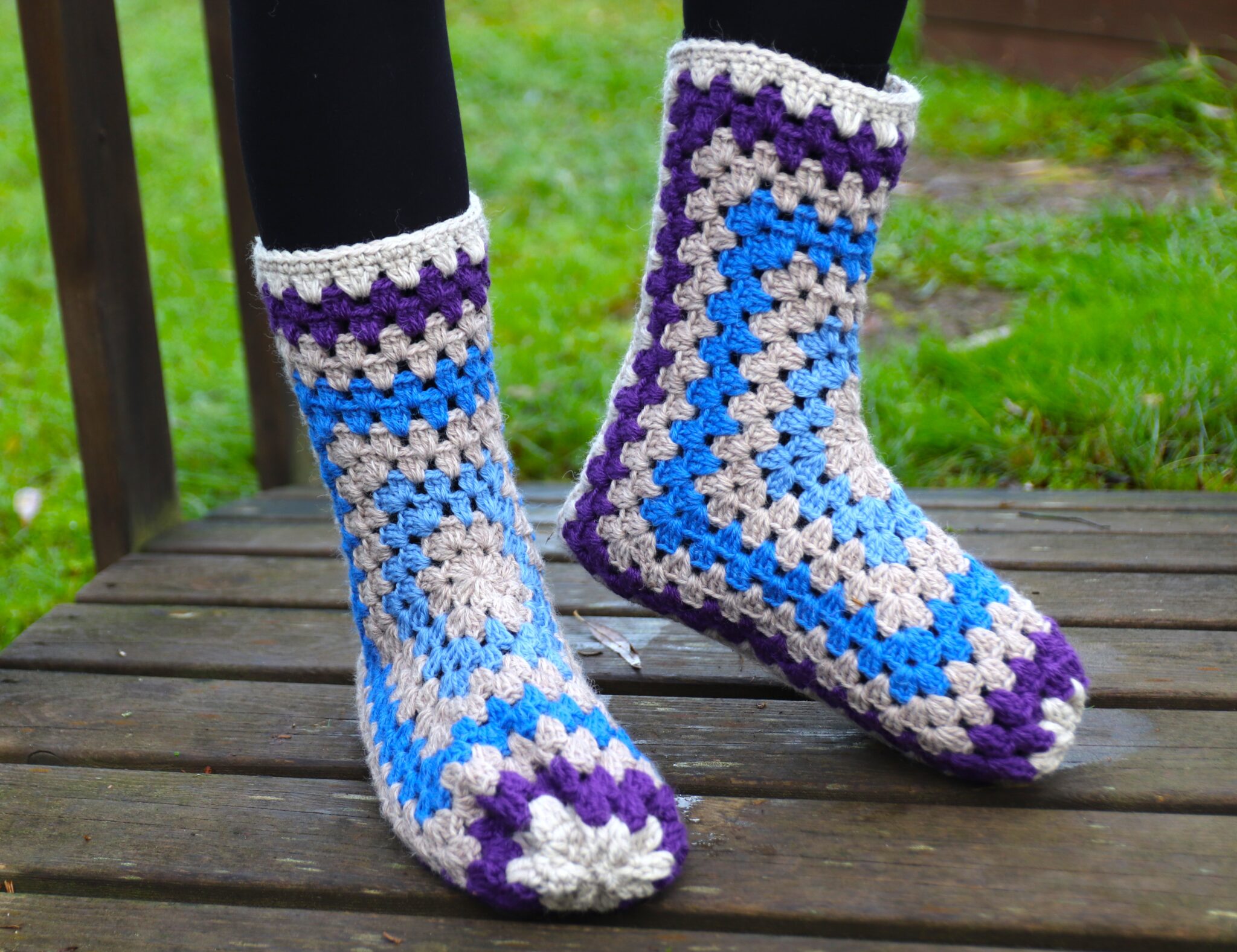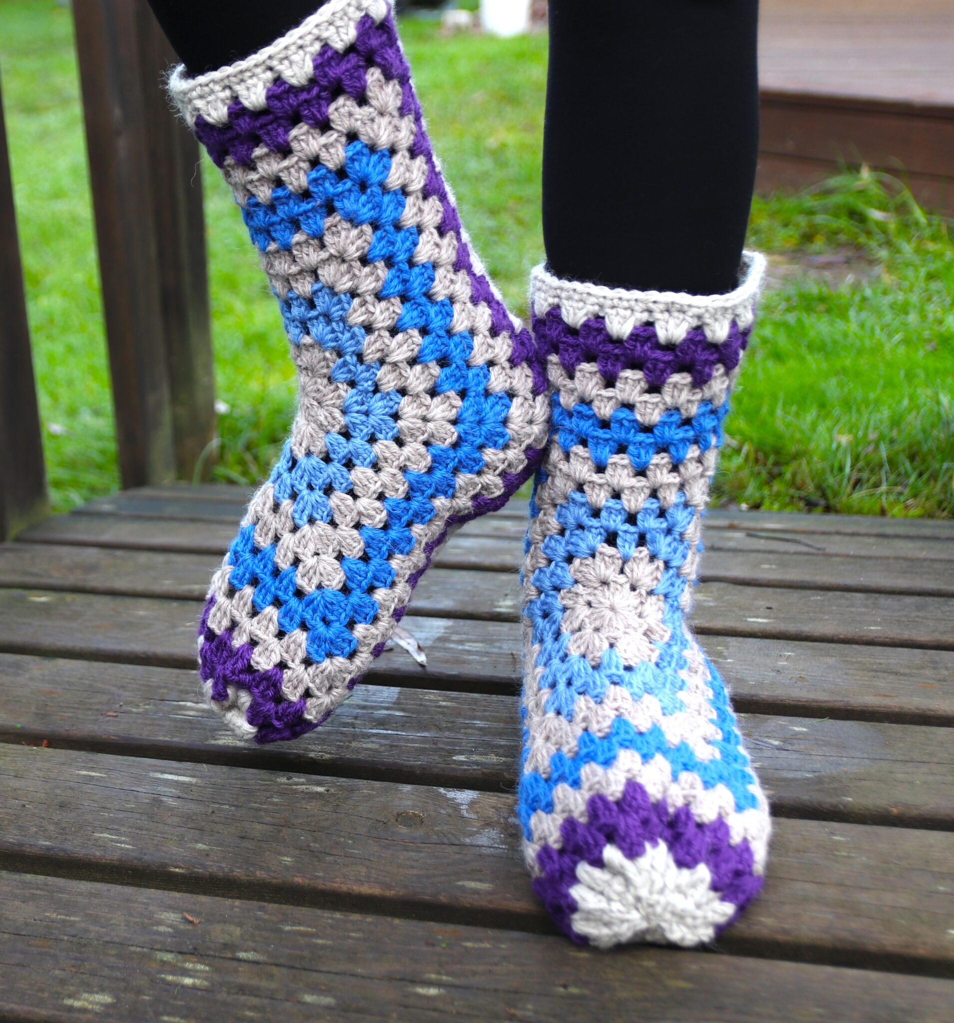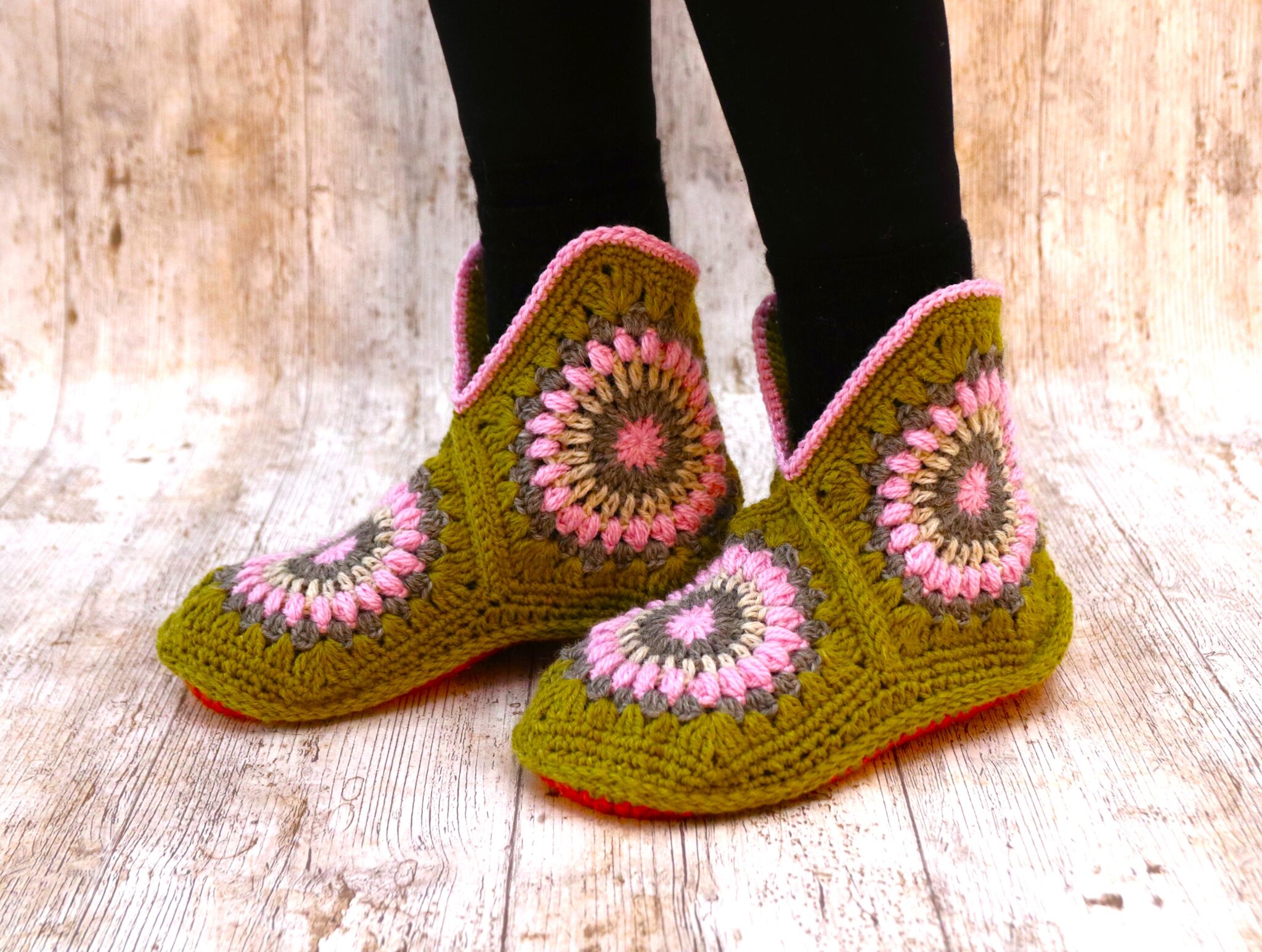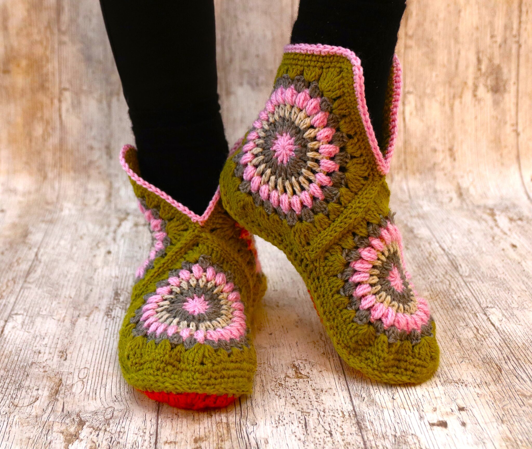 Okei, koska käytössä on ns. isoäidinneliötekniikka, tossuista tulee väkisinkin vähän reikäiset. Eivät siis ehkä sellaisinaan sovellu paljaaseen jalkaan (voisin ainakin kuvitella…), mutta siis tavallisen sukan päälle lämmittämään – tai jos on jotkut perustossut, joiden päälle pukea nämä niin onhan lopputulos huomattavasti kivamman näköinen! 😊