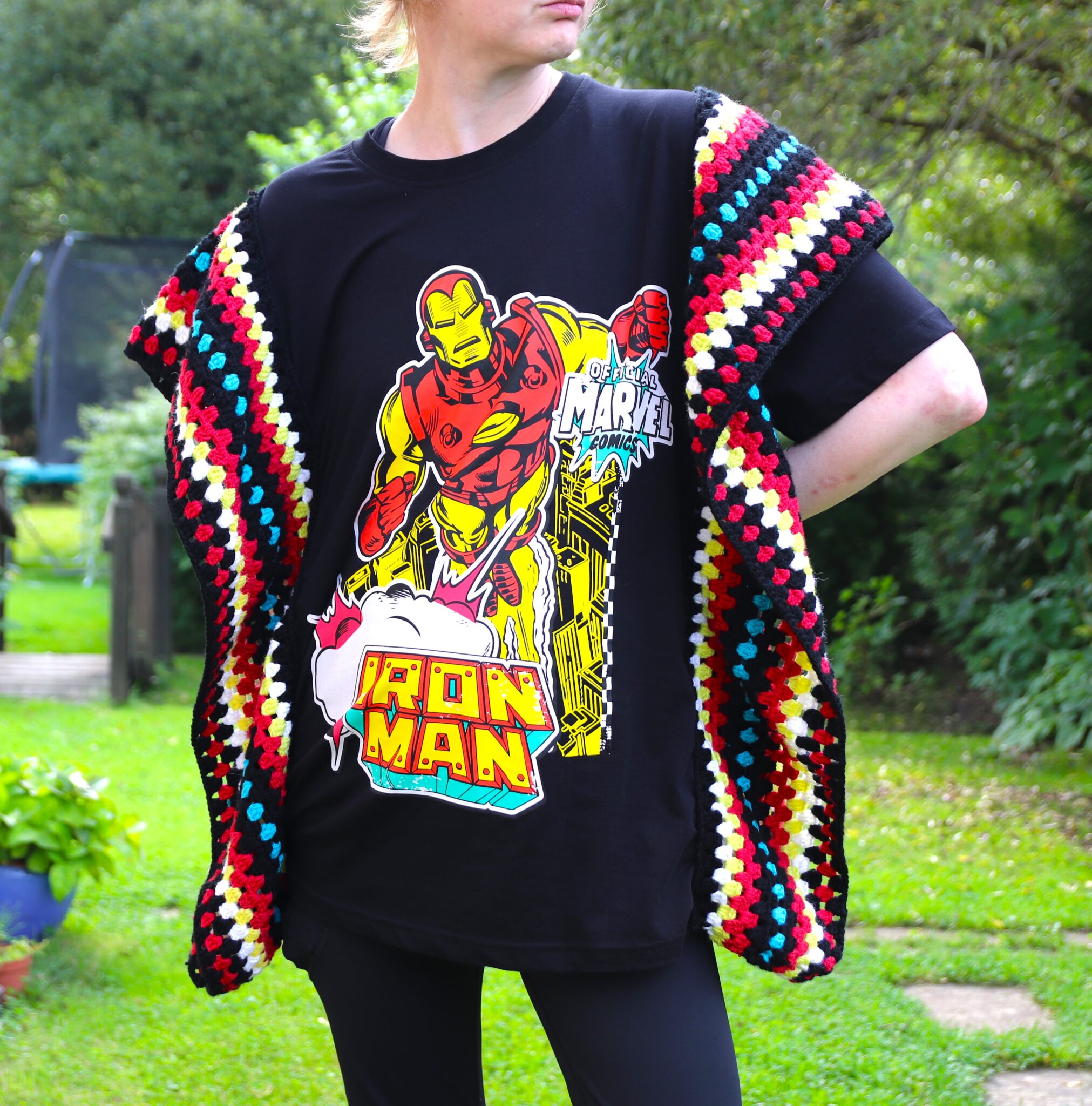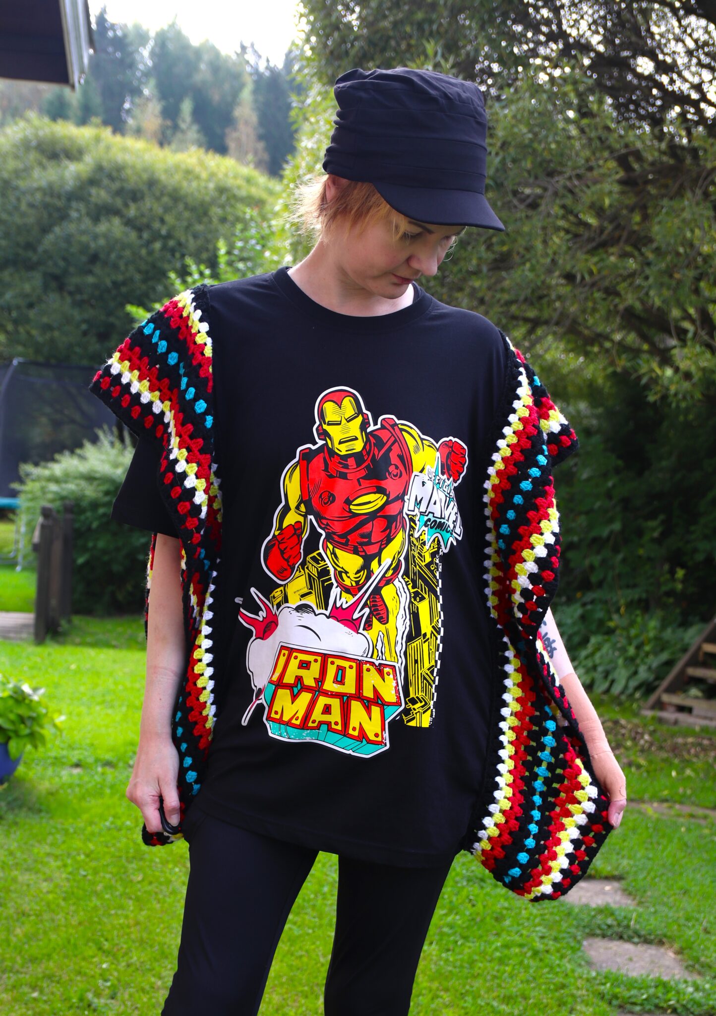 Sitten siihen ohjeeseen. Helppoon sellaiseen. 😊 Parhaiten tähän virkkausprojektiin sopisi varmaan joku (kulahtanut) bändipaita. No itseltäni ei sellaisia löytynyt, joten ostin kaupasta sen minkä löysin (järkevään hintaan). 😊 Ja se nyt sattui olemaan miestenosastolta Iron Man -t-paita. Mutta hei; kivat värit eikö? 😊