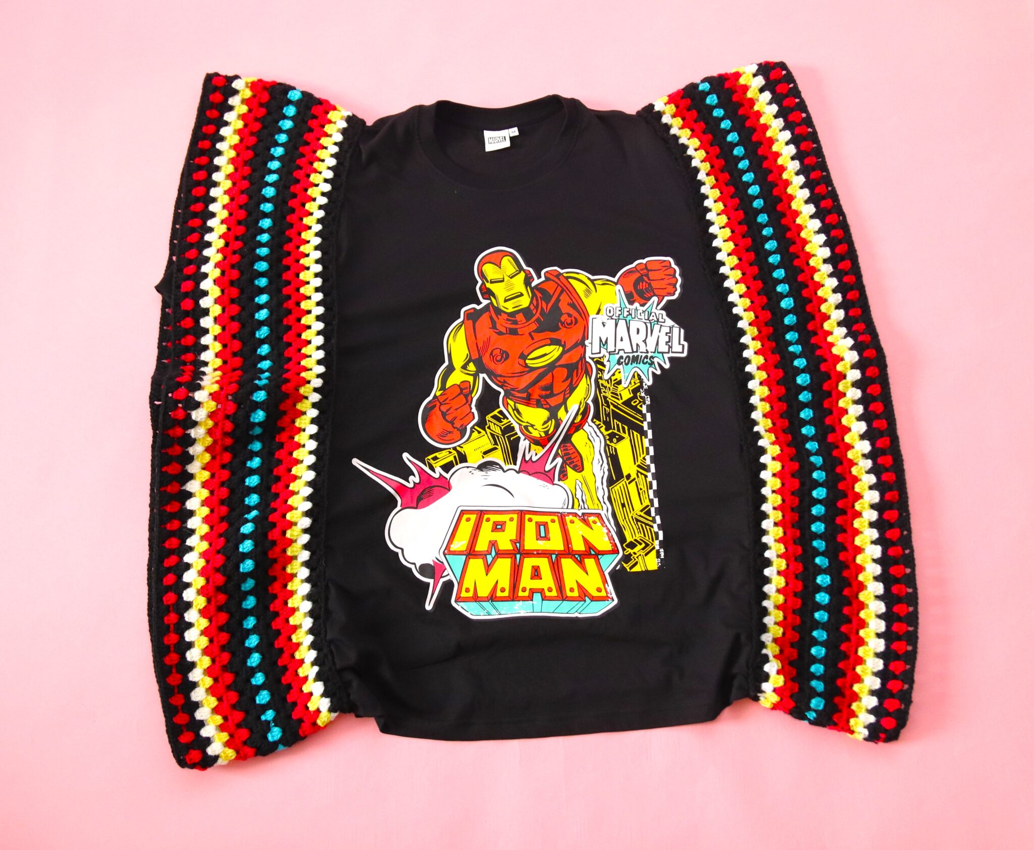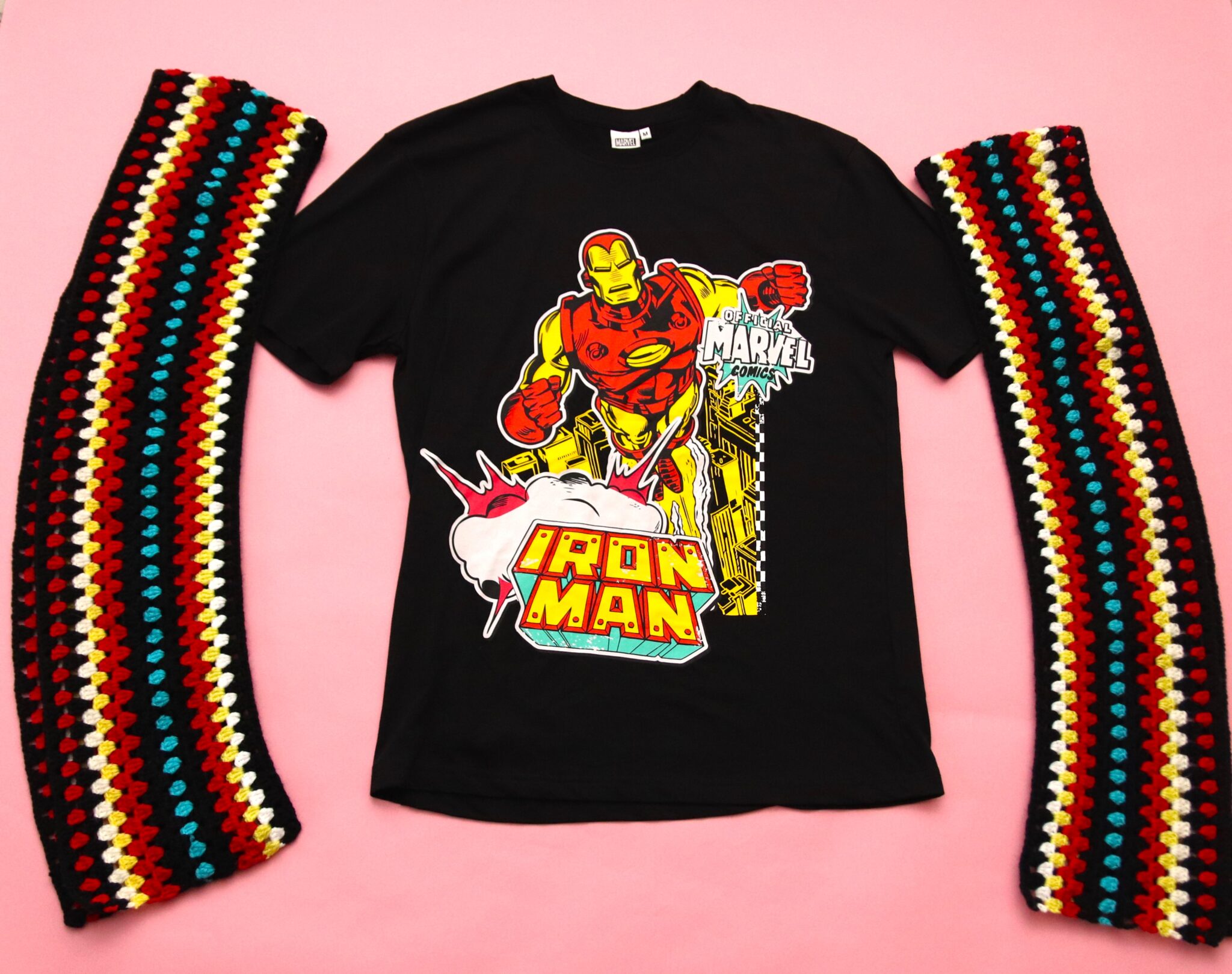 Sitten siihen ohjeeseen. Helppoon sellaiseen. 😊 Parhaiten tähän virkkausprojektiin sopisi varmaan joku (kulahtanut) bändipaita. No itseltäni ei sellaisia löytynyt, joten ostin kaupasta sen minkä löysin (järkevään hintaan). 😊 Ja se nyt sattui olemaan miestenosastolta Iron Man -t-paita. Mutta hei; kivat värit eikö? 😊