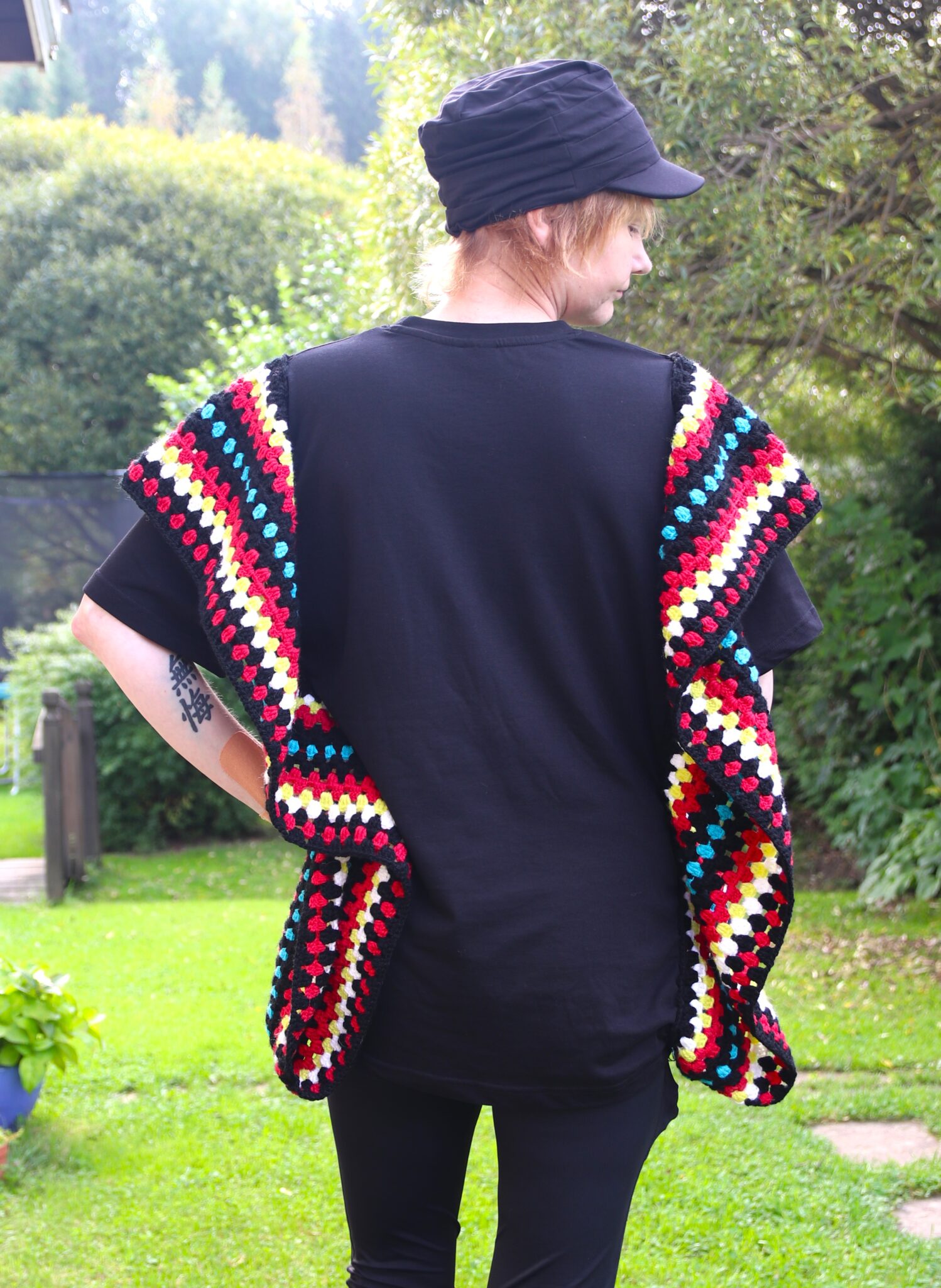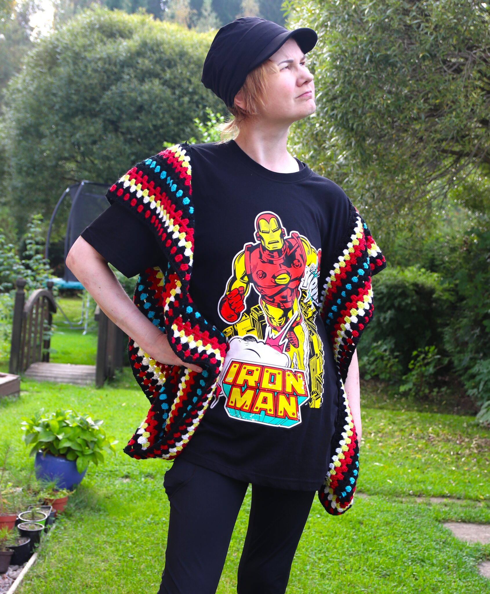 Niin, että anteeksi mikä? 😊 Milloin tällainen ilmiö astui parrasvaloihin? Kuka keksi, että t-paidan hihat voi ”korvata” virkkaamalla niihin pylväitä ”isoäidinneliö-tyyliin”? Jossain näitä kutsutaan jopa ”virkatuiksi t-paita ponchoiksi”. 😊 Jos siis haluat etsiä lisää tietoa ja kuvia tuunatuista t-paidoista isoäidin tyyliin, niin käytä vaikka hakulauseita ’crocheted t-shirt poncho’ tai ’t-shirt with granny square sleeves’.