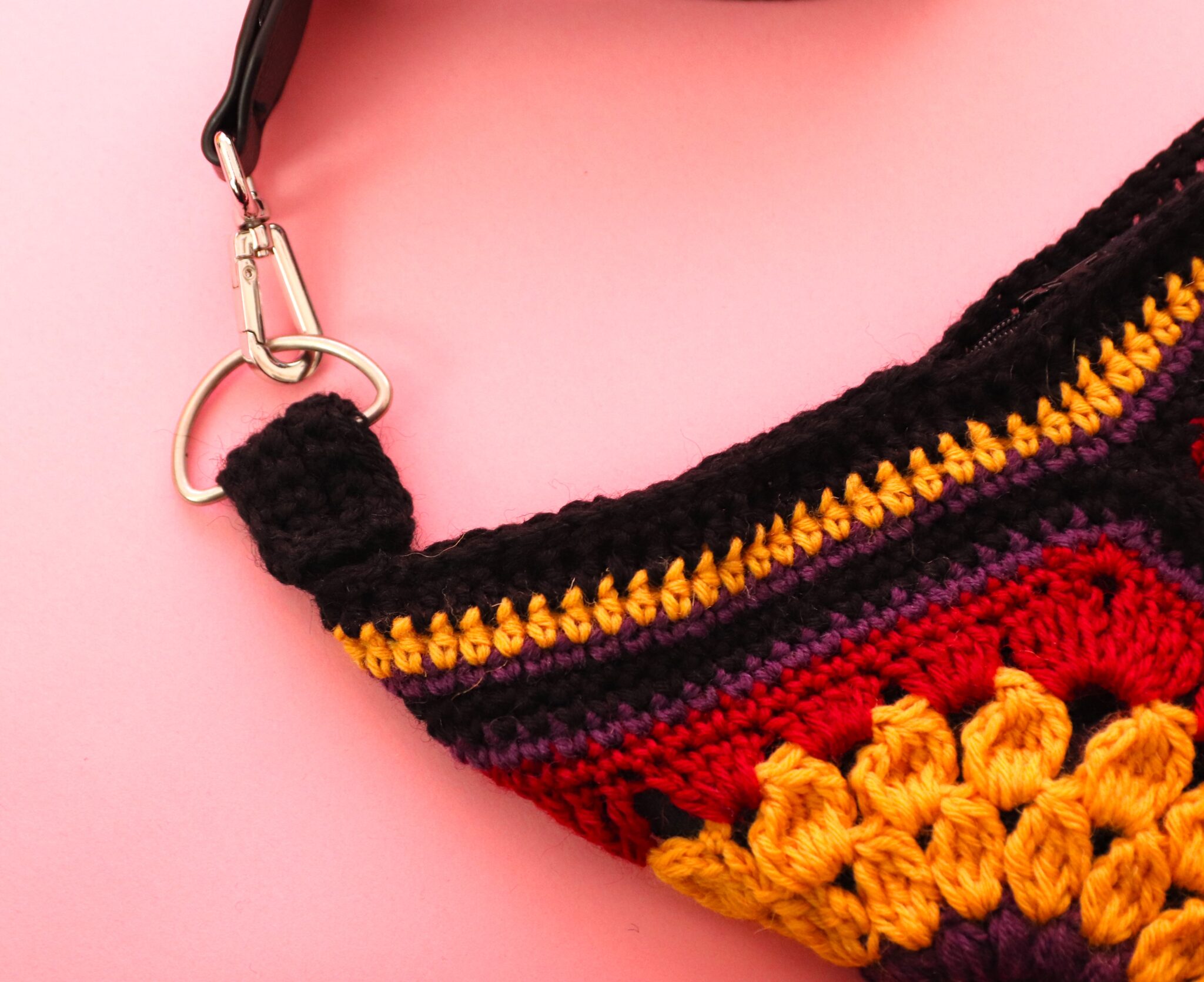 Koska tilasin valmiin olkahihnan, on jäljellä enää metallisten d-renkaiden kiinnitys. Valmis olkahihna on näppärä kiinnittää lopuksi niihin. D-renkaita varten virkkasin pienet ”kaistaleet”, joihin pujotin d-renkaat. Virkkaa 10 kjs, käänny takaisinpäin ja virkkaa 5-6 kerrosta tai oman d-renkaasi tasaisen reunan mittainen pätkä. Asettele d-rengas kaistaleen sisään ja ompele käsin kiinni. Kiinnitä molemmat kaistaleet d-renkaineen kumpaankin vyölaukun päätyyn kuvan mukaisesti. Sitten vaan olkahihna kiinni ja ollaan valmiita kesän tuloon! 😊